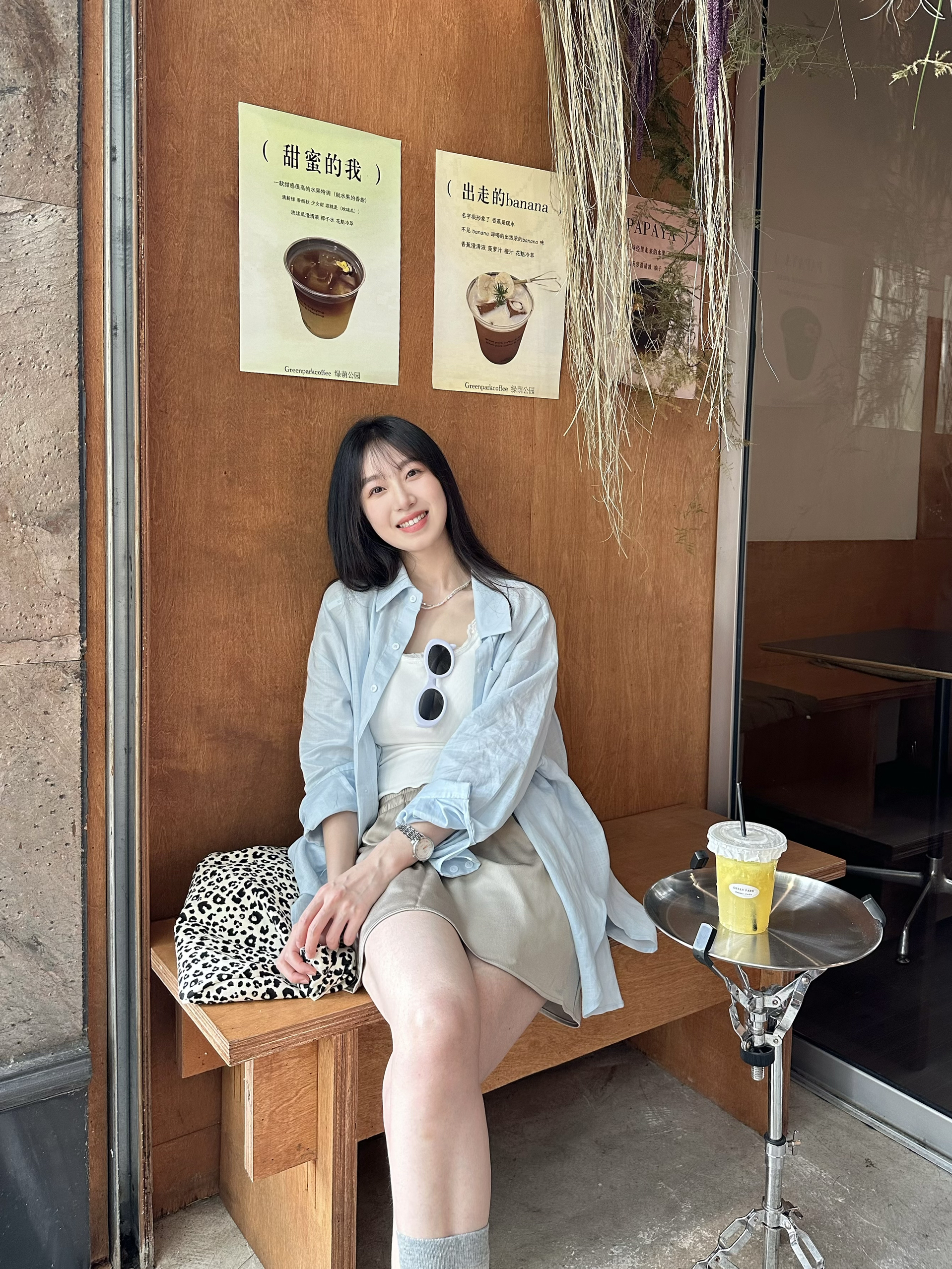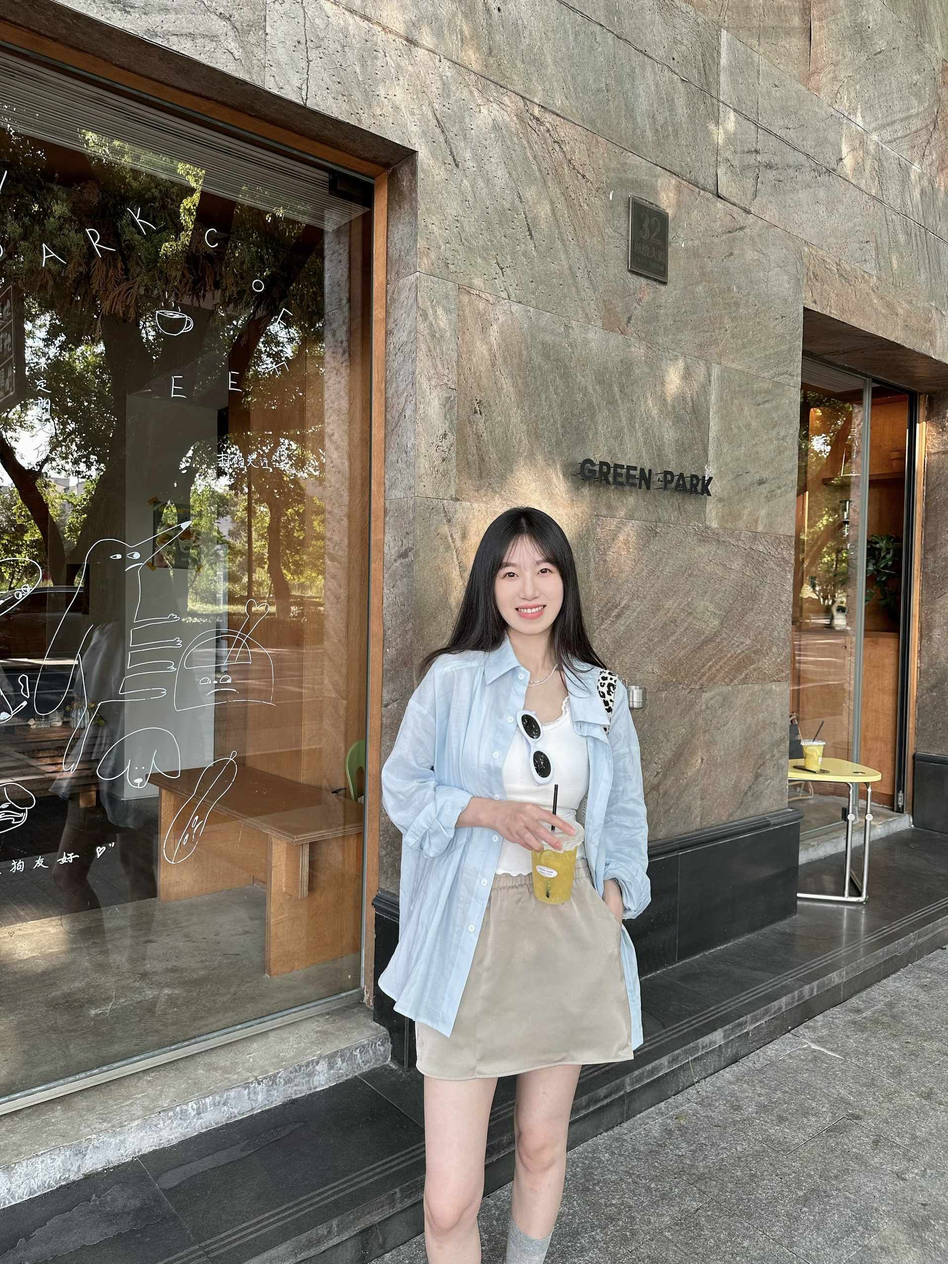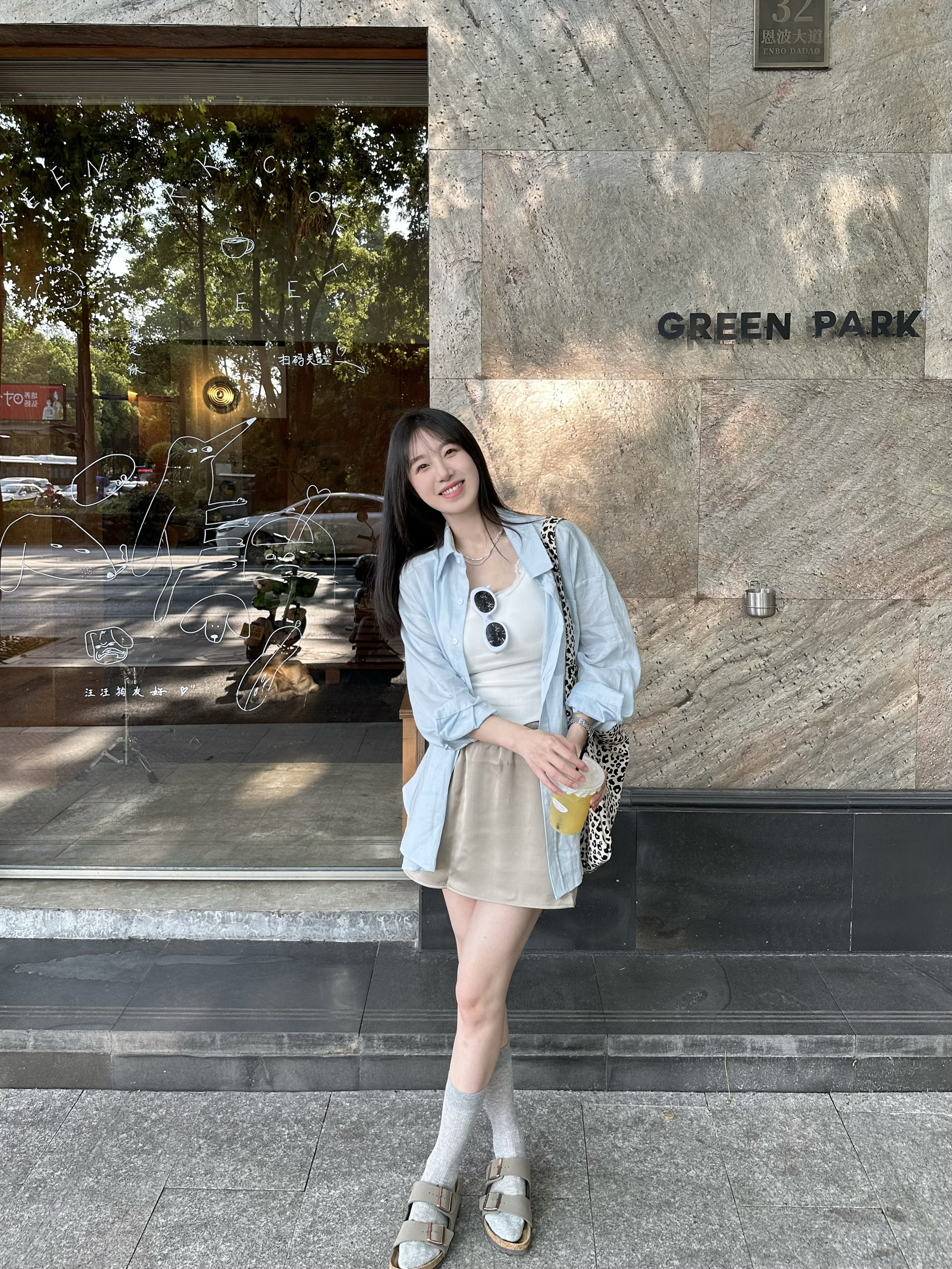 蓝衬衫搭配香槟色半裙好高级 让人眼前一亮的感觉 夏天衬衫真的穿不腻