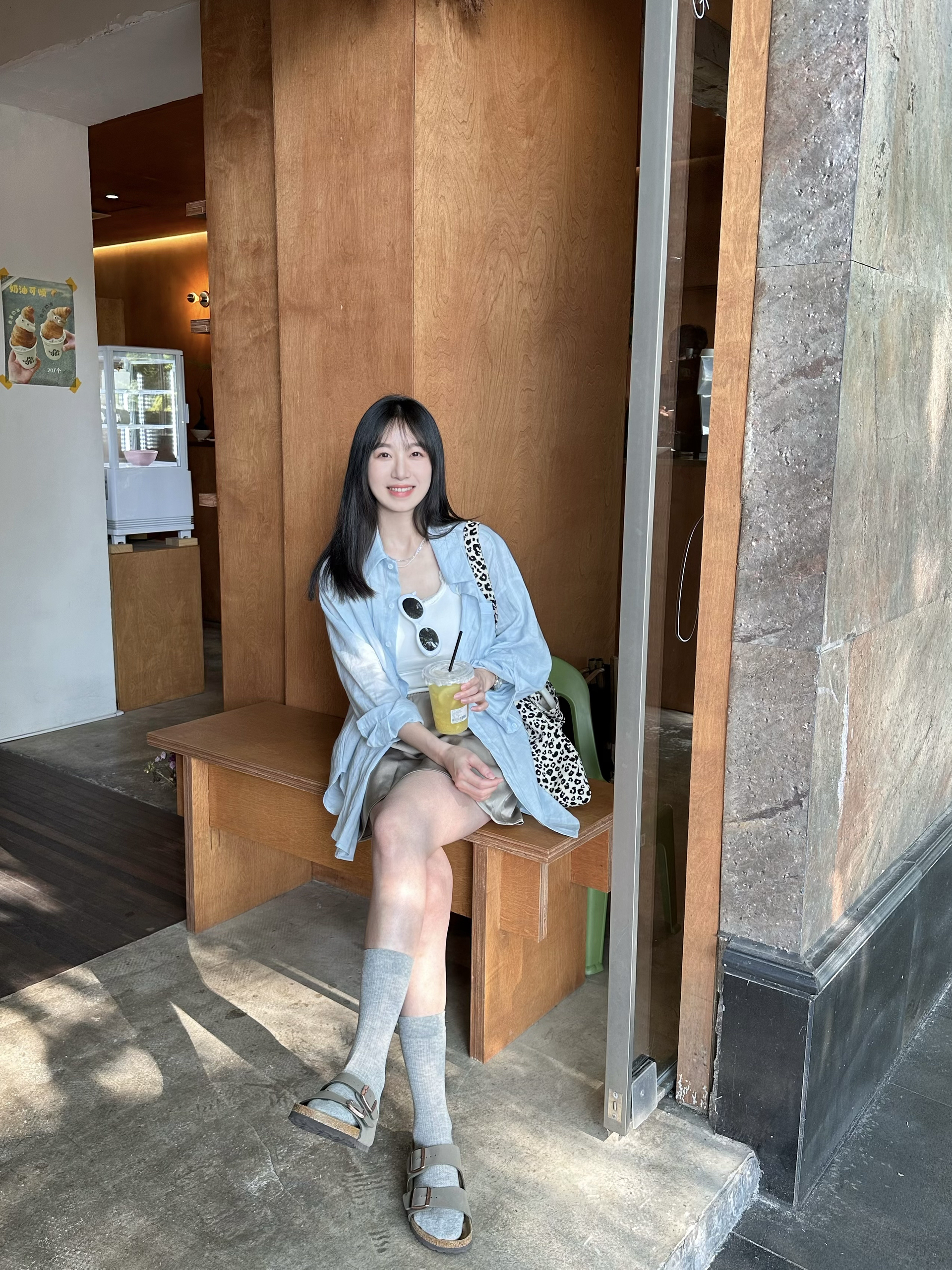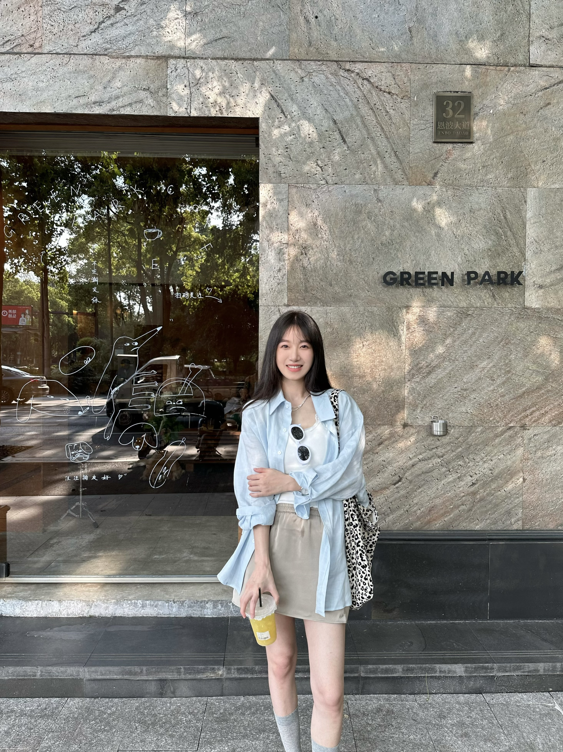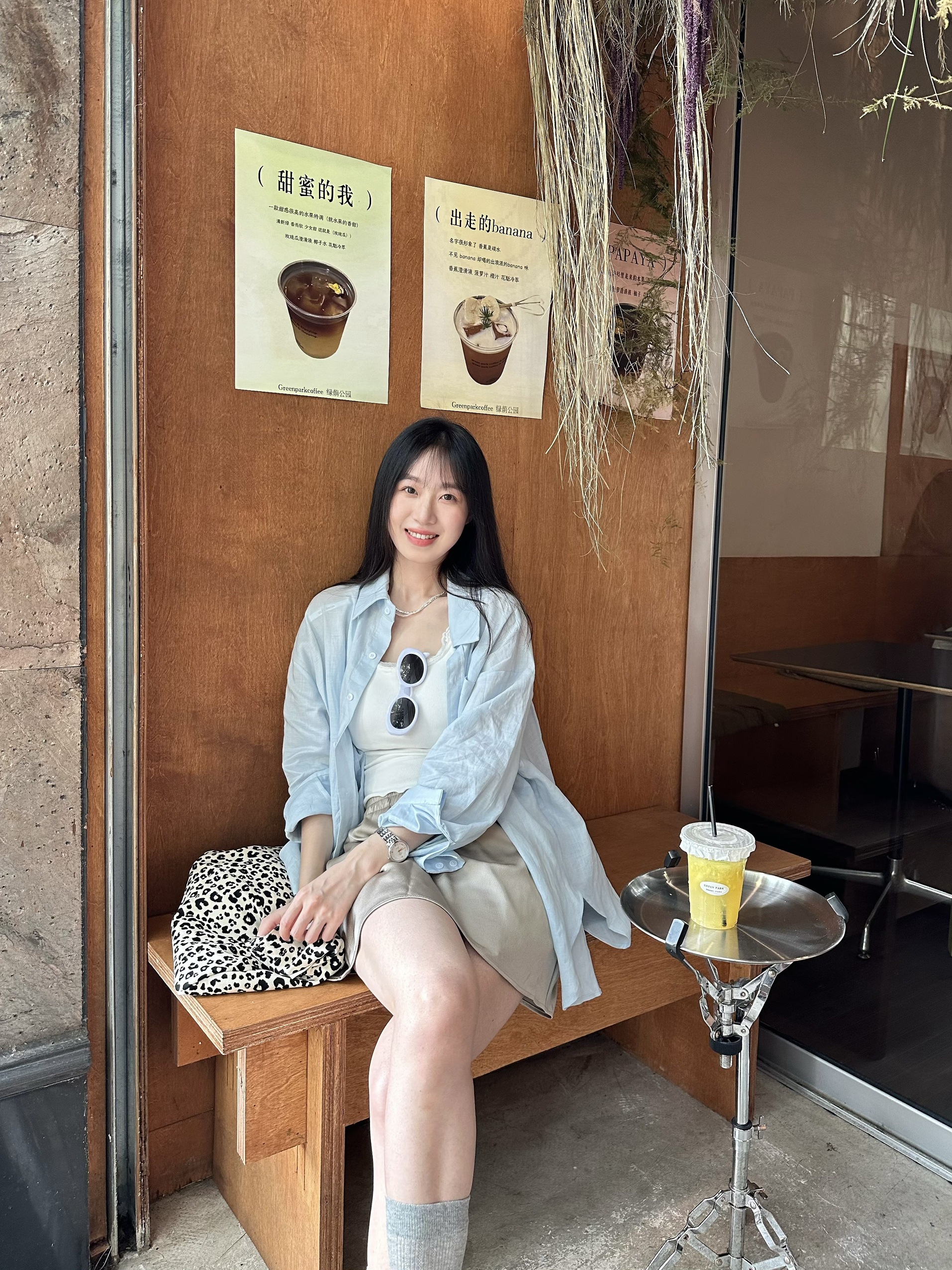蓝衬衫搭配香槟色半裙好高级 让人眼前一亮的感觉 夏天衬衫真的穿不腻