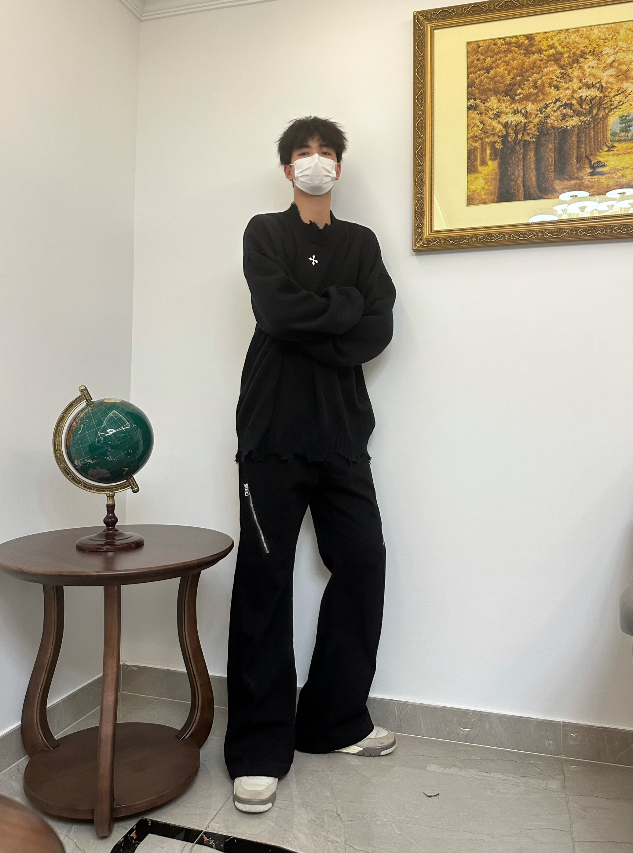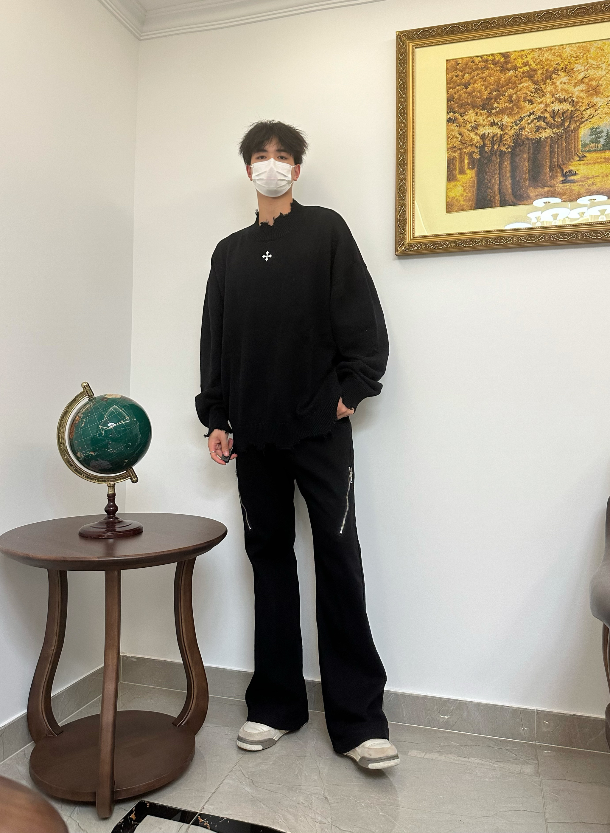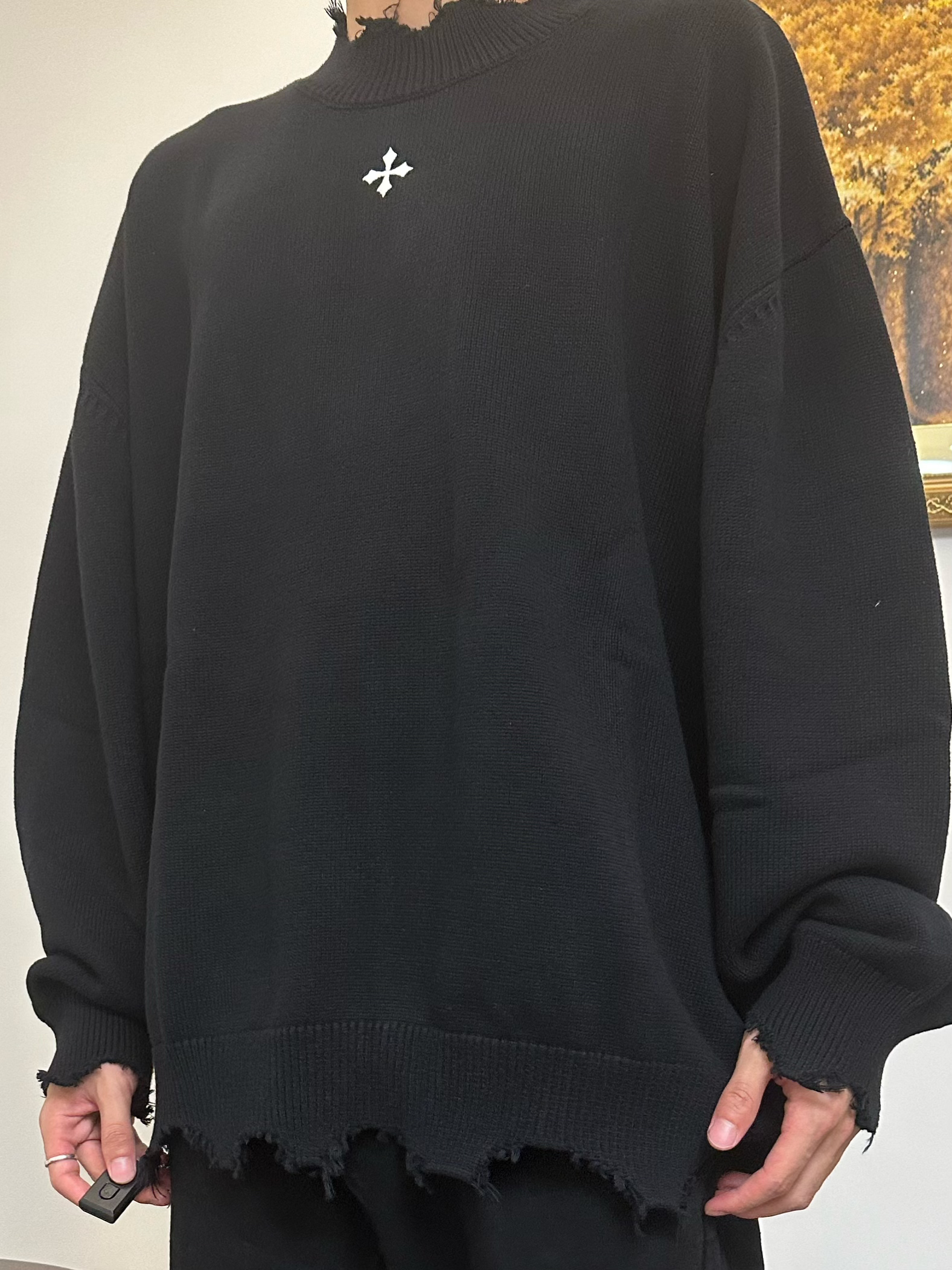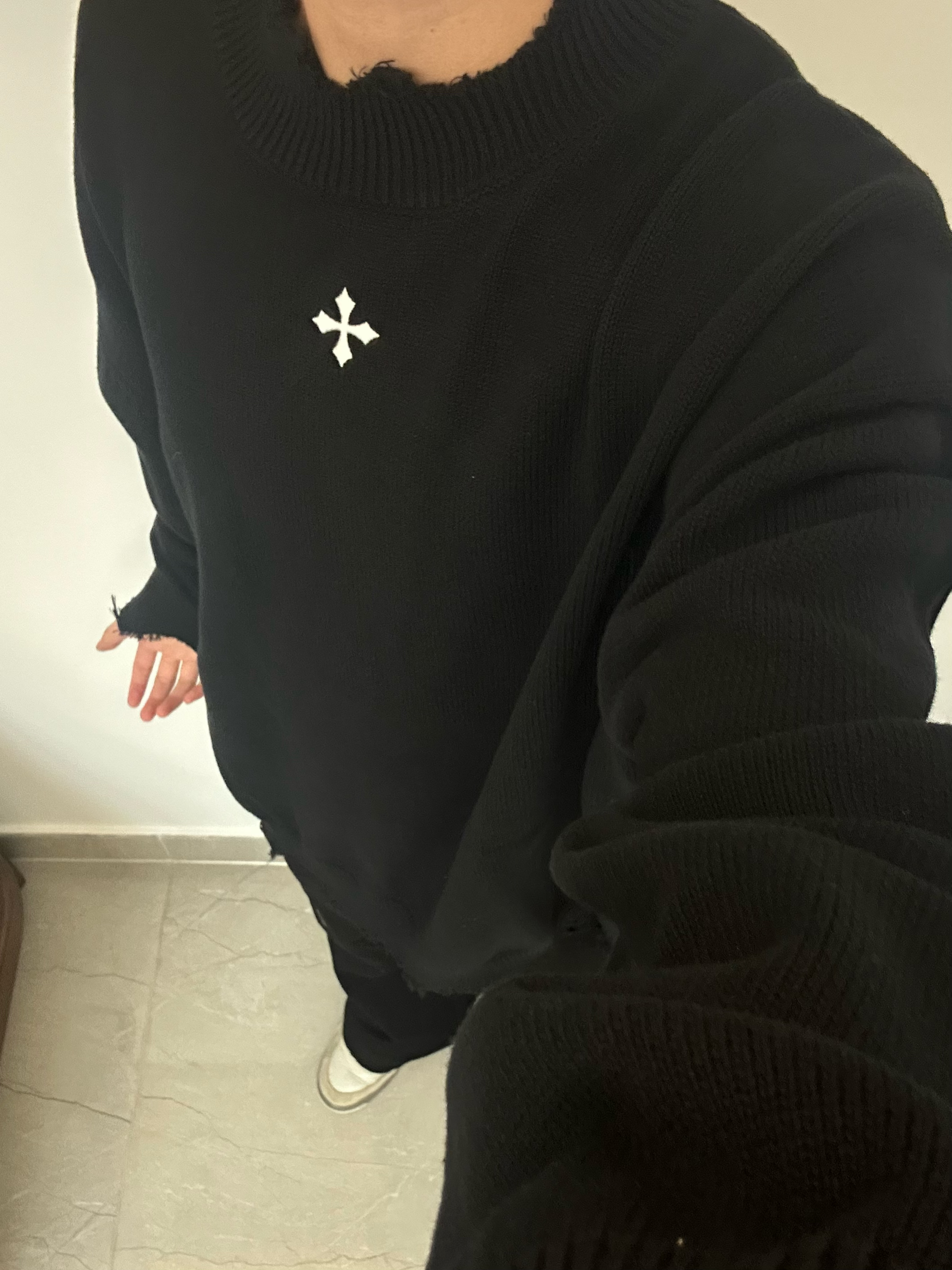 👔 CLIMAX VISION 十字系列刺绣下摆套头毛衣 这波直接入秋 我已经准备好毛衣了😍 穿着绒绒的好舒服 领口和下摆主打一个破坏风 胸口的十字架Logo黑白分明 拿捏秋冬氛围感 👖 Voguo Relay 小众斜拉链牛仔裤 👟 Air Jordan 4 灰兔子 本人 185/75 👔 xl 👖 xl