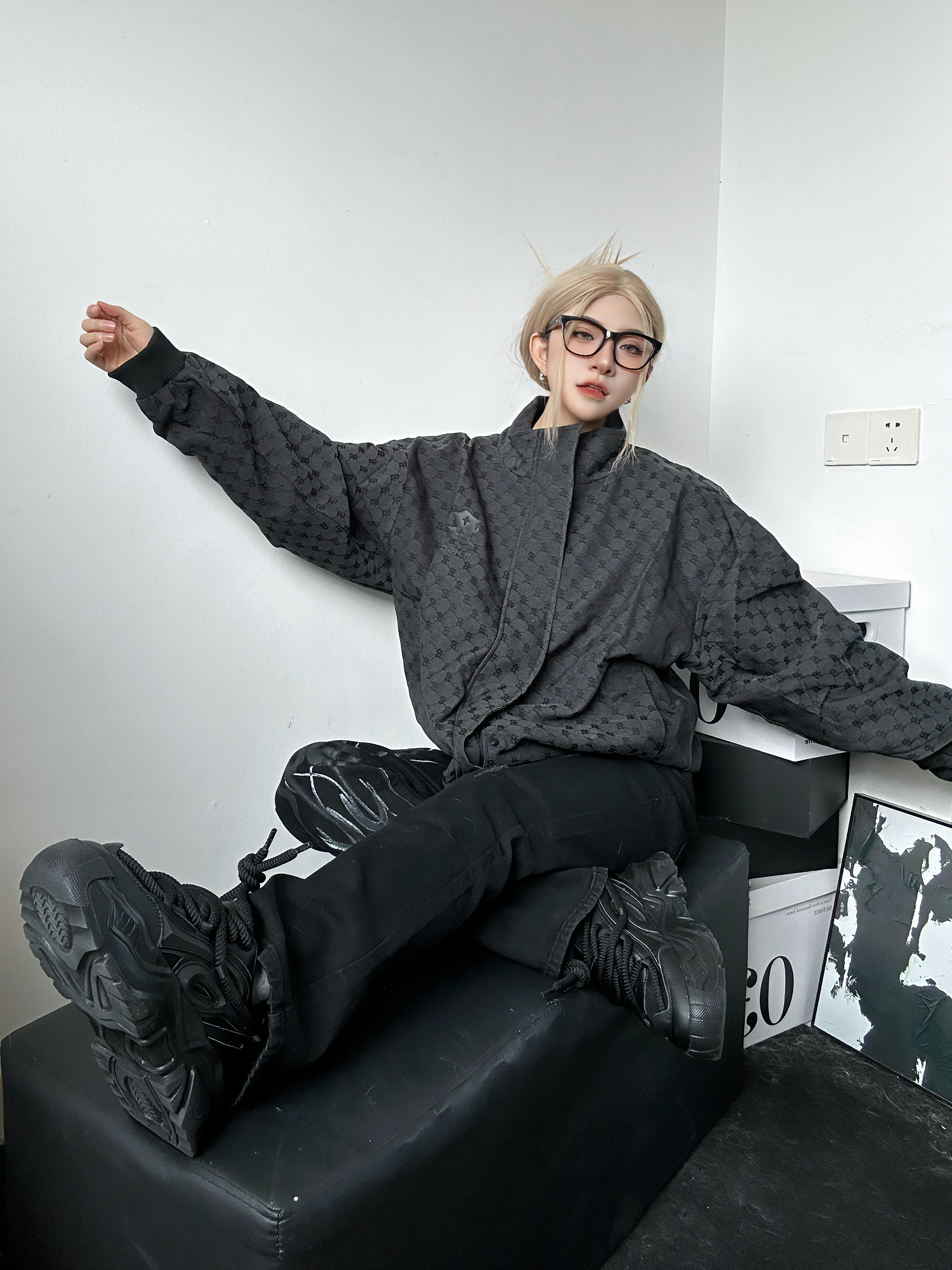 今日穿搭分享 上身黑色满印外套来自BJHG 看花设计复古感十足 立领设计也是安全感满满 属于是初秋必备外套啦~ 搭配一条黑色百搭工装裤帅气逼人 一身黑进行到底 搭配上黑色系的厚底老爹鞋 allblack这套真的帅爆啰~