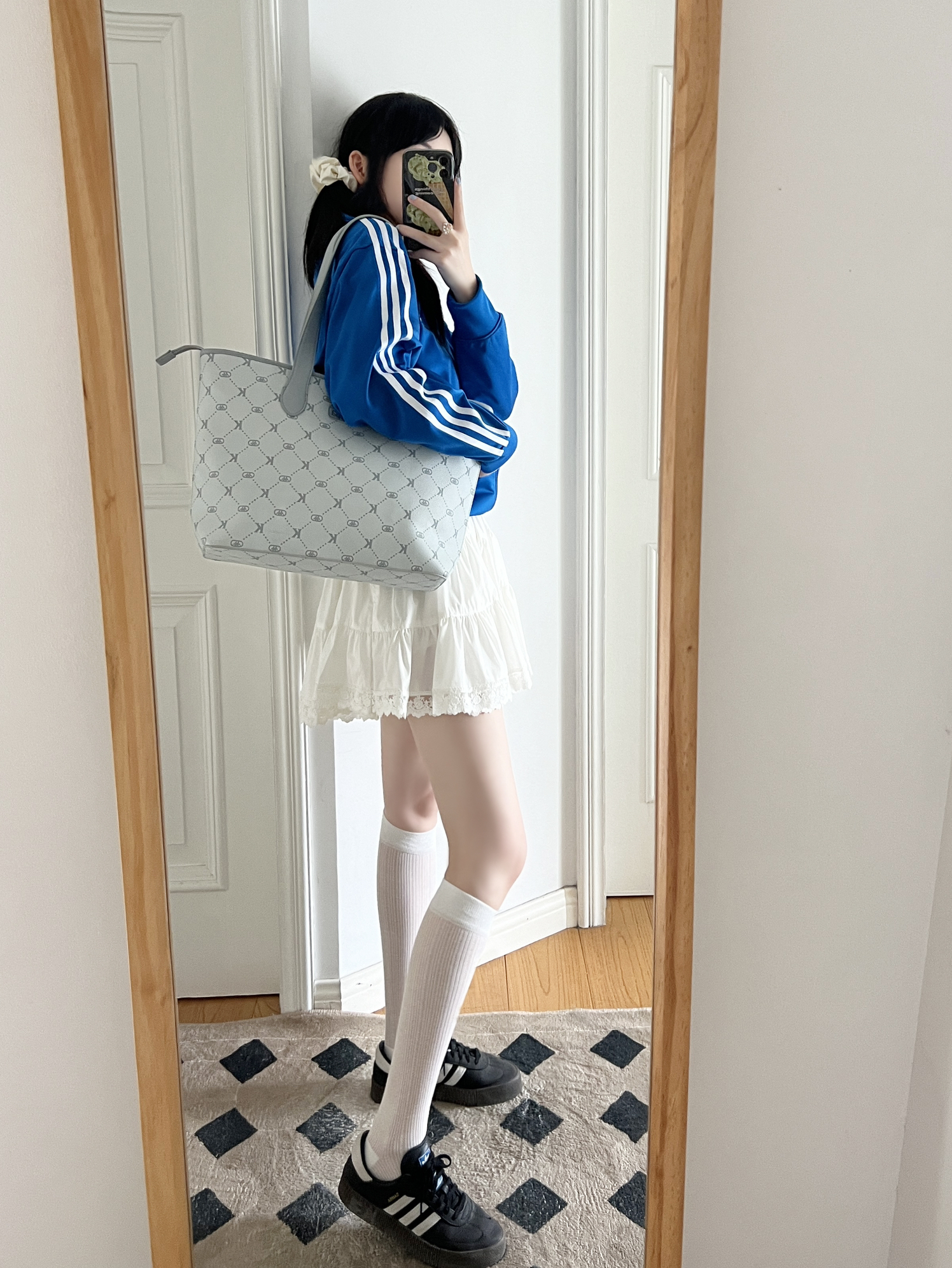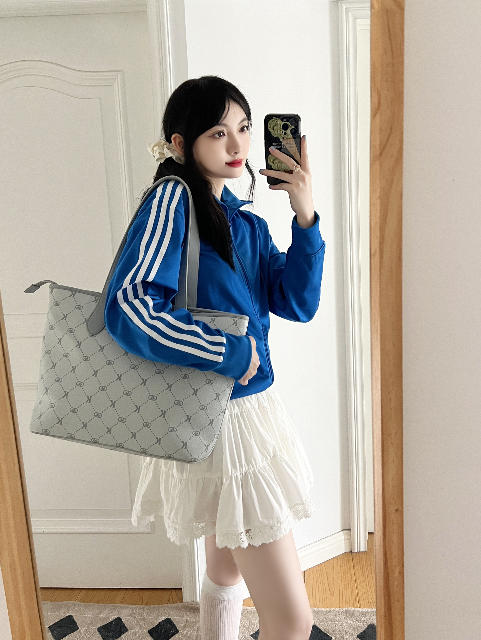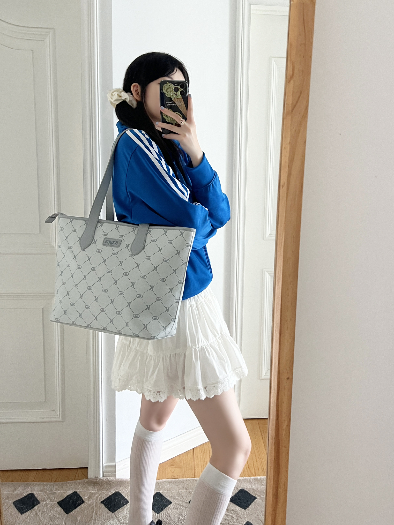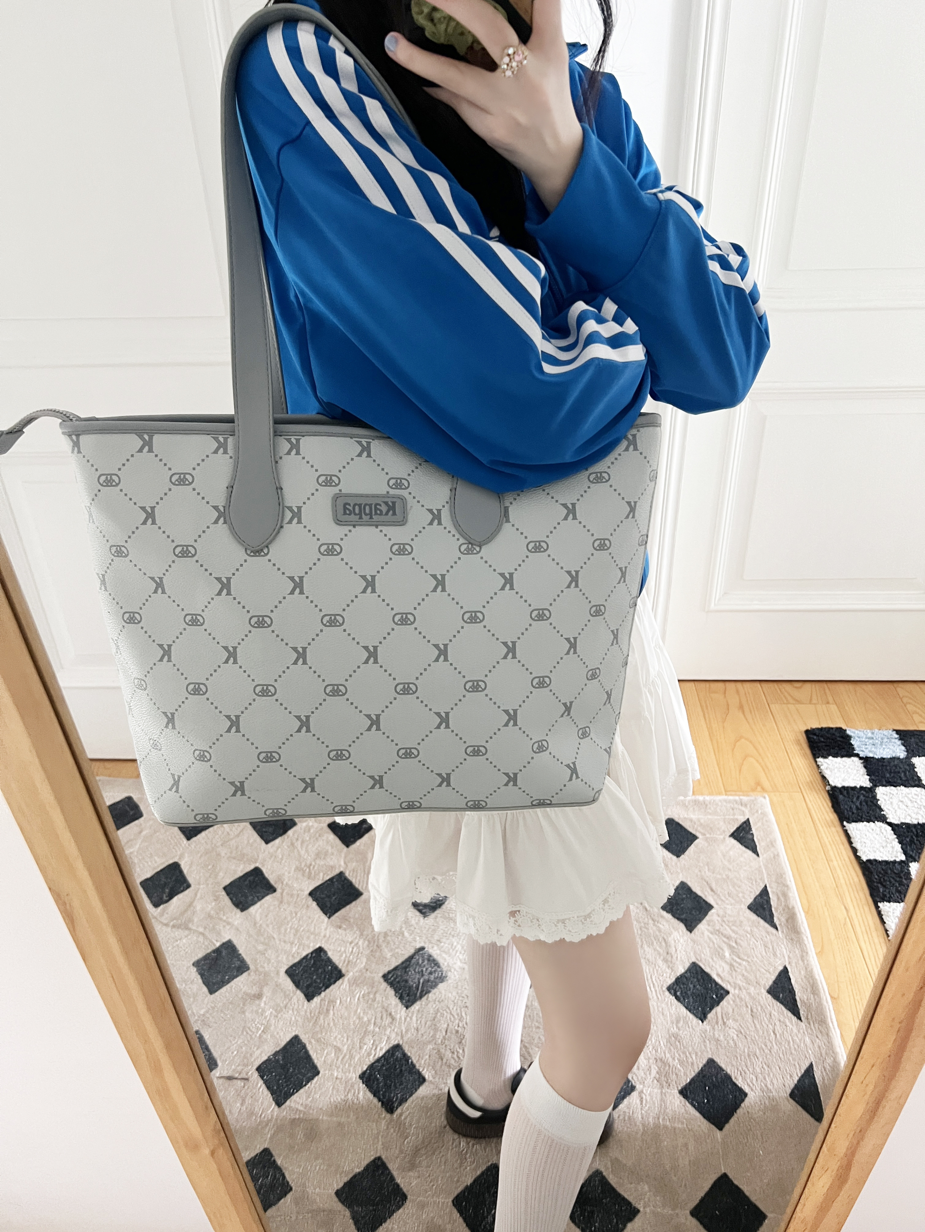 今日份的开学穿搭来啦❕ 美式复古外套⚾️➕白色蛋糕裙🍰 搭配这只新入手的kappa托特包~ 海盐薄荷灰🩶自带清冷感挺百搭的 包包的容量真的炒鸡大👀 日常的通勤💼or上课都是足够的 荔枝纹的皮面摸起来质感不错🫶🏻 尊滴是早八人友好的包包💕