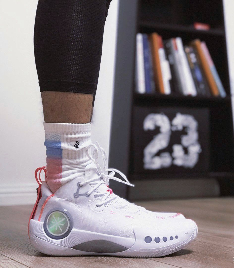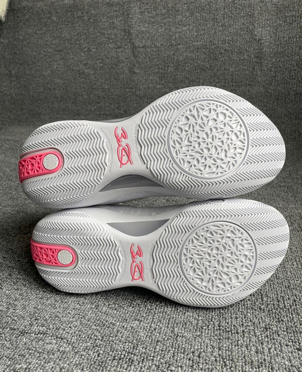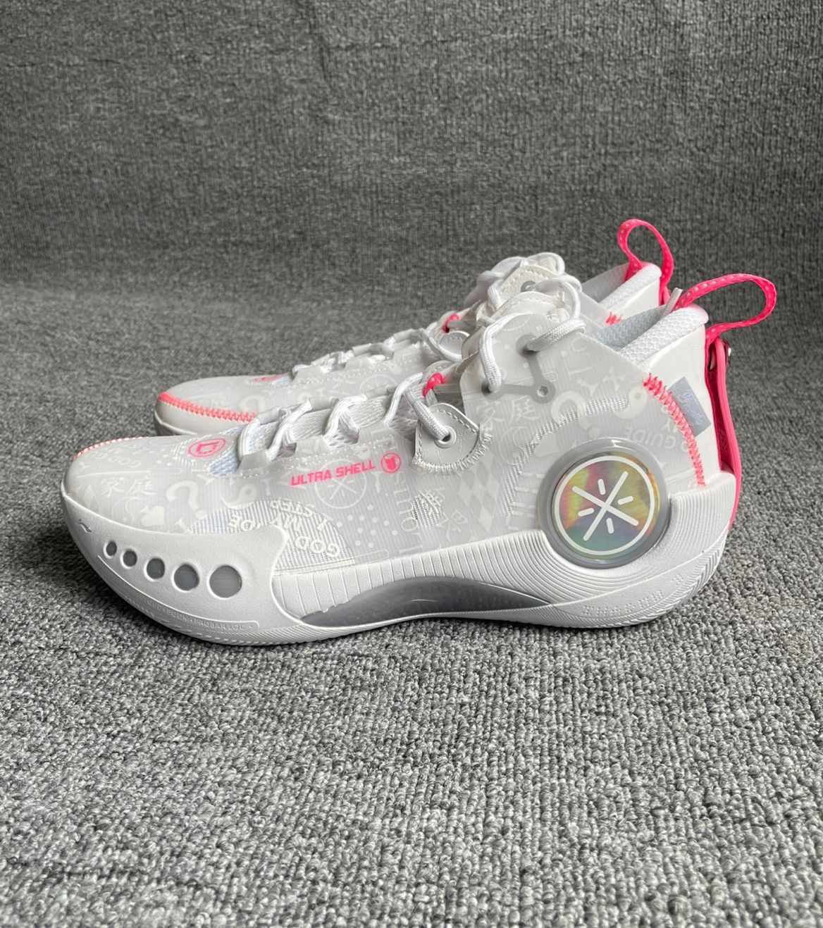 这双幻影3代是韦德之道9团队款,沿袭大量韦德之道9正代设计,该款的设计语言非常接近韦德之道9代。鞋子颜值肉眼可见的高,纯白色的鞋身+粉色细节点缀,配色简约时尚。 鞋面使用部分热压和网面材料,透气性和支撑性完全OK;缓震方面采用了前掌李宁云+后掌露,日常实战完全够用。鞋底纹路是一朵花和人字纹,抓地力不用多说~ 鞋子包裹感十足,平时李宁鞋穿什么码这个就选什么码,脚宽的朋友可以选大半码。