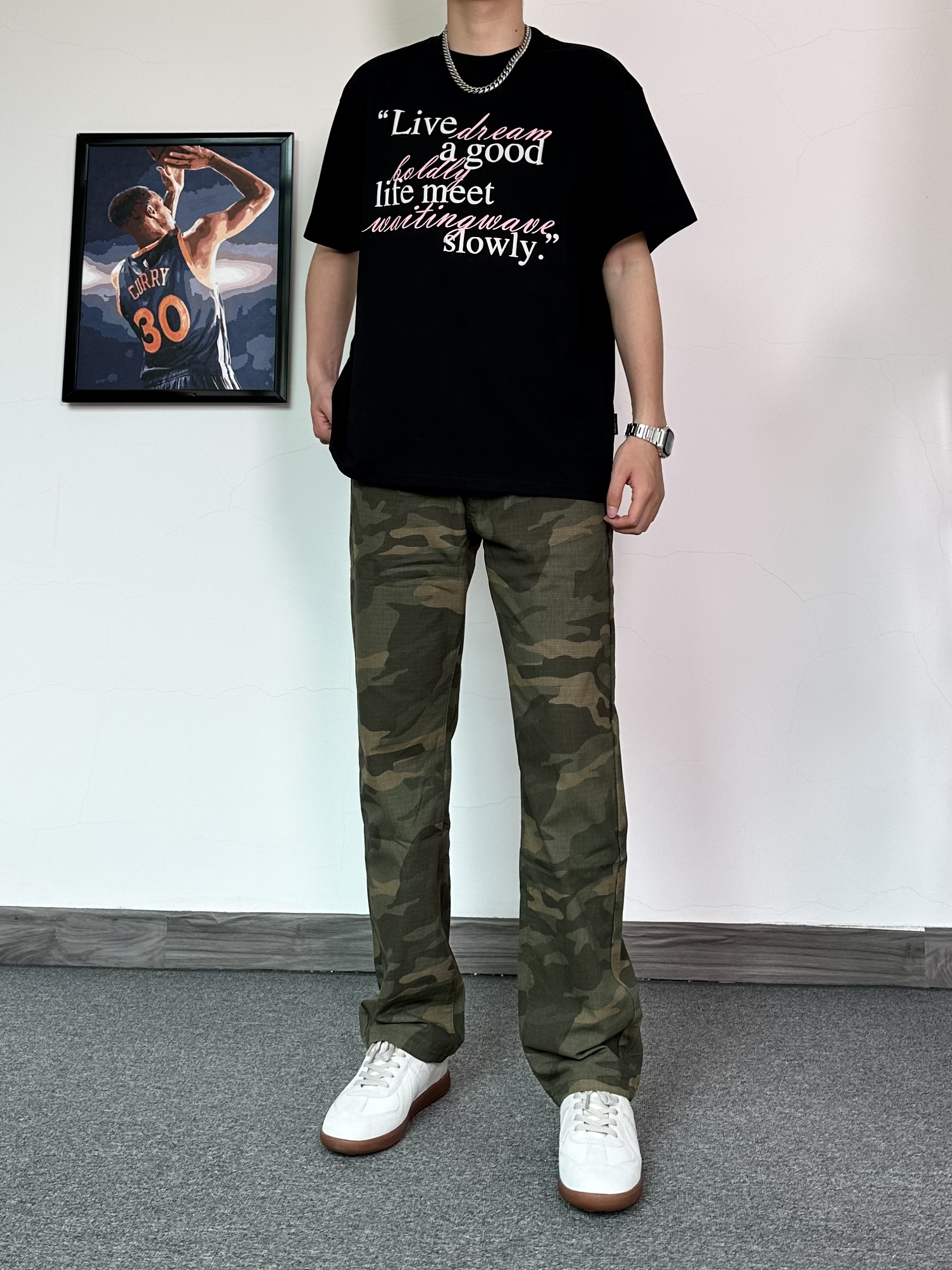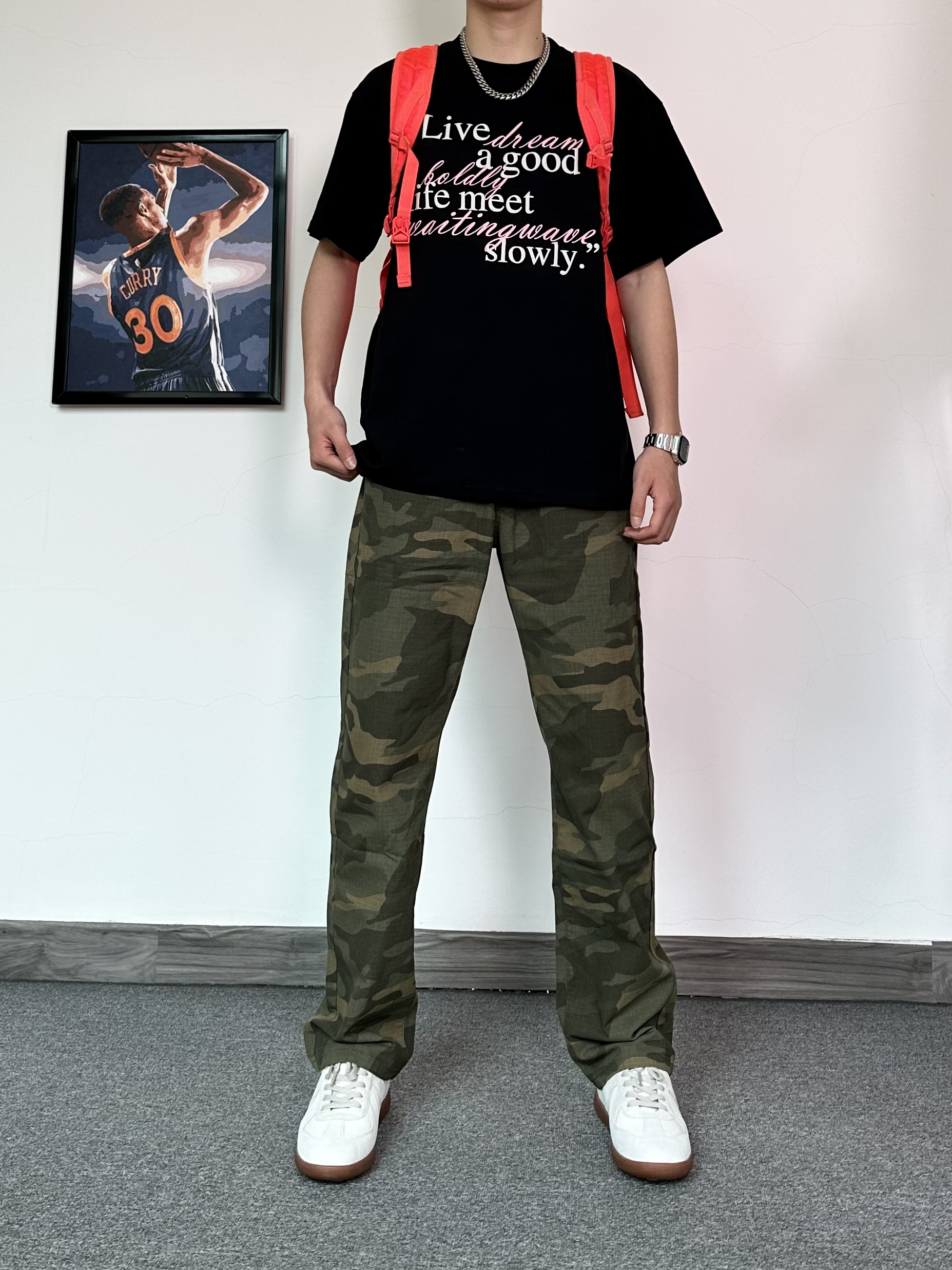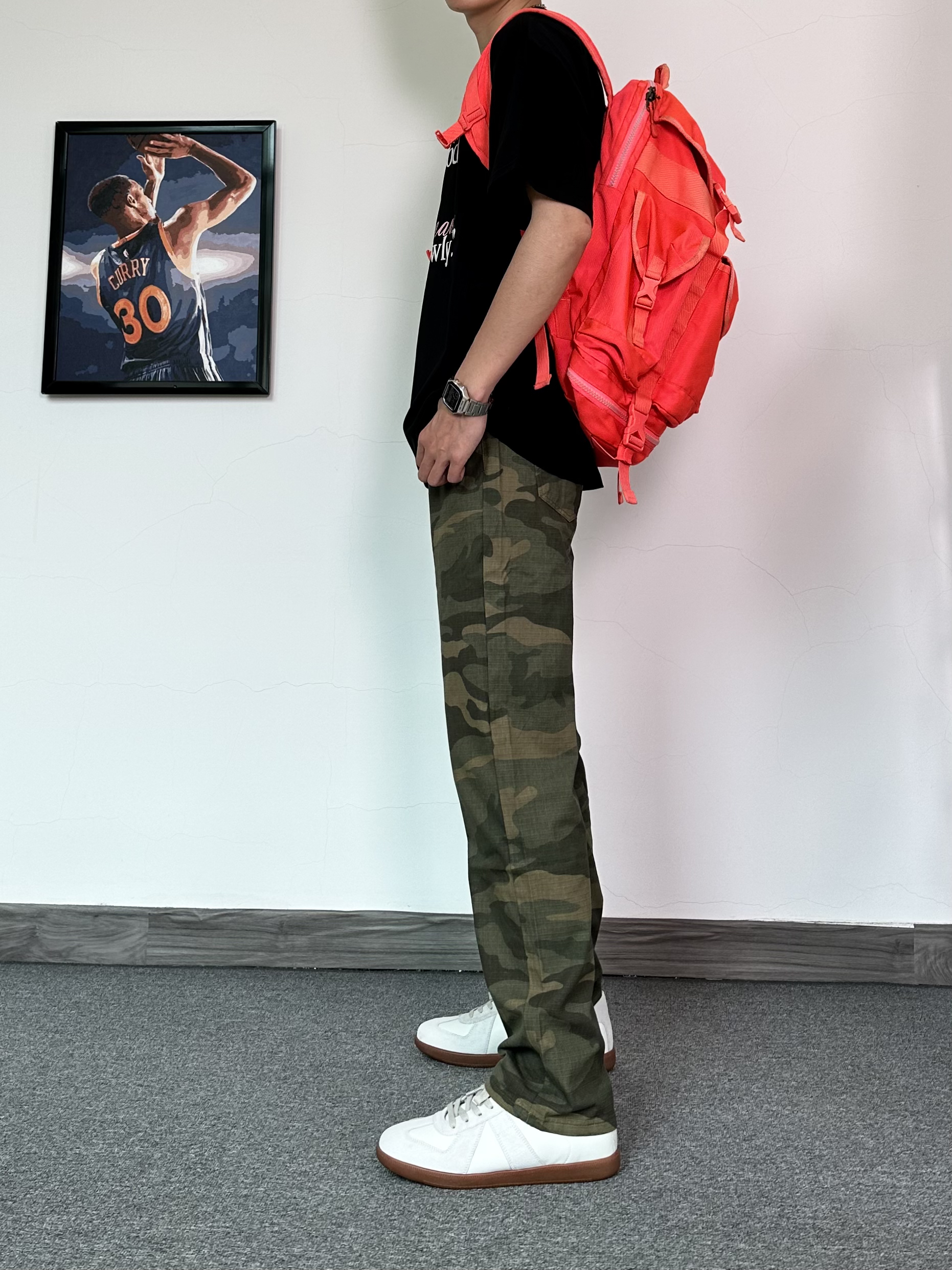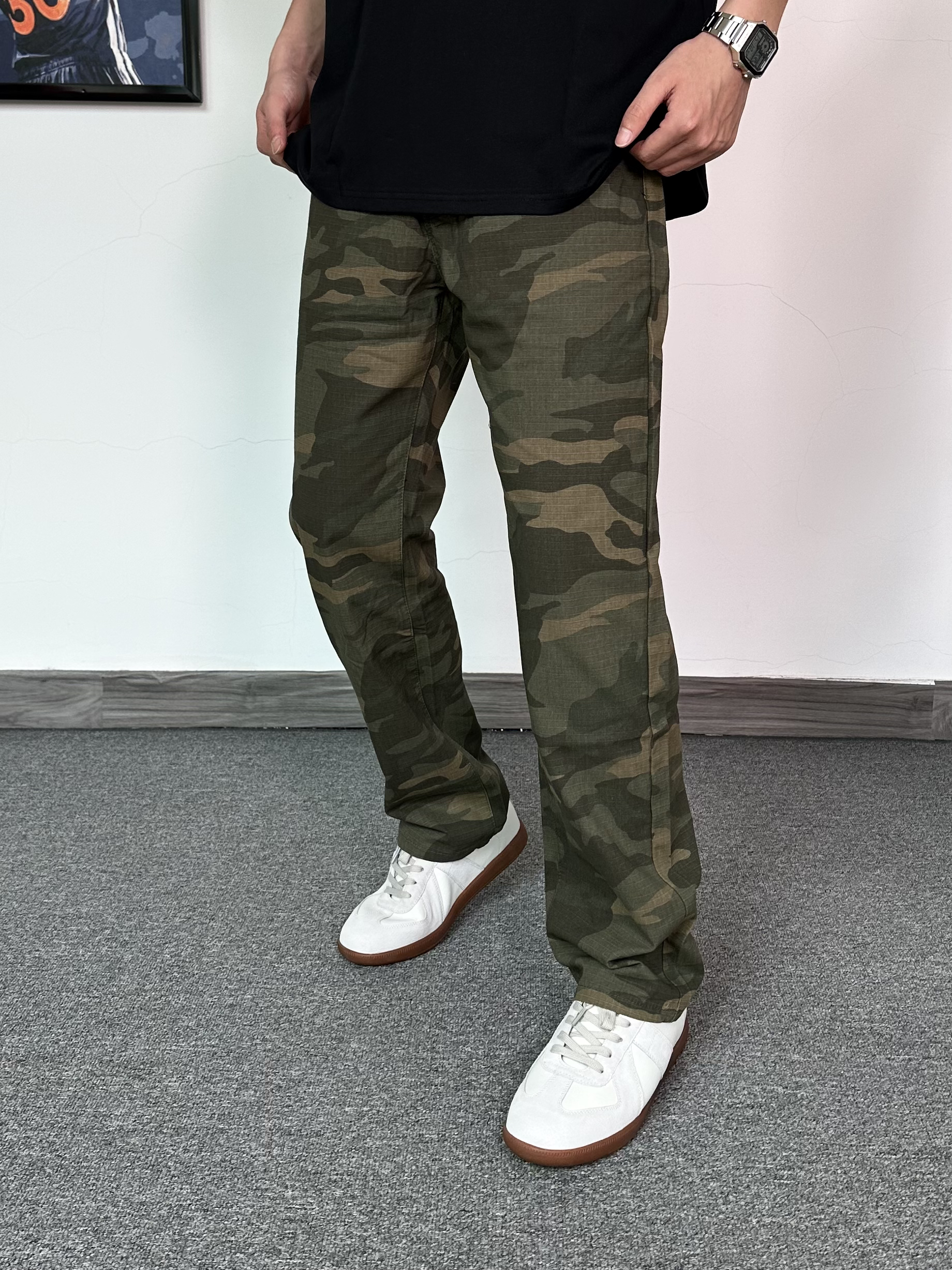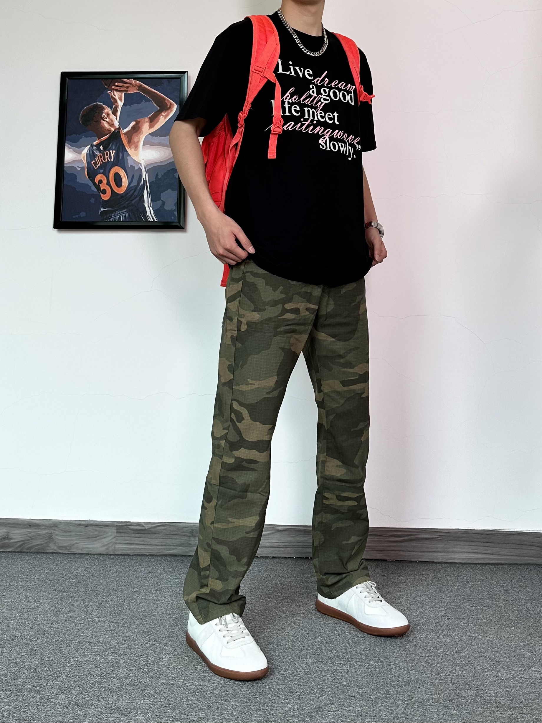 咱就是说迷彩裤别太好穿啦 先穿上一件黑色字母印花T恤 搭配直筒版型迷彩裤 经典的款式,街头潮流感拉满! 再穿上一双德训鞋✨ 脚感还是蛮舒适的~ 时髦入秋,从这一身开始🤩
