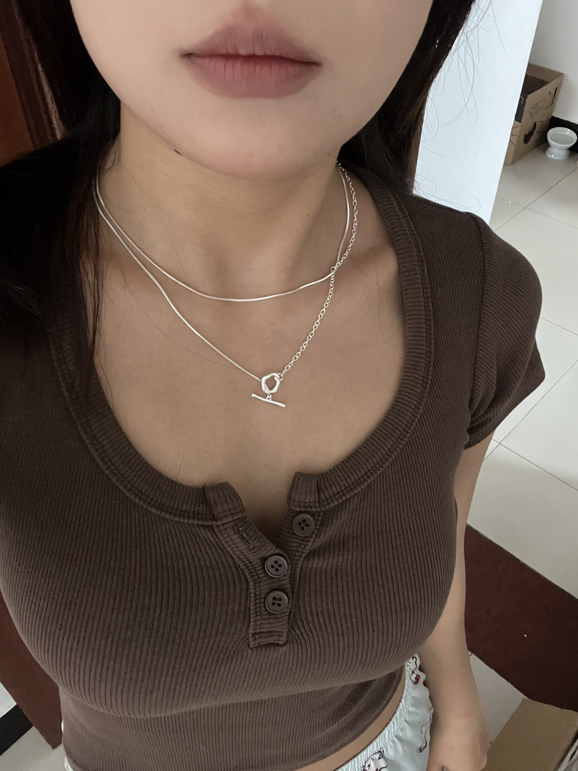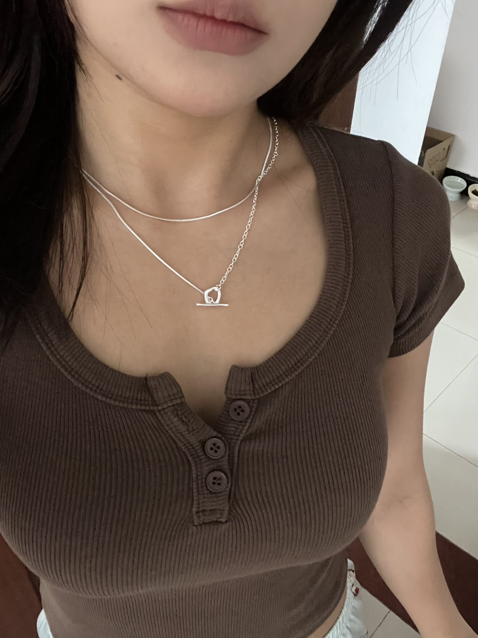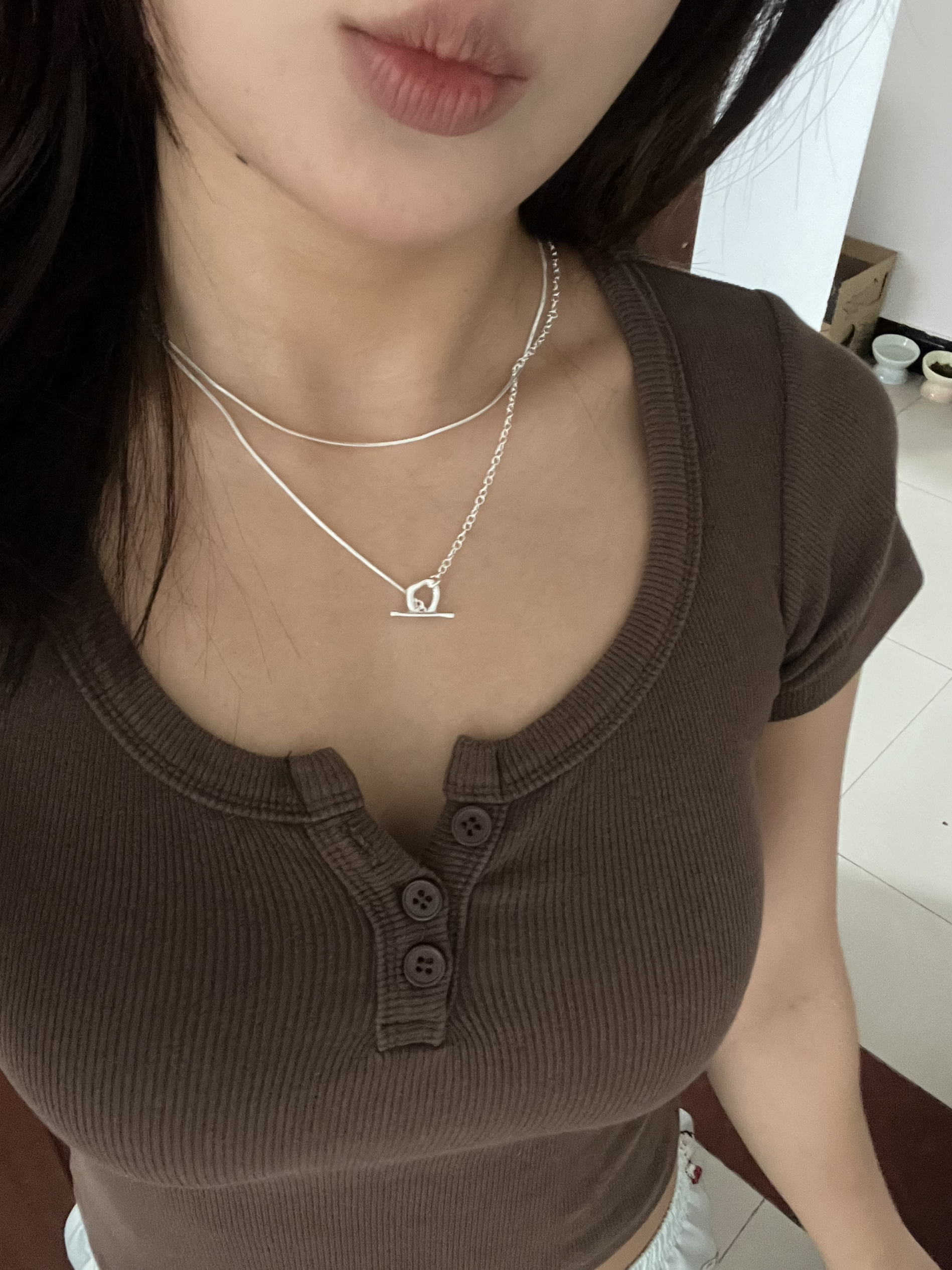 🍠:亲爱嘟大家理种草哟~ 项链是双层的不会掉色~上衣前胸有扣面料舒服😌