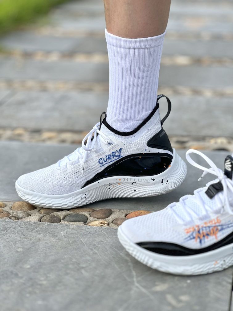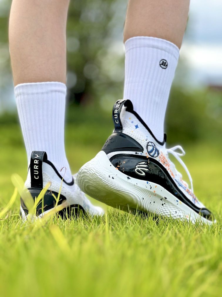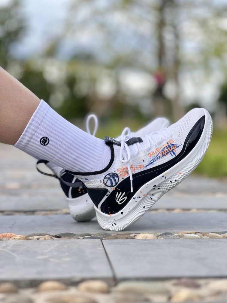 兄弟们,今天上脚分享一双定制款的库里8 加入了手绘设计的鞋面看起来就更加精神了 毕竟原鞋的黑白还是有点素的,这双实战鞋个人觉得还是挺好穿的,编织鞋面在前期的包裹性还是够的,不过持久性不太行,穿久了就会松。大底的抓地力还行,但是耐磨性太差了,只能打室内木地板。尺码方面建议选大一码才行,偏小挺多的。
