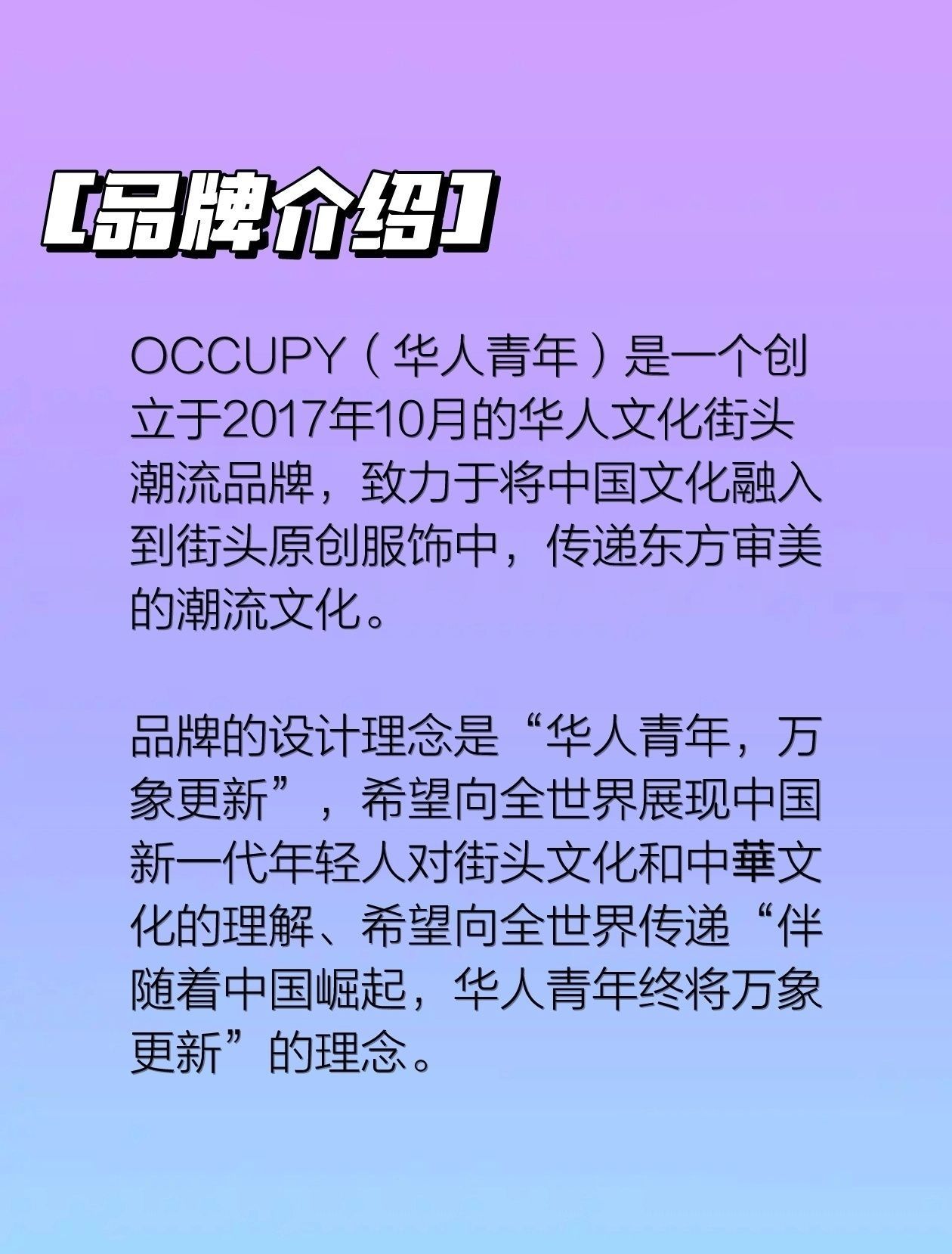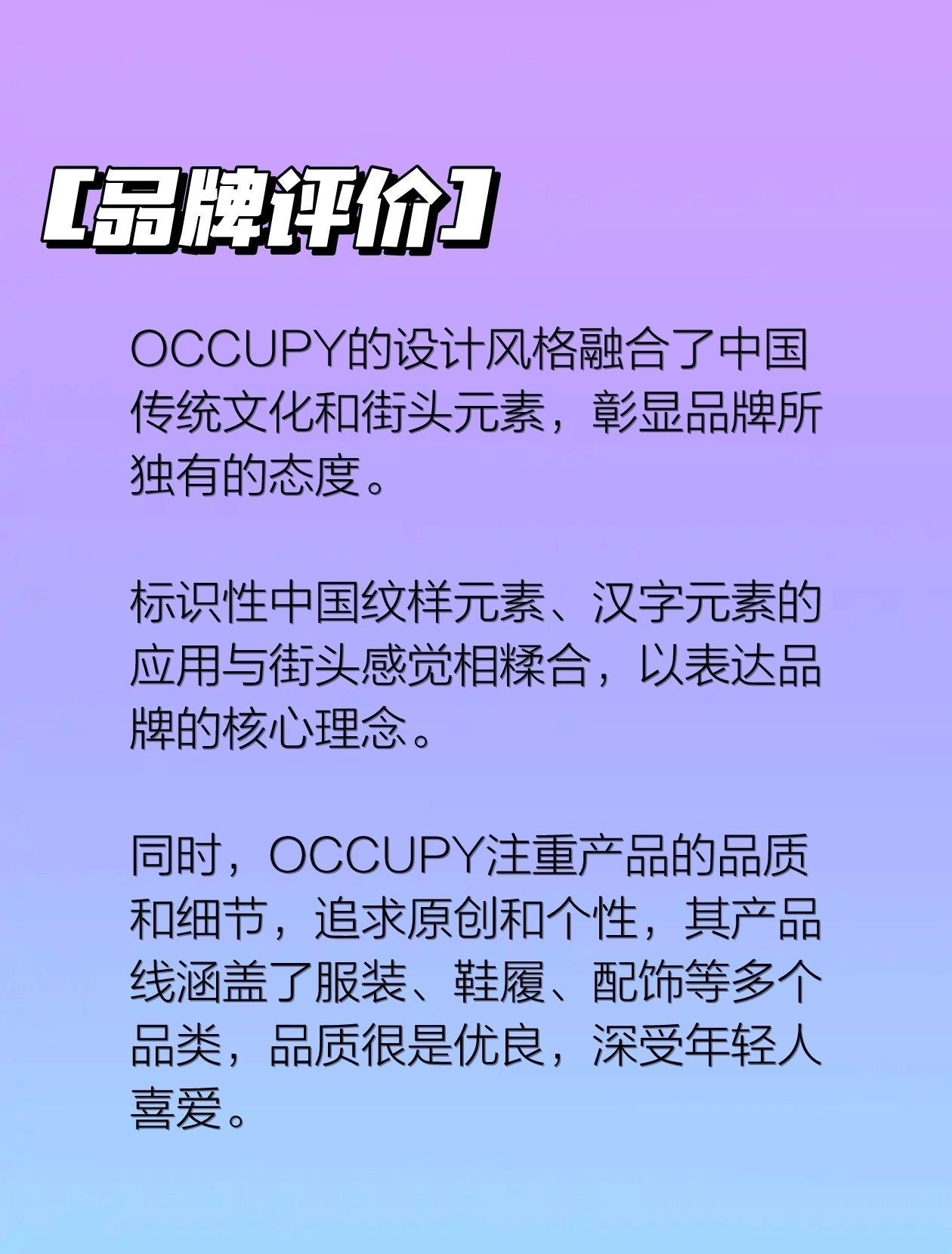 品牌名:OCCUPY(华人青年) 国籍:中国档次:中高端 品牌定位:为全球华人青年提供有设计感、有品质的服装。强调原创、个性、自由和独立。 风格:OCCUPY的设计风格融合了东西方的文化元素,既有中国传统文化的底蕴,又有现代时尚的元素。其设计注重细节,追求品质,同时又强调舒适和实用性。 价格参考:根据不同的产品线和设计,价格会有所不同。一般来说,OCCUPY的服装价格在几百元到数千元不等。 品牌l...