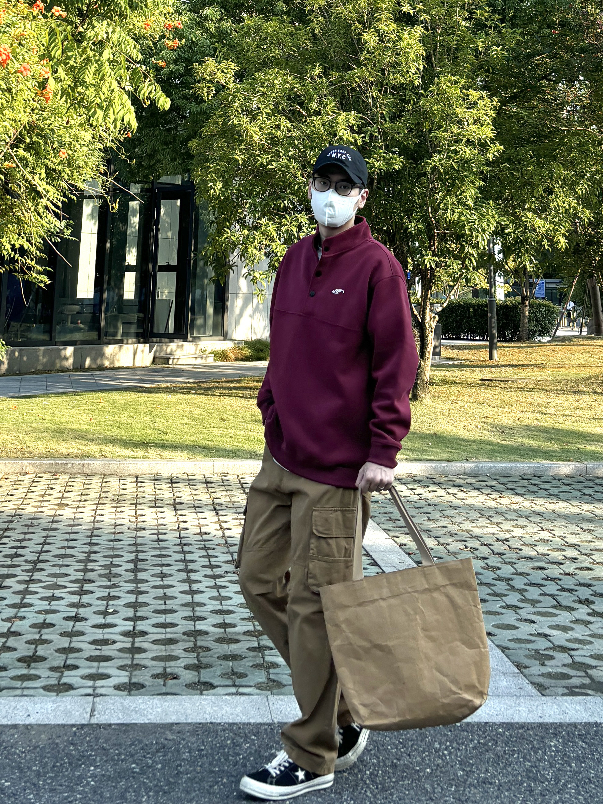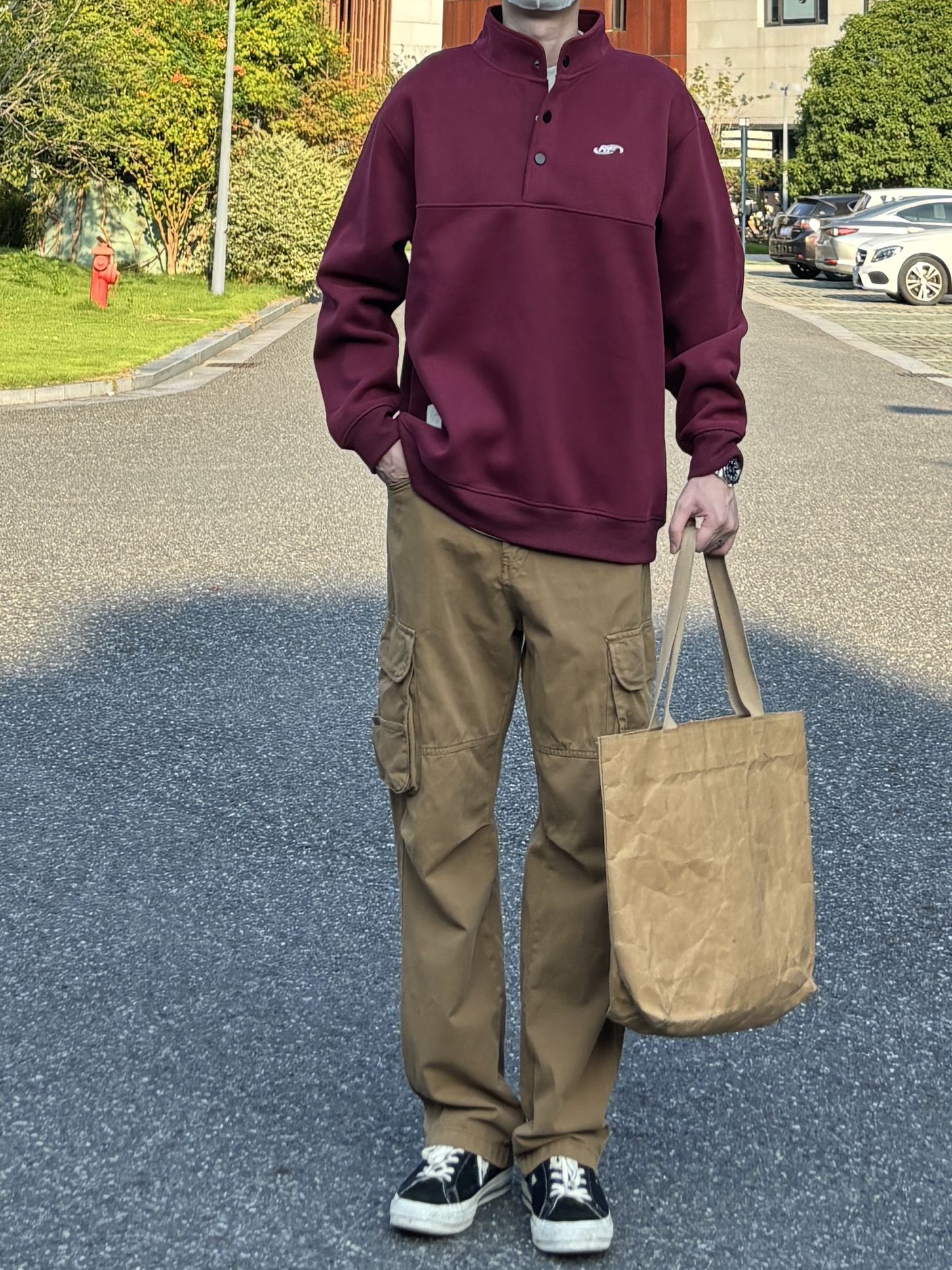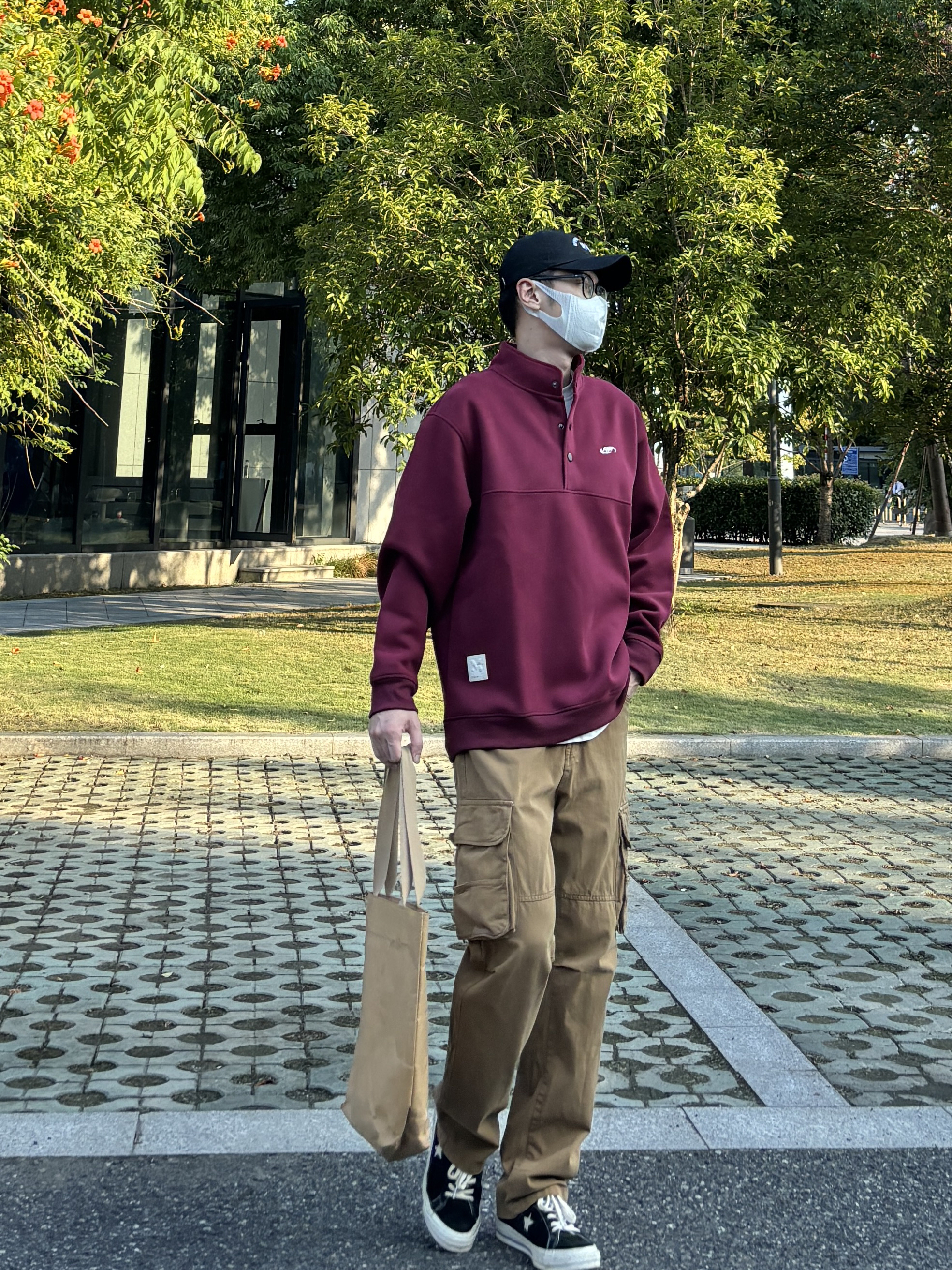 今天这套上衣穿了一件酒红色宽松阔版开胸立领卫衣 ⬇️ 裤子选择卡其色直筒水洗做旧多口袋工装裤 ⬇️ 鞋子上脚经典百搭的匡威one star ⬇️ 最后背一个轻便的油蜡帆布托特包 - 今日搭配 衣服裤子:NICE LILI 鞋子:匡威ONE STAR