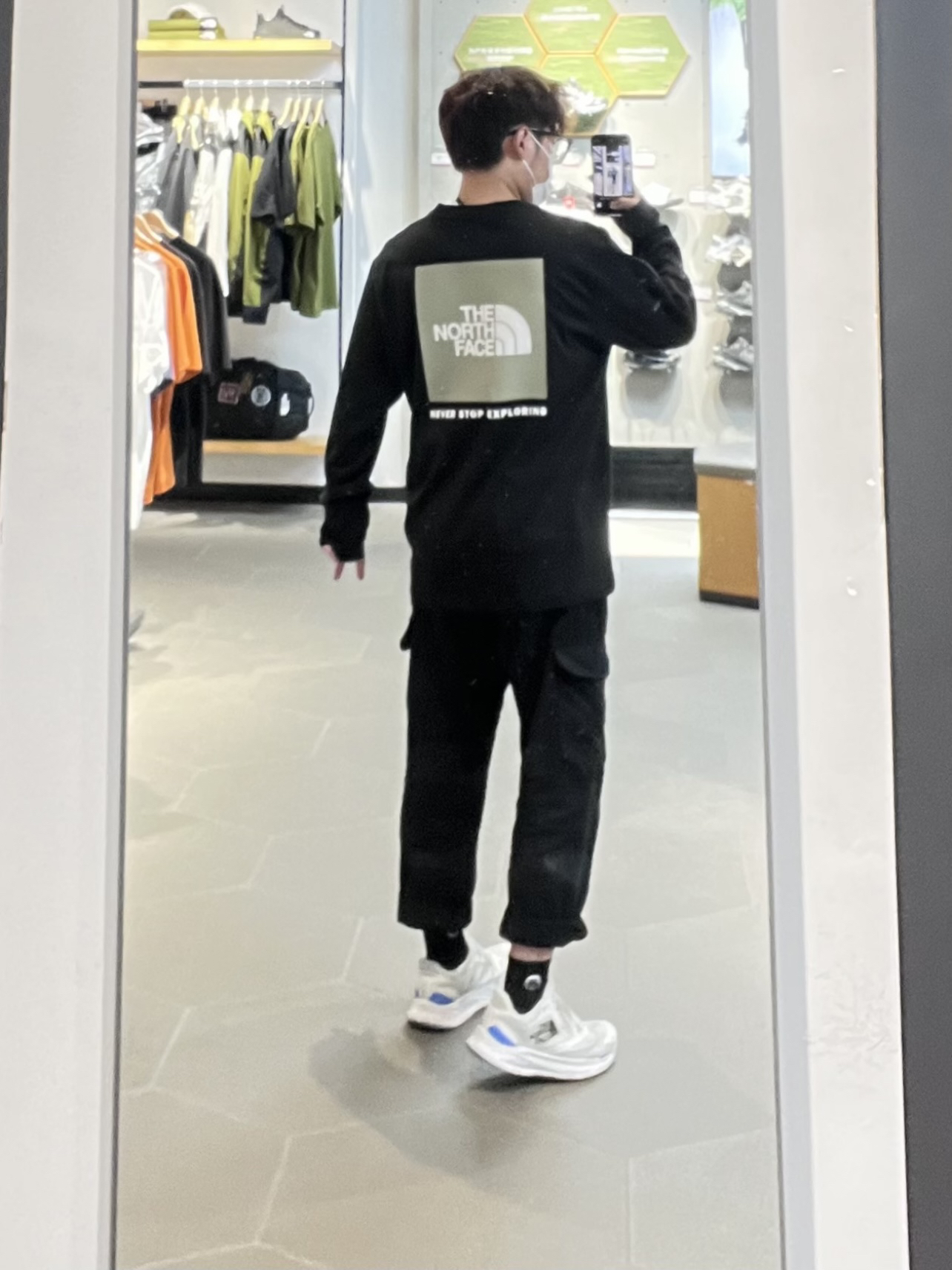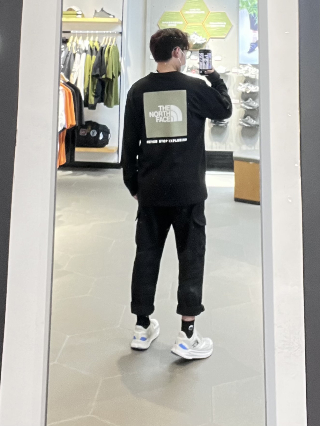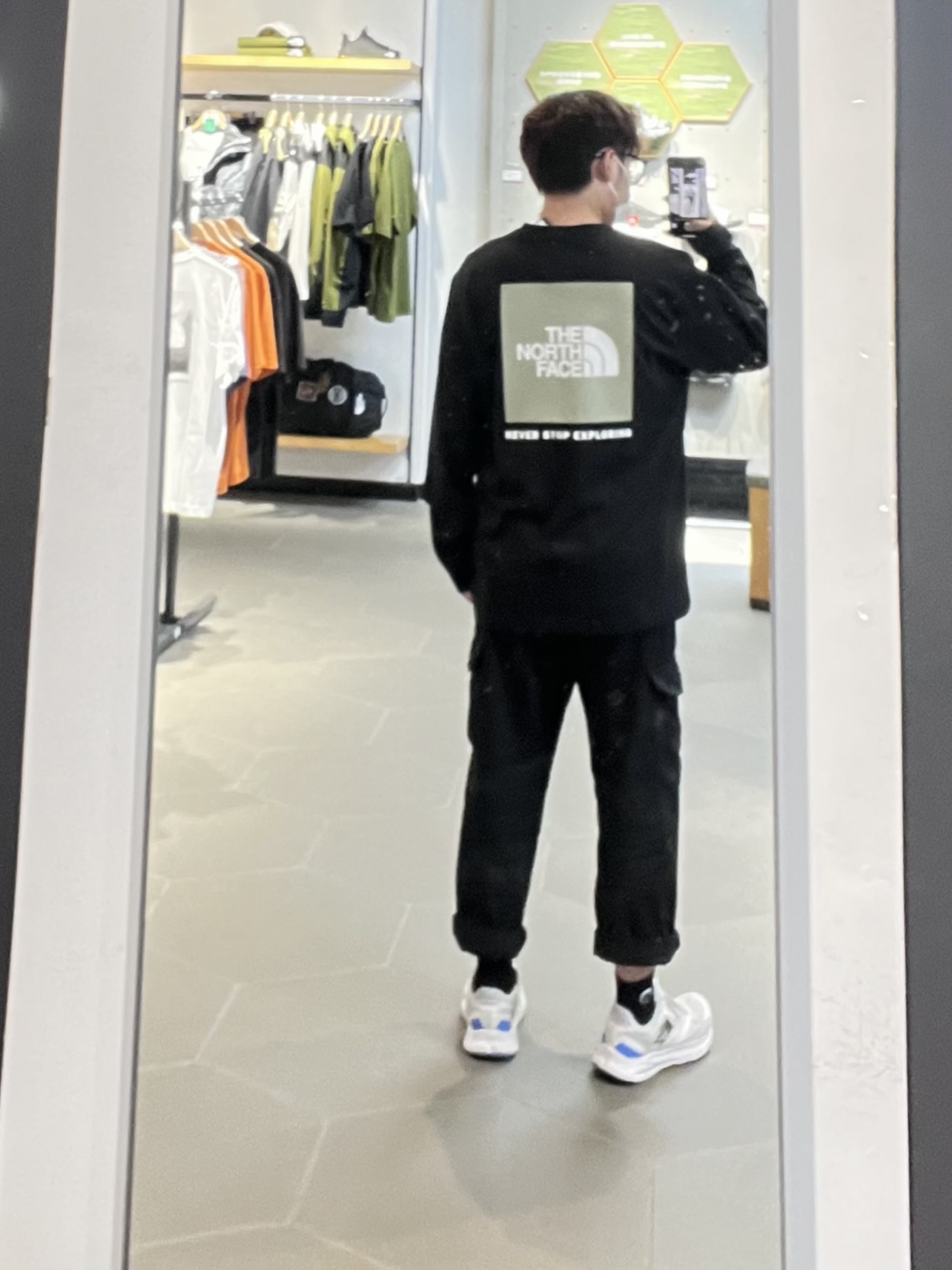 今日份穿搭分享🎉 THE NORTH FACE北面黑色长袖T恤 正面一个简简单单的白色logo印花 背后是方形浅牛油果绿和白色logo印花的组合 下面还有一串小白色字母印花 就是很简单的长袖T恤等秋天就可以穿啦 单穿很好看当内搭不错哦🉑️ 鞋子也是选的北面的白色运动鞋 这双已经穿了一年啦属于越穿越舒服的哦 关键他蓝白配色简单好穿哦很好穿搭 👔 THE NORTH FACE 👖 黑色工装裤 👟...