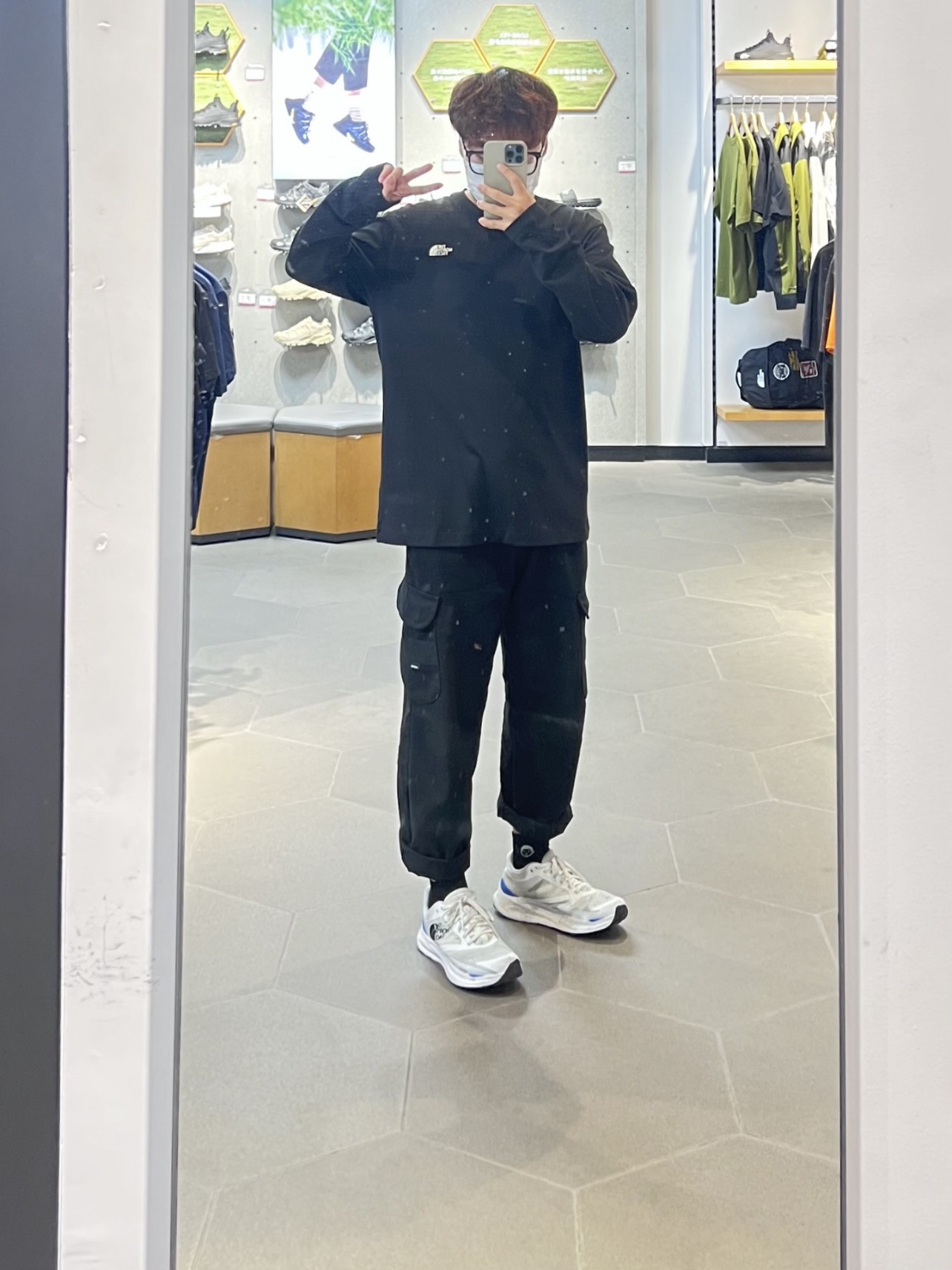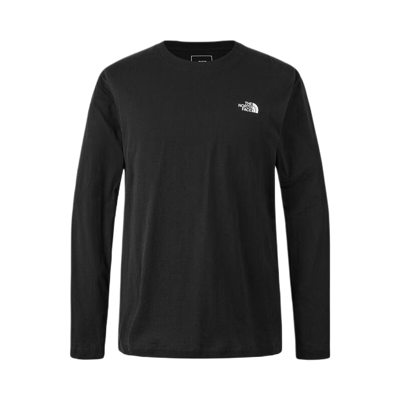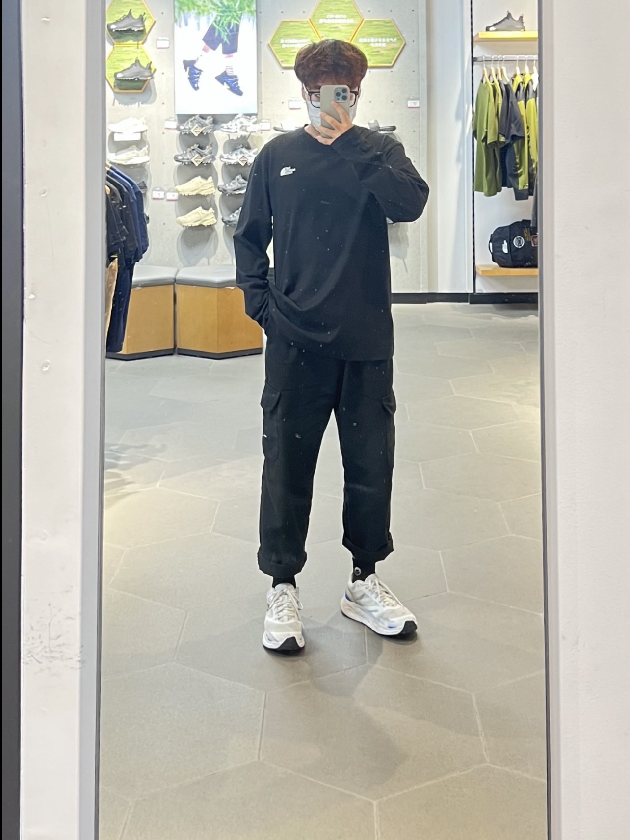 今日份穿搭分享🎉 THE NORTH FACE北面黑色长袖T恤 正面一个简简单单的白色logo印花 背后是方形浅牛油果绿和白色logo印花的组合 下面还有一串小白色字母印花 就是很简单的长袖T恤等秋天就可以穿啦 单穿很好看当内搭不错哦🉑️ 鞋子也是选的北面的白色运动鞋 这双已经穿了一年啦属于越穿越舒服的哦 关键他蓝白配色简单好穿哦很好穿搭 👔 THE NORTH FACE 👖 黑色工装裤 👟...