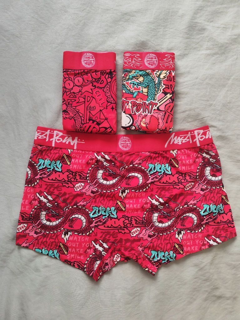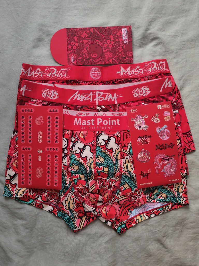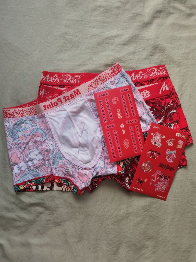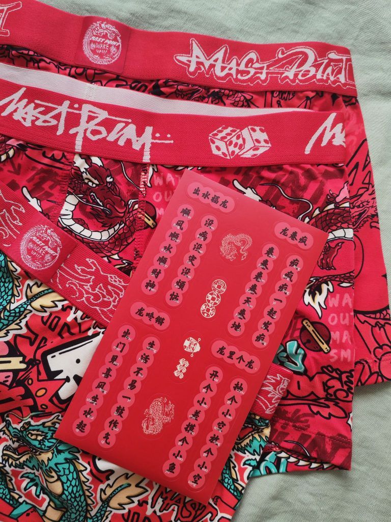 我女朋友简直是宝藏女友!买了这款Mast Point/麦左的龙年主题内裤礼盒送给我,简直太爱穿了! 礼盒打开,里面除了有3条独立包装的内裤之外,竟然还送红包!而且还有对联和冰箱贴! 用来送礼真的是非常不错! 除了包装喜庆好看之外,这内裤穿在身上是真舒服!用料厚实,但也透气舒适!而且有弹性,不会勒。关键是穿着非常好看,谁能拒绝龙啊?!没有! 中秋节马上要到了,如果你还不知道送什么礼物给男友的话...