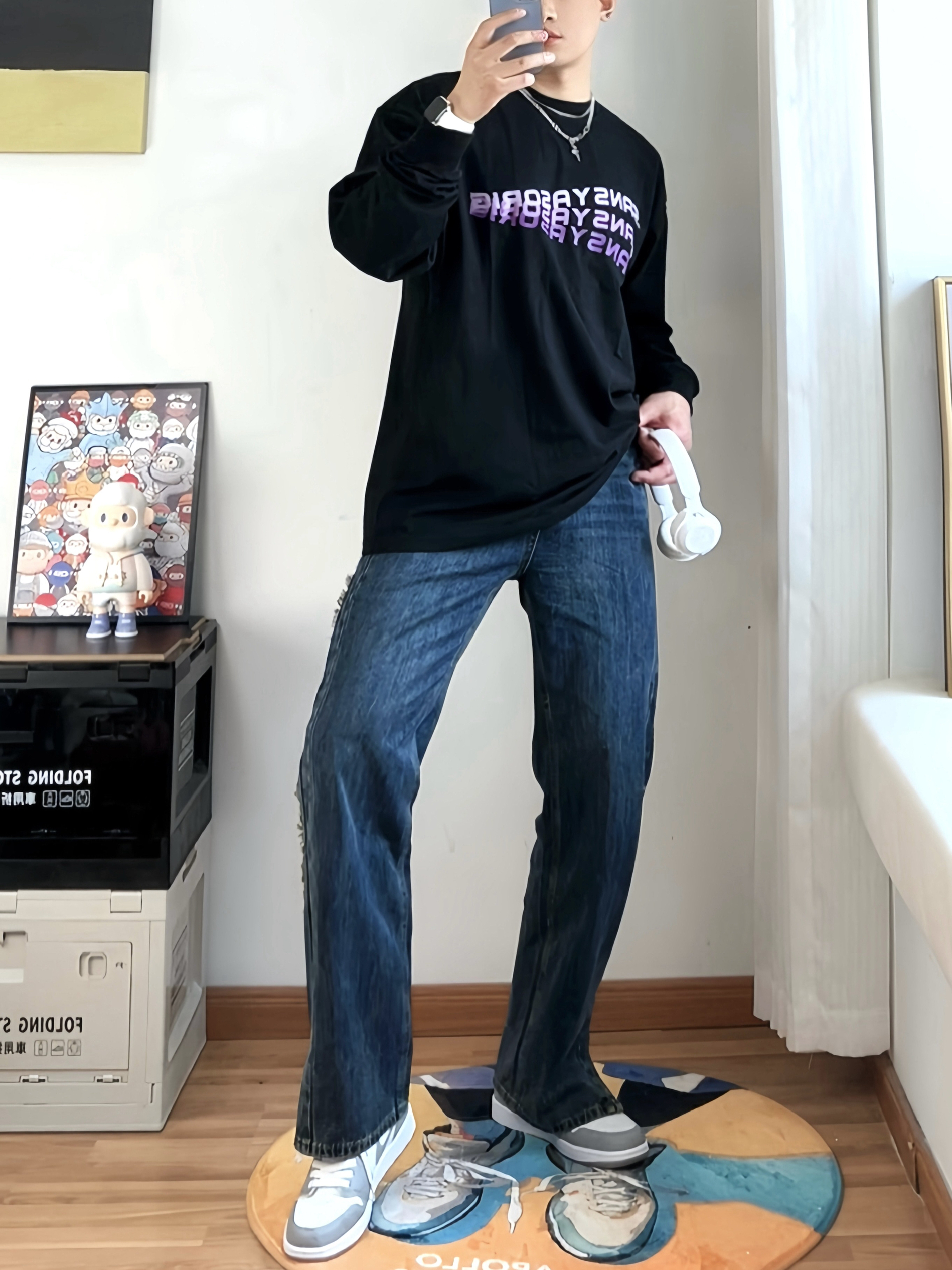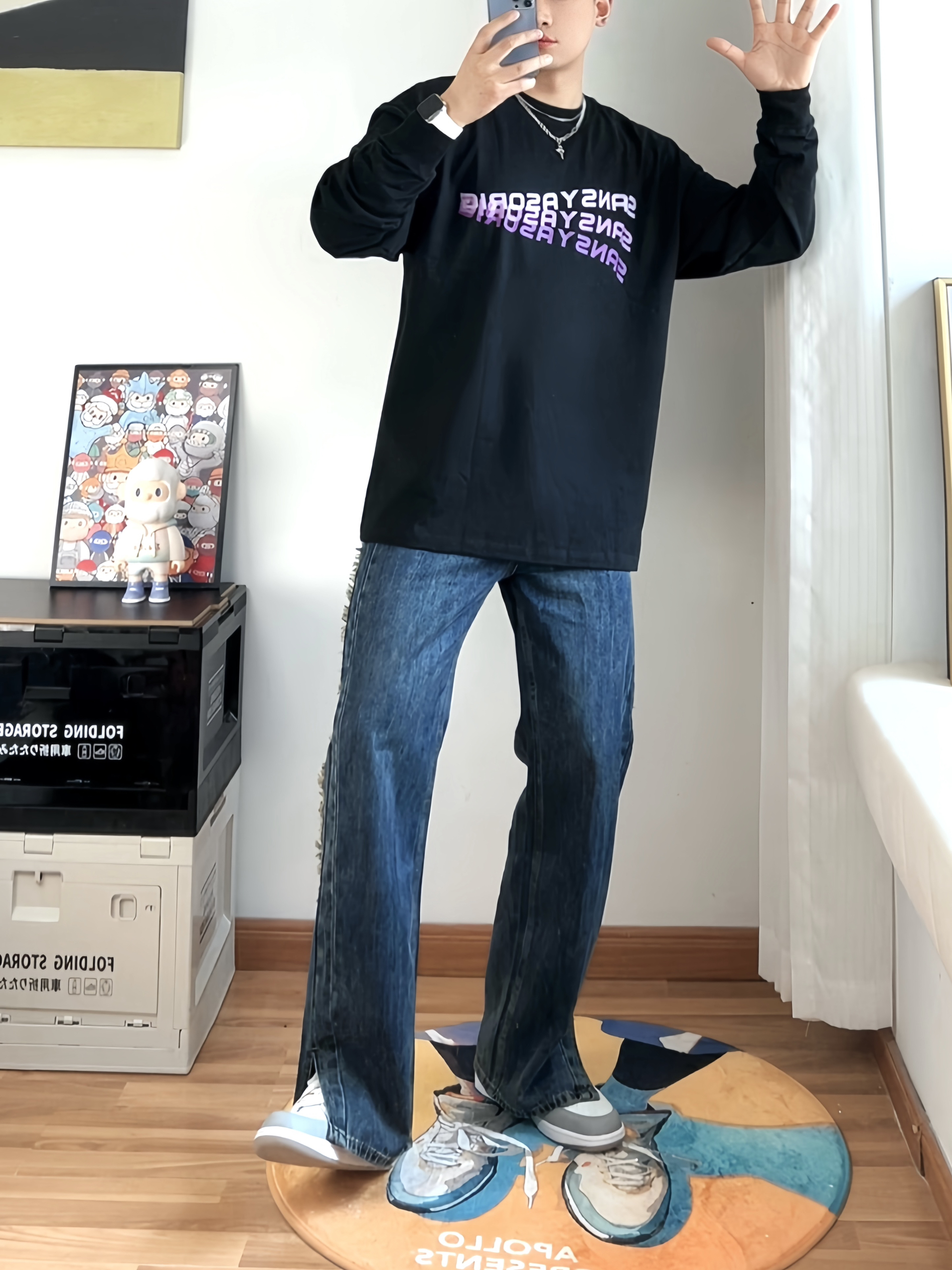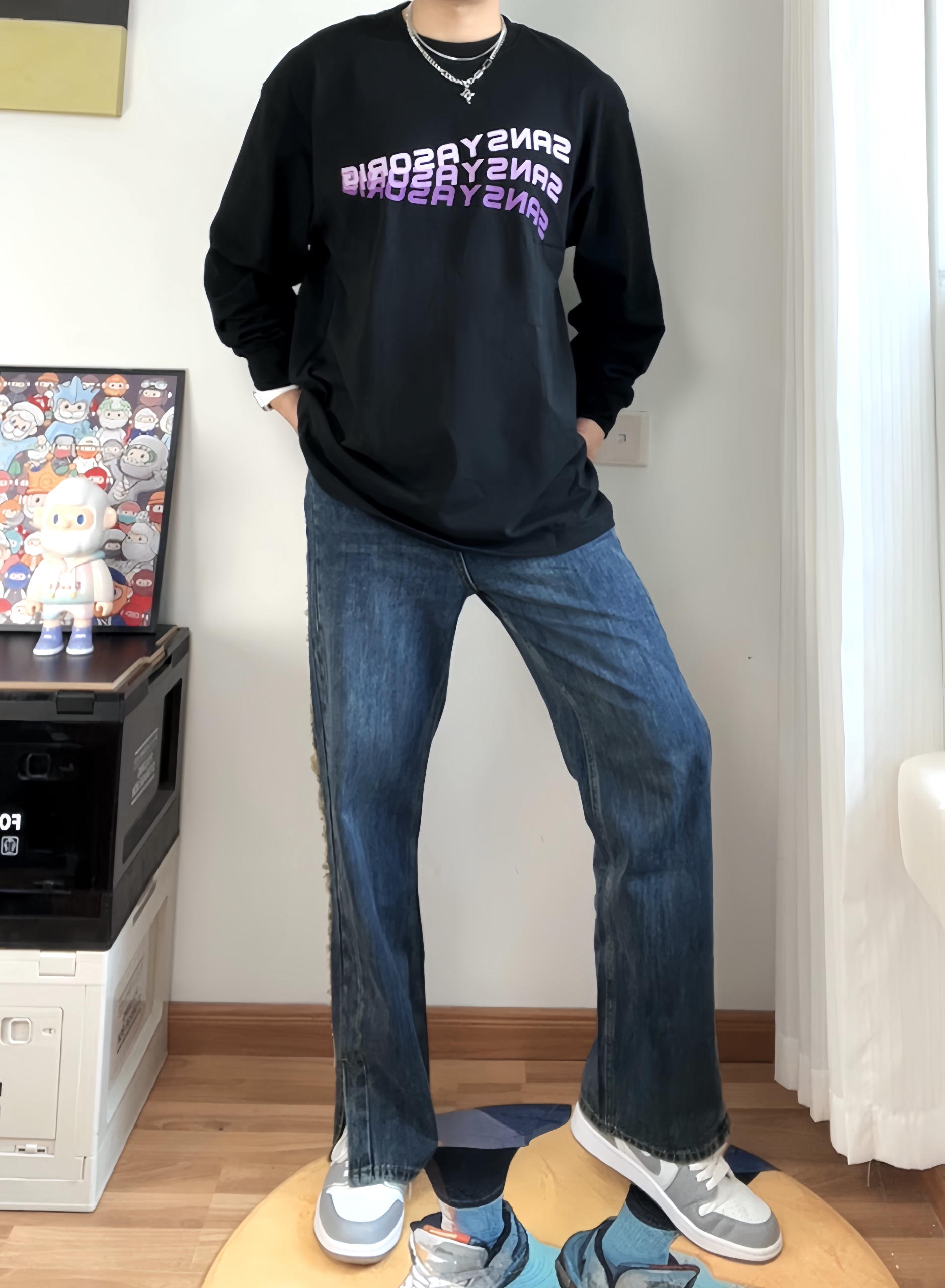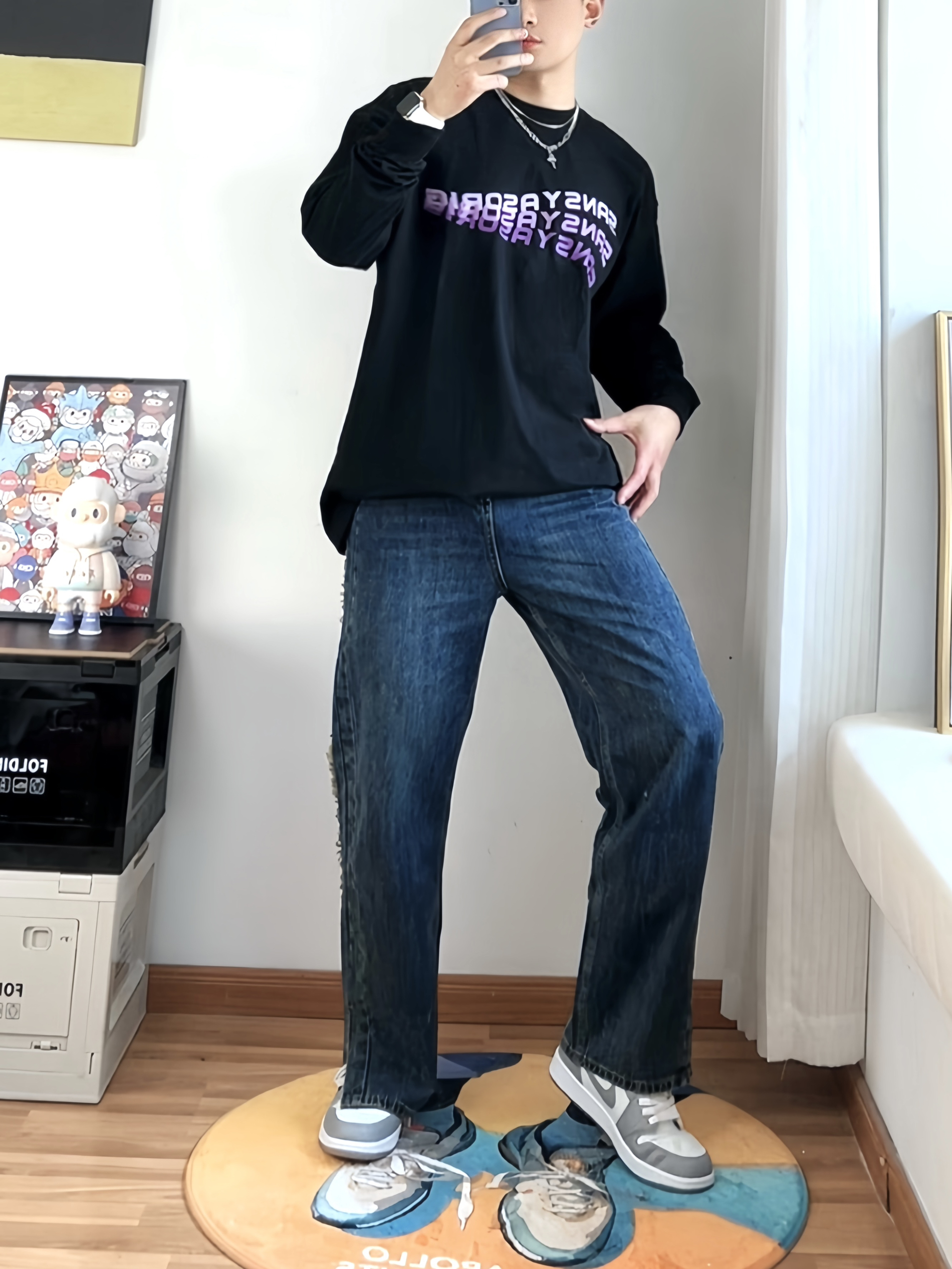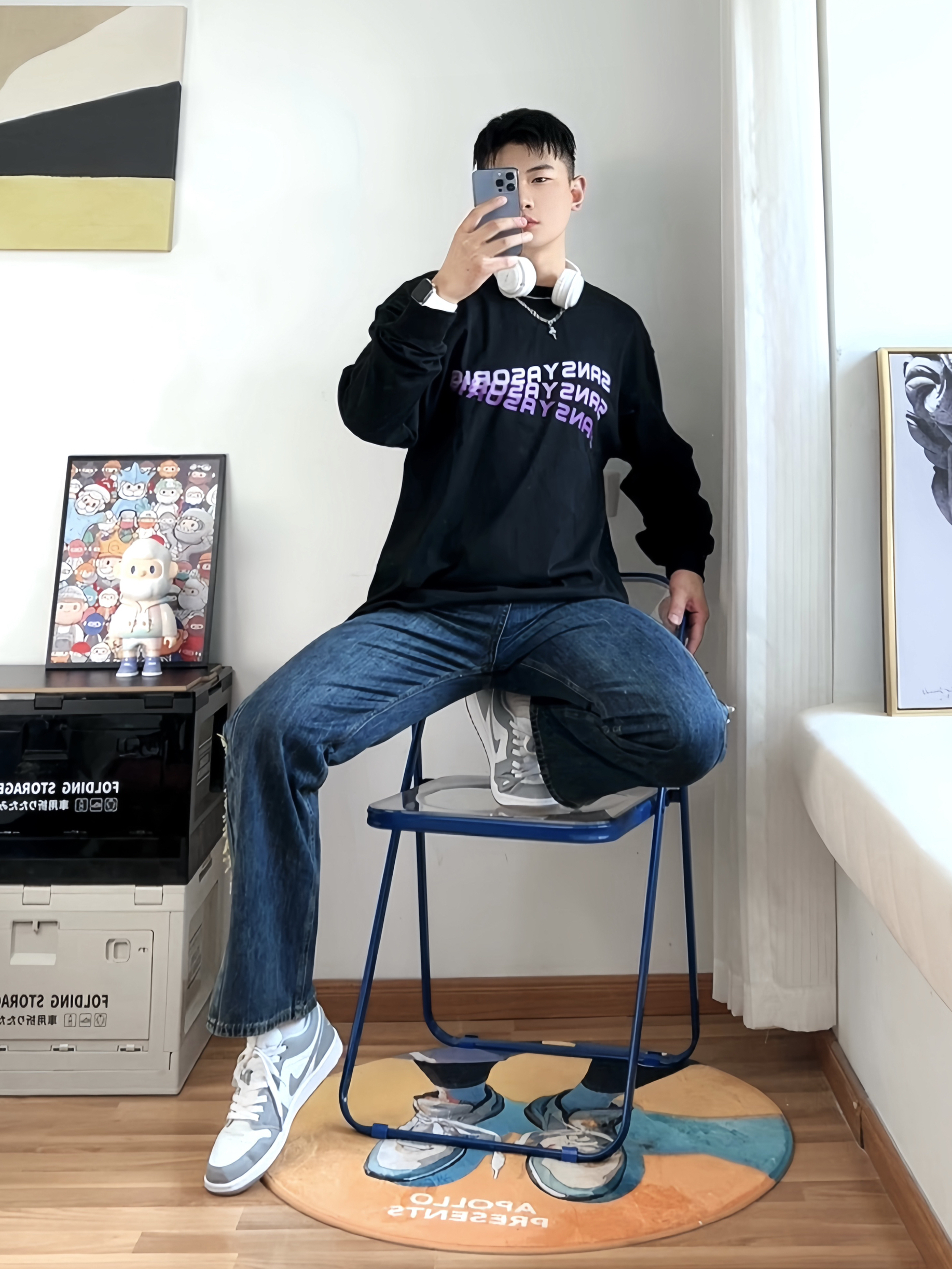 宝藏男大又开学啦~ ✅今天穿的这件美式风的长袖卫衣 拿到手的感觉就是克重很高的感觉 宽松的版型,有点落肩款 我是有点壮的,穿起来也挺显瘦的 胸口的💜印花也很特别 配上开口牛仔裤和aj 是不是很帅?😎