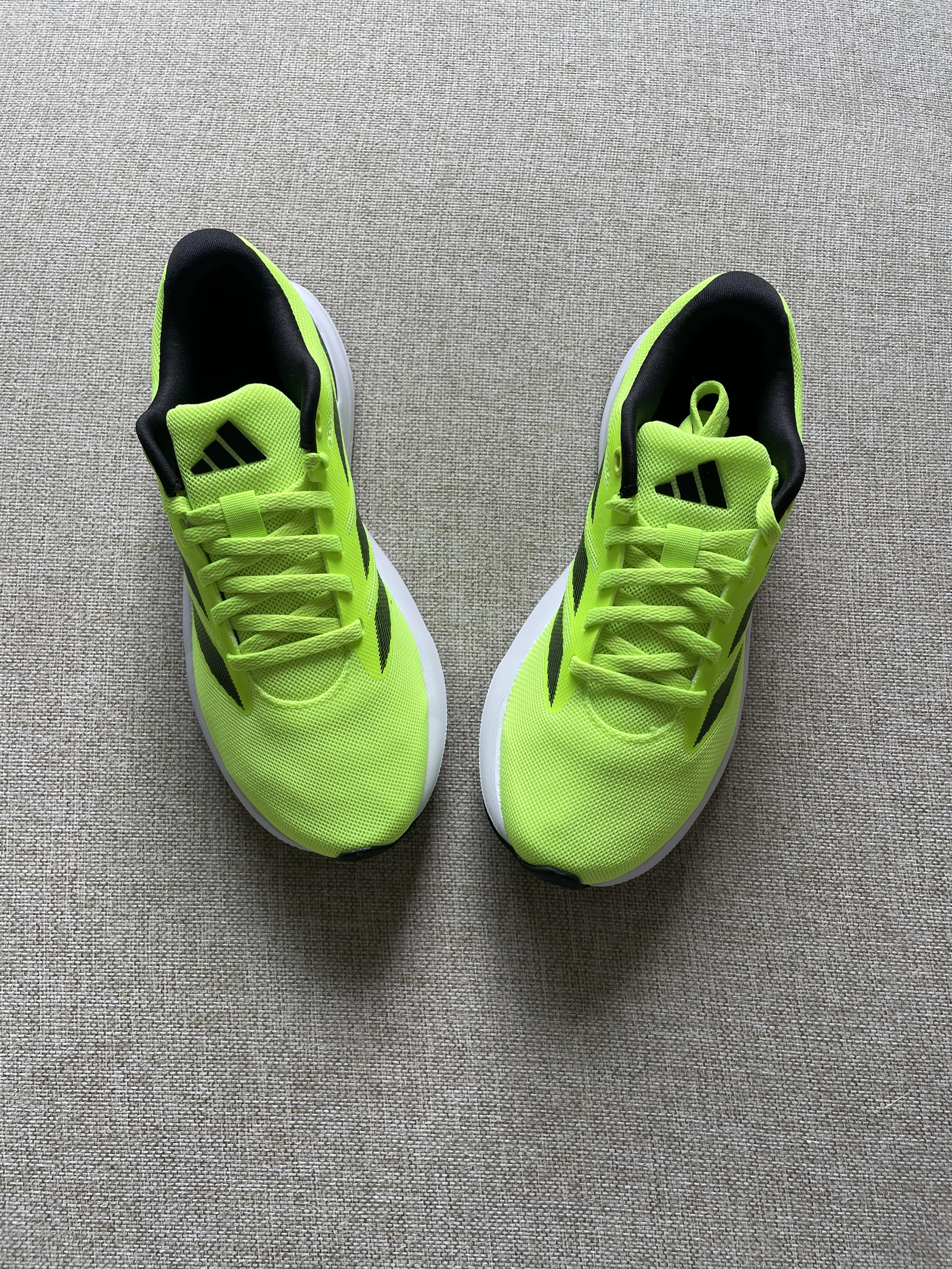 👟Adidas Duramo RC ✨今日分享一下阿迪的这双性价比满满的跑鞋。鞋子以荧光绿为主,搭了黑色点缀,整体很亮眼也很有个性。 🌸织物网面材质的鞋面加上了热熔胶压印,整体强度不错,夏天穿也不闷脚,中底是泡棉材质,缓震感我觉得中规中矩,对大体重来说可能没什么感觉,但大底是橡胶材质,耐磨程度以及防滑都是不错的。 💫2⃣️开的价位,日常运动跑步、通勤等是不错的选择。尺码是正码,前掌对宽脚还是...