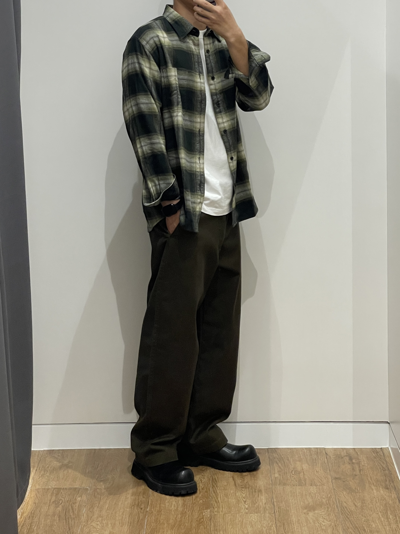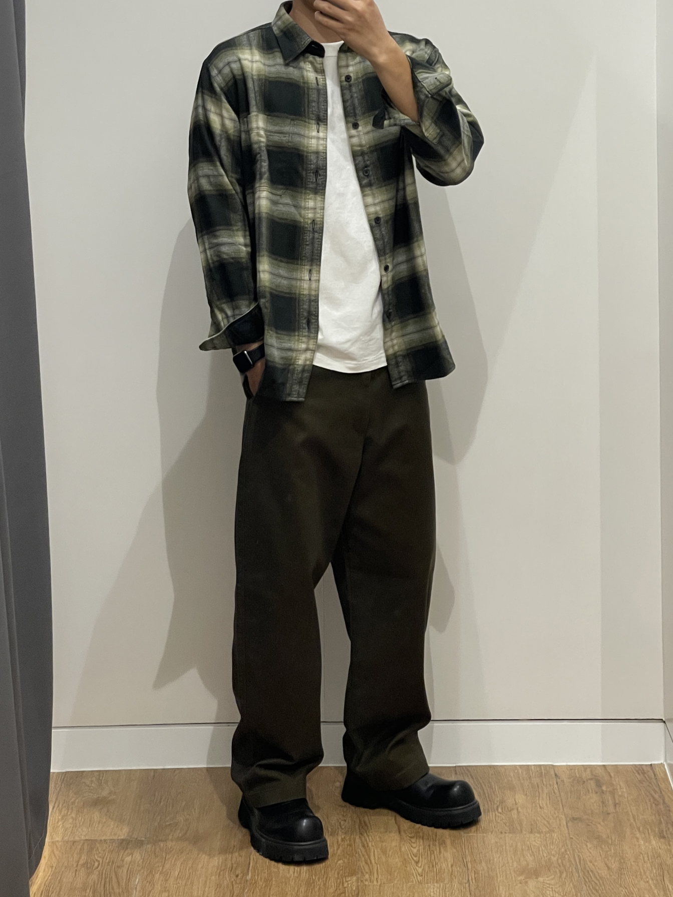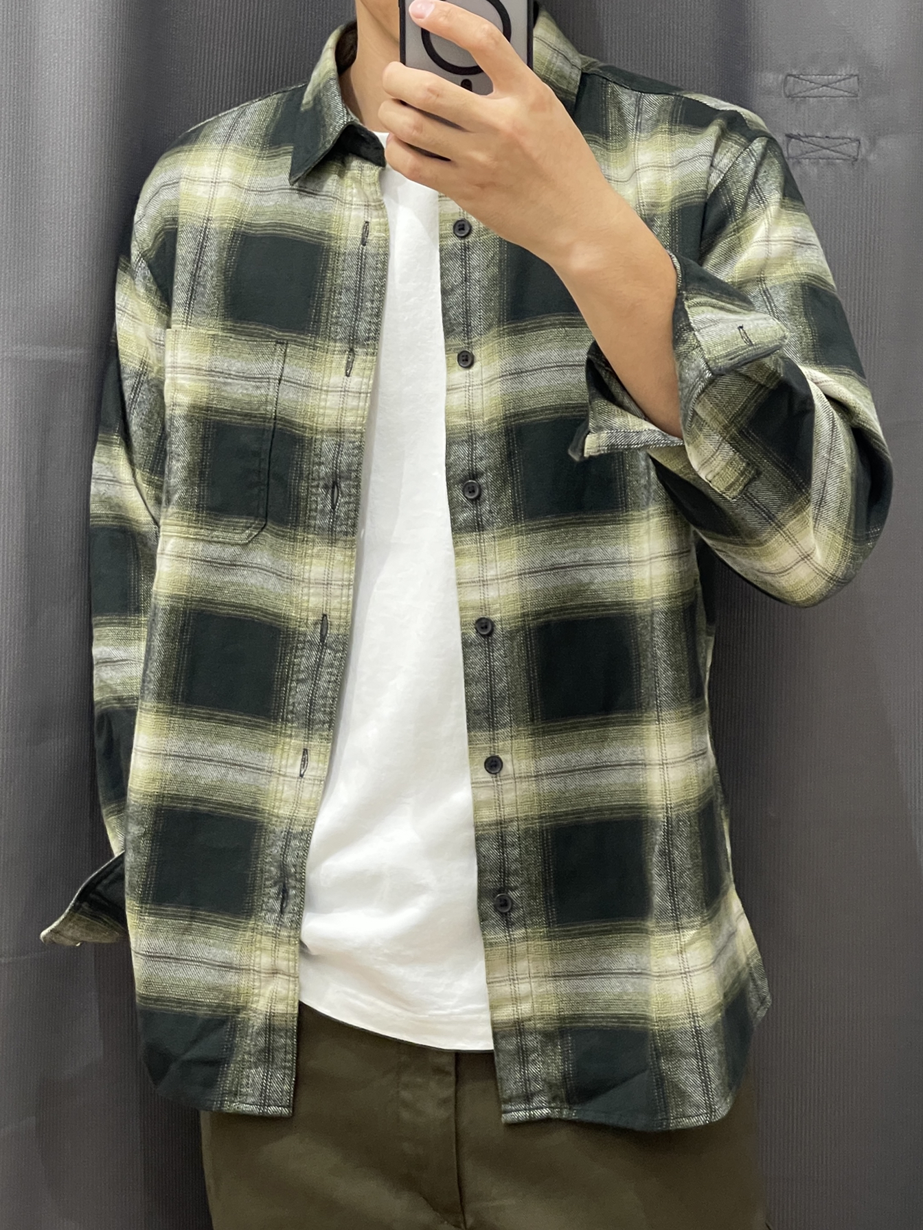 衬衫货号:470188 裤子货号:470549 广州天气还是很闷热 办公室或者室内空调都普遍开的比较大 身上还是有必要备件长袖衬衫 法兰绒的面料表面质地柔滑 穿上身后暖感直接利落 绿色格纹搭配军绿色的裤子看起来很舒服 同色系穿搭一般情况下不容易出错