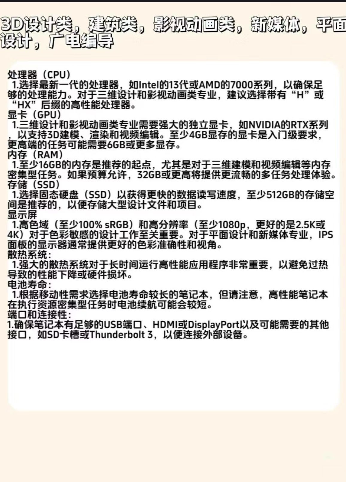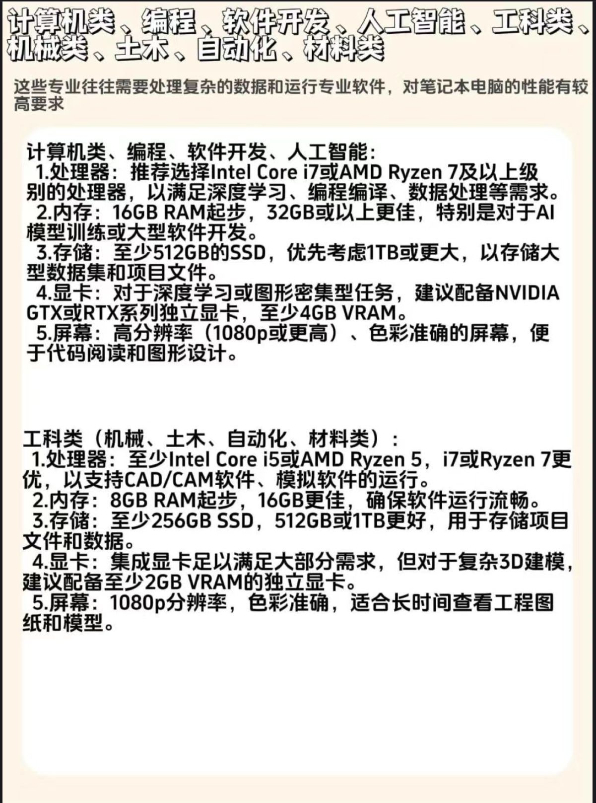 文科类专业: 文科类专业如经济学、文学、历史学等,通常不需要高性能的笔记本,核显笔记本就能满足需求。推荐选择轻薄全能本,并且具备良好的屏幕质量和便携性。 理工科专业: 这些专业需要运行专业软件,如编程、数据分析等,可能需要更强的处理器和显卡。推荐选择搭载独立显卡的游戏本,保证足够的性能支持专业学习和实践。 艺术媒体类专业/电竞发烧友: 艺术媒体类专业,如游戏制作、动画制作、影视特效等,需要高性能的...