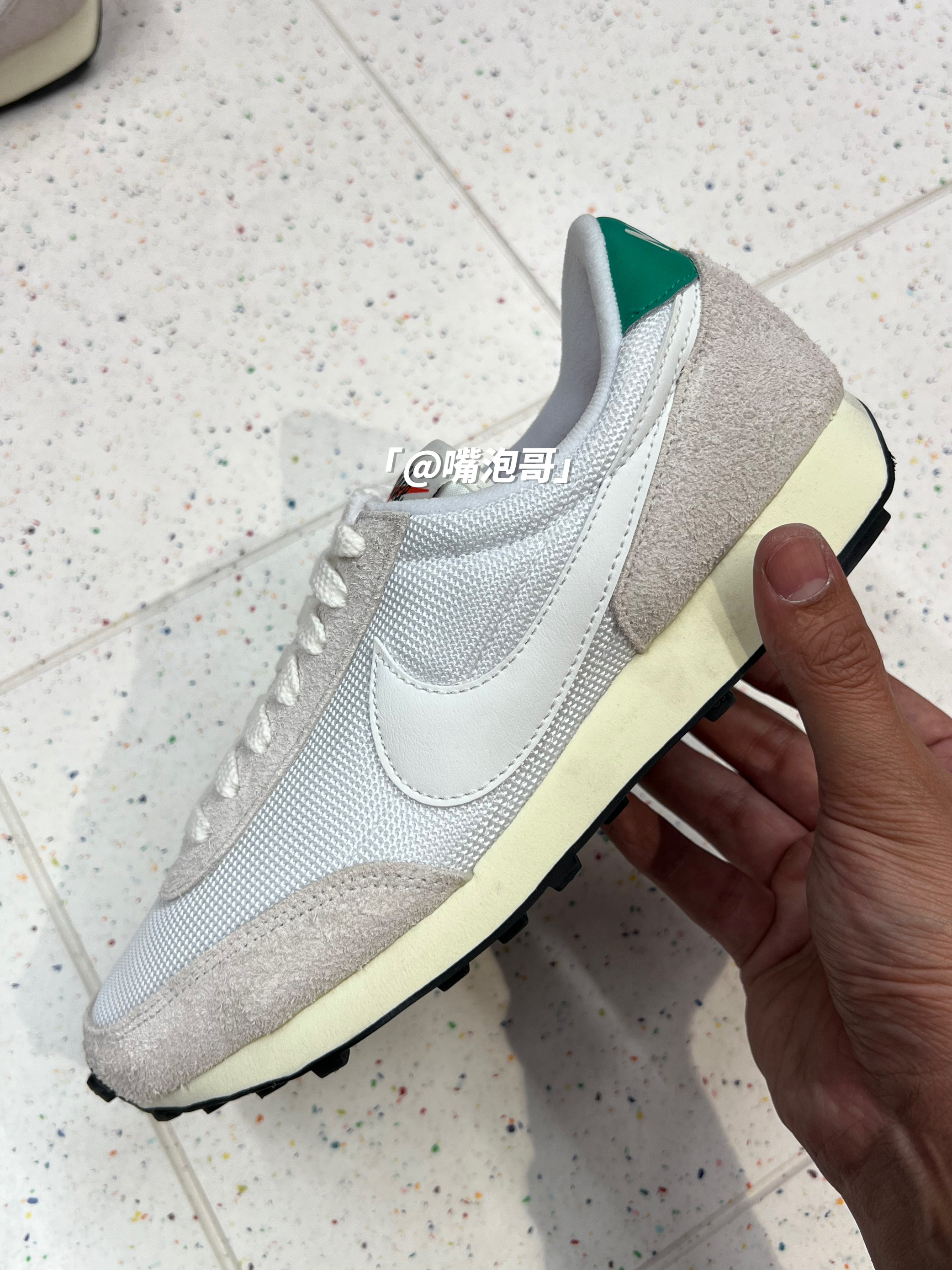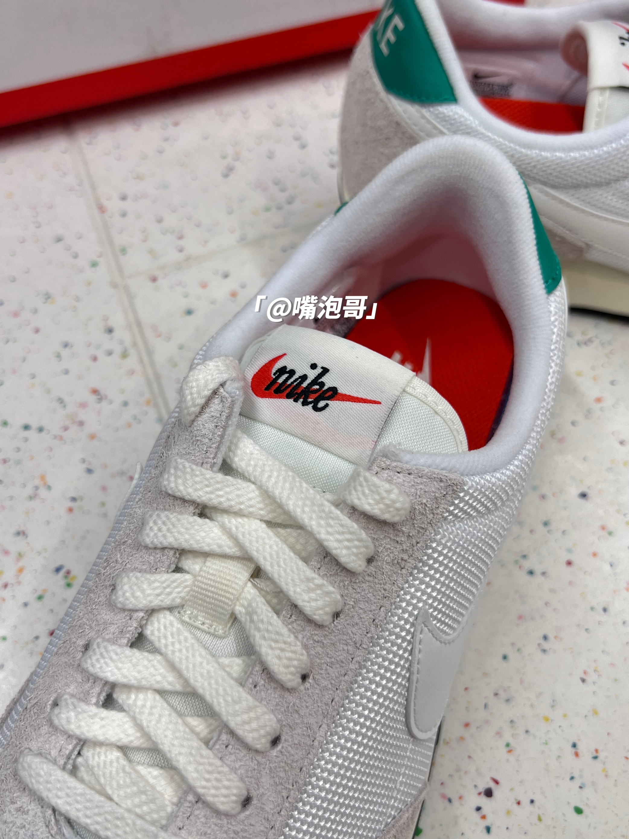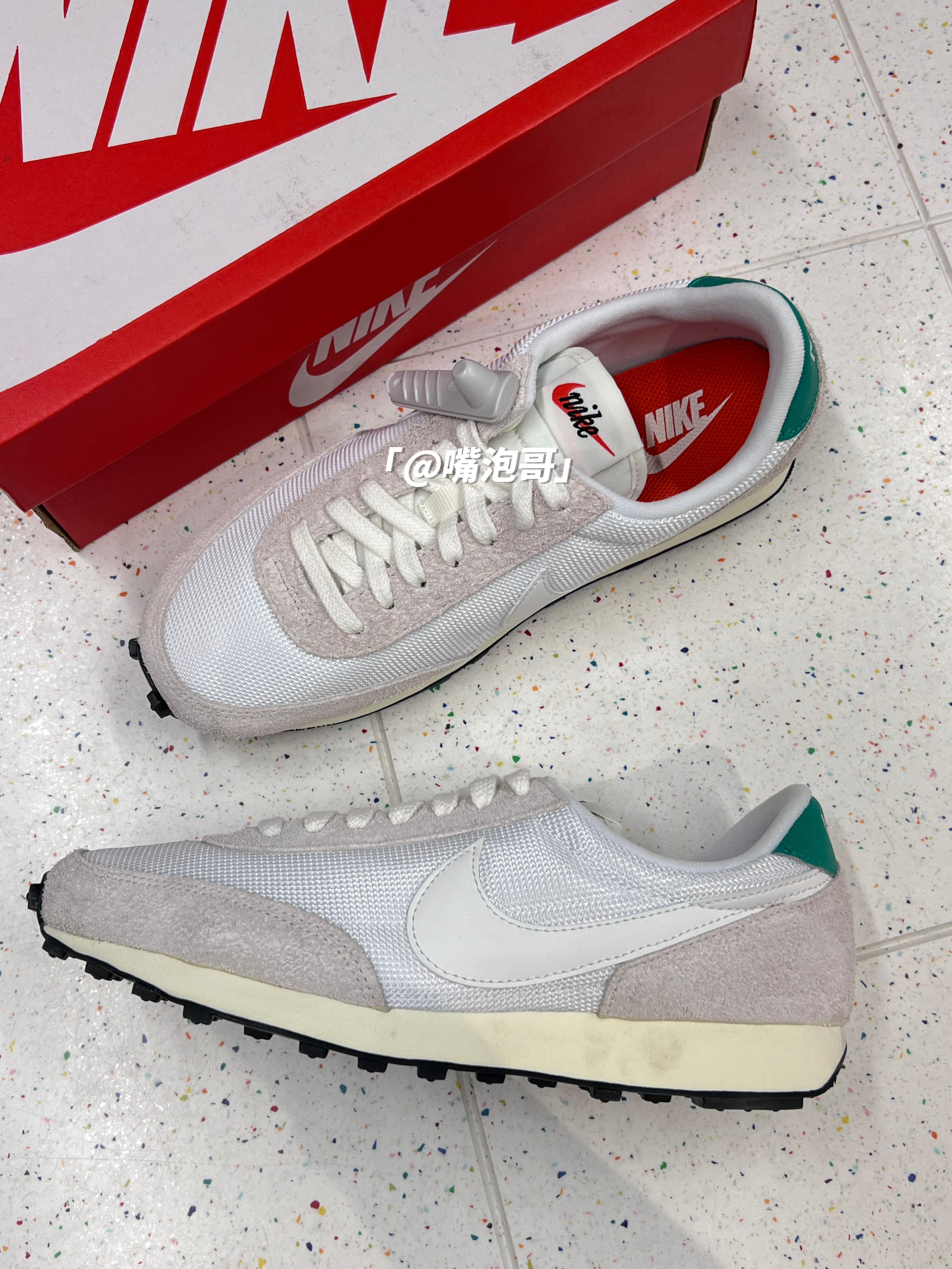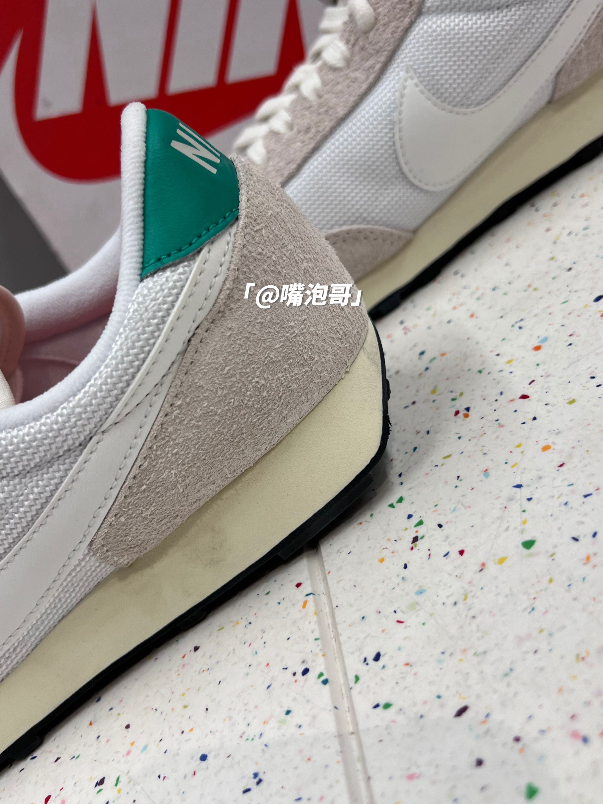 👟:DBreak Vintage 白灰 简介: 鞋款是一双低帮的运动休闲鞋,整双鞋子选用了白灰色来呈现,细节处加入了绿色装饰,使鞋子有着比较强的复古感,脚感上鞋子算是中规中矩的设计。 细节: 鞋面采用了复古织物材料制作而成,并且又加入了麂皮材料,增强了质感及耐磨性,鞋身两侧的swoosh使用白色皮革打造,鞋舌及后跟使用织物材料,使透气性增强,中底是高密度的缓震泡棉,脚感中规中矩,大底是...
