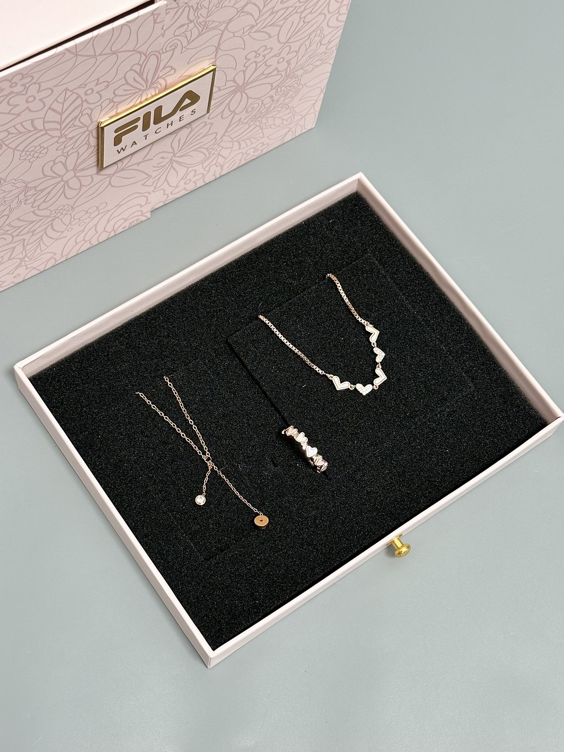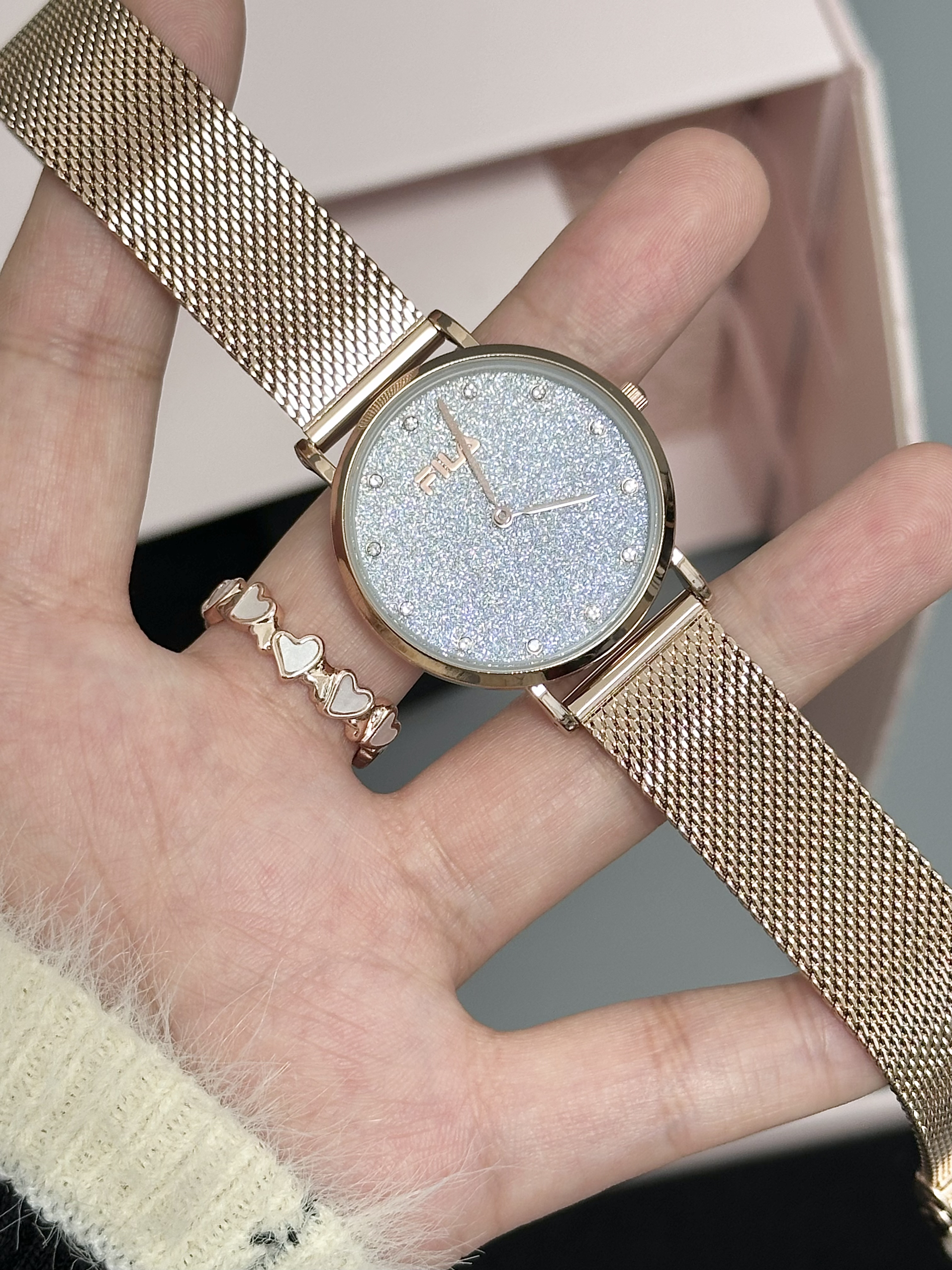 是我敲喜欢的fila啊 我尊滴好爱 戴起来也很精致的 表盘blingbling的 里面还有戒指和项链 尊滴好大气啊