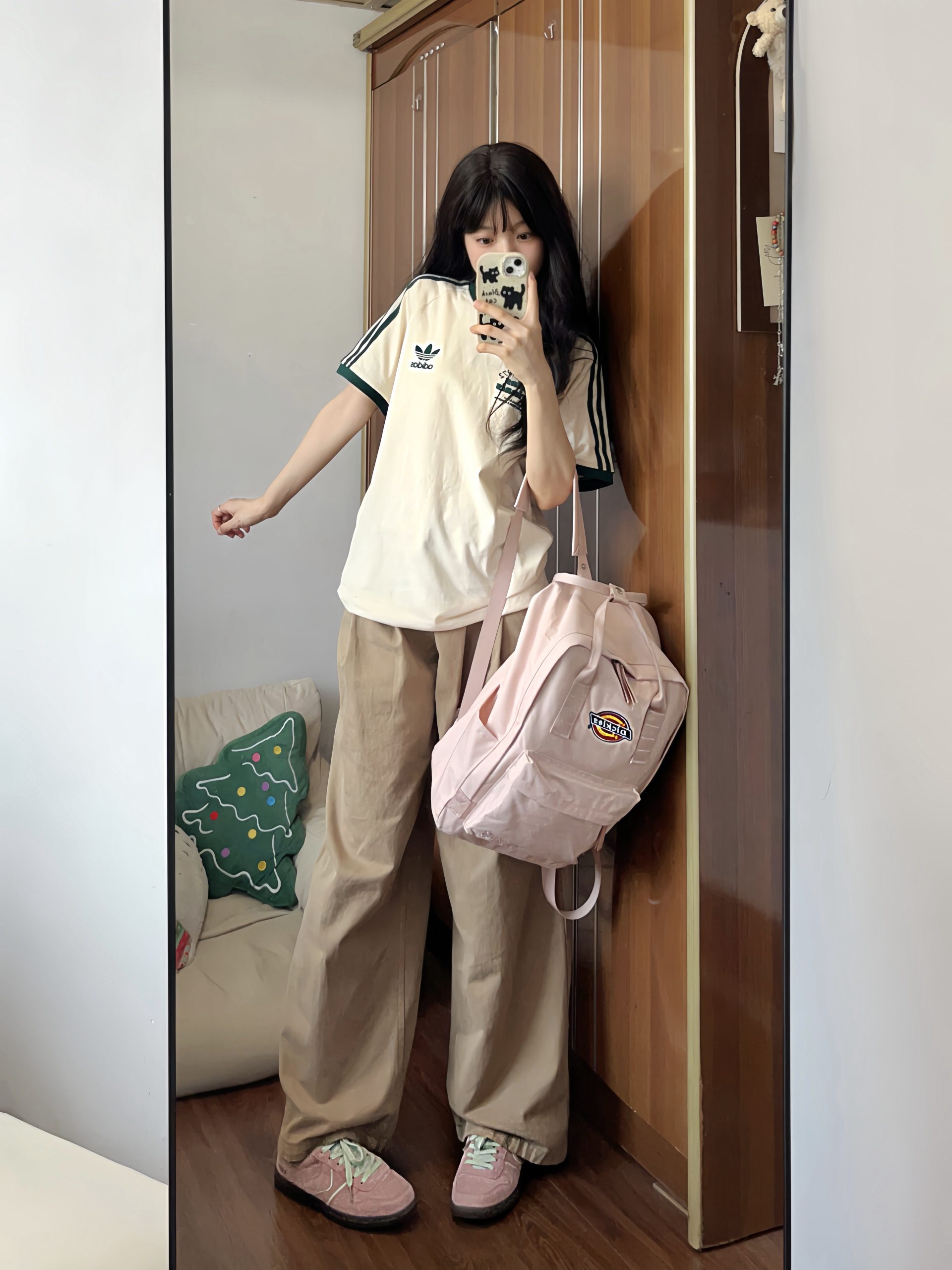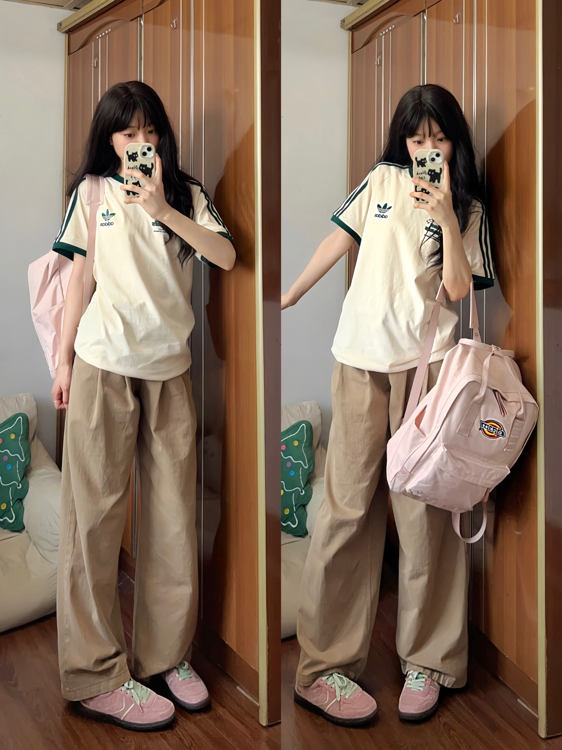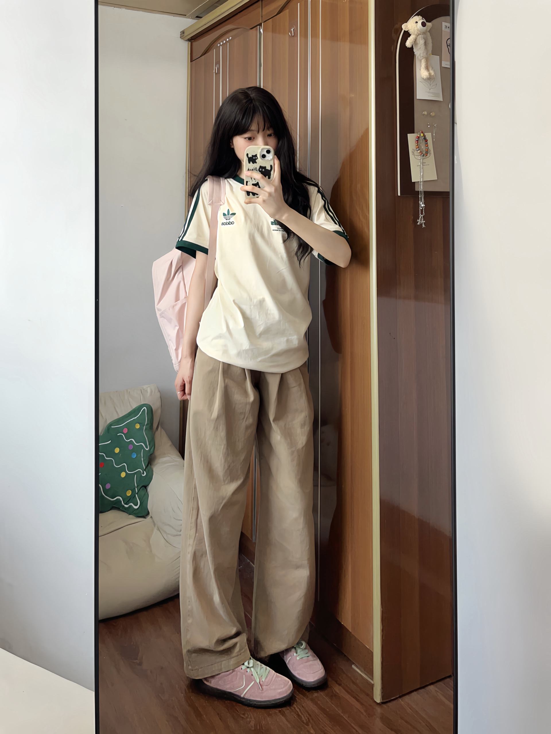 今日上身一件杏色短袖t恤 搭配卡其色牛仔阔腿裤✌🏻 低饱和配色真的好好看 粉色板鞋是点睛之笔✨ 舒适好穿又给穿搭增加亮点 最近种草的粉色双肩包也好喜欢🥰 上学或旅行背都OK✔️满满的学院风!!