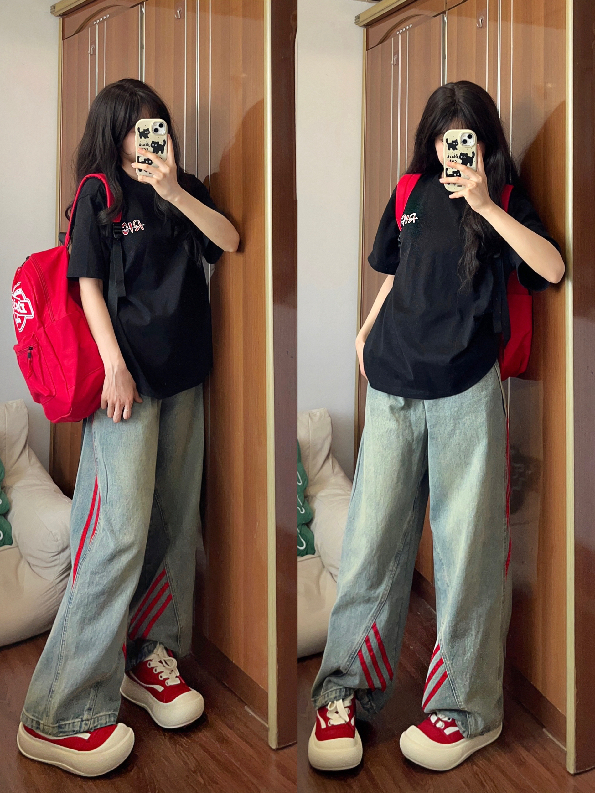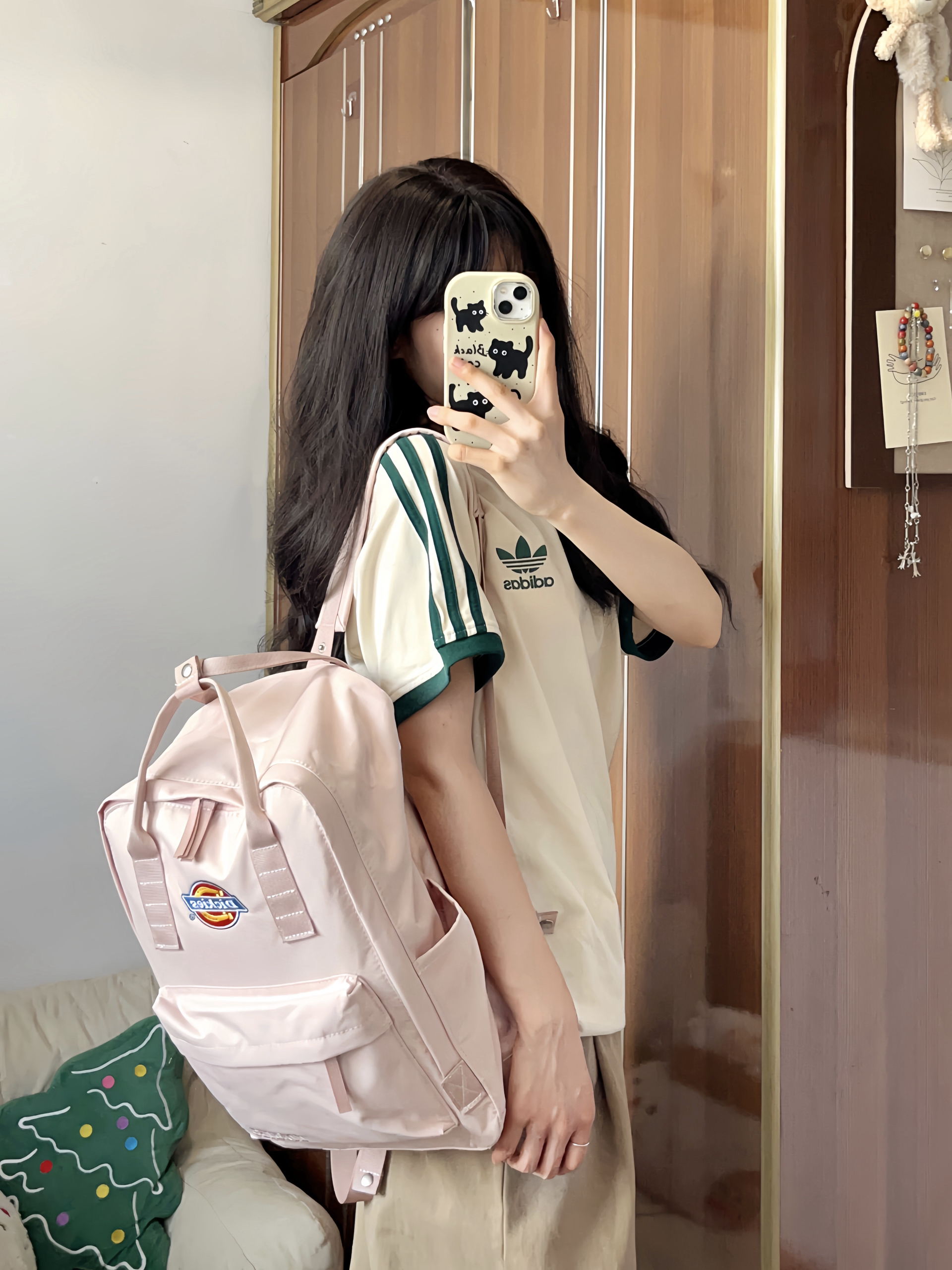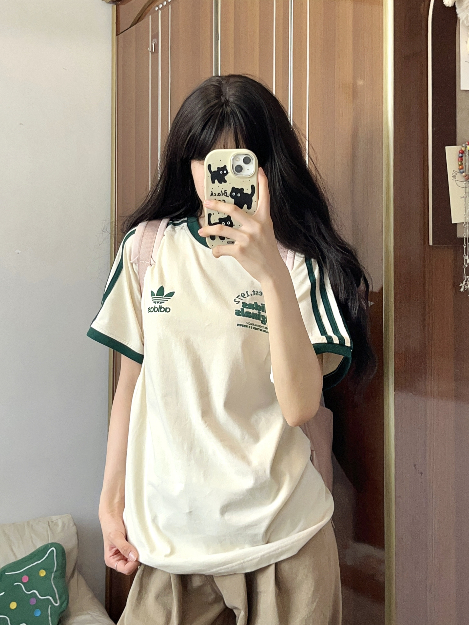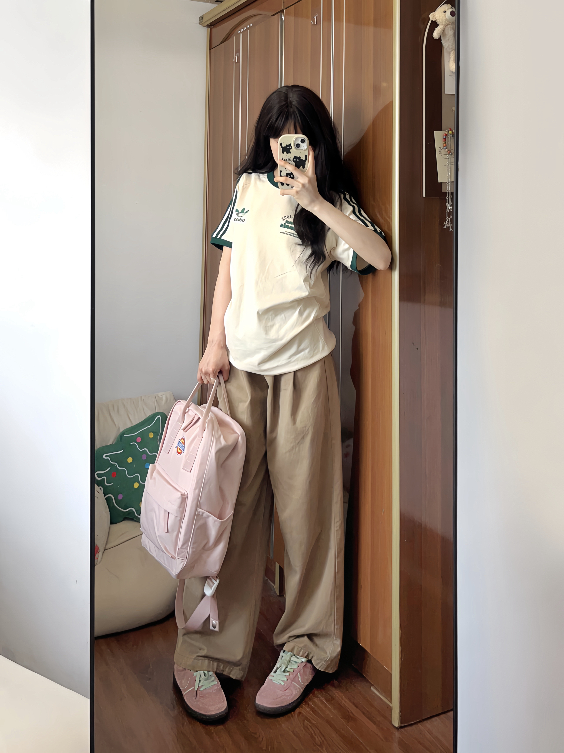今日上身一件杏色短袖t恤 搭配卡其色牛仔阔腿裤✌🏻 低饱和配色真的好好看 粉色板鞋是点睛之笔✨ 舒适好穿又给穿搭增加亮点 最近种草的粉色双肩包也好喜欢🥰 上学或旅行背都OK✔️满满的学院风!!