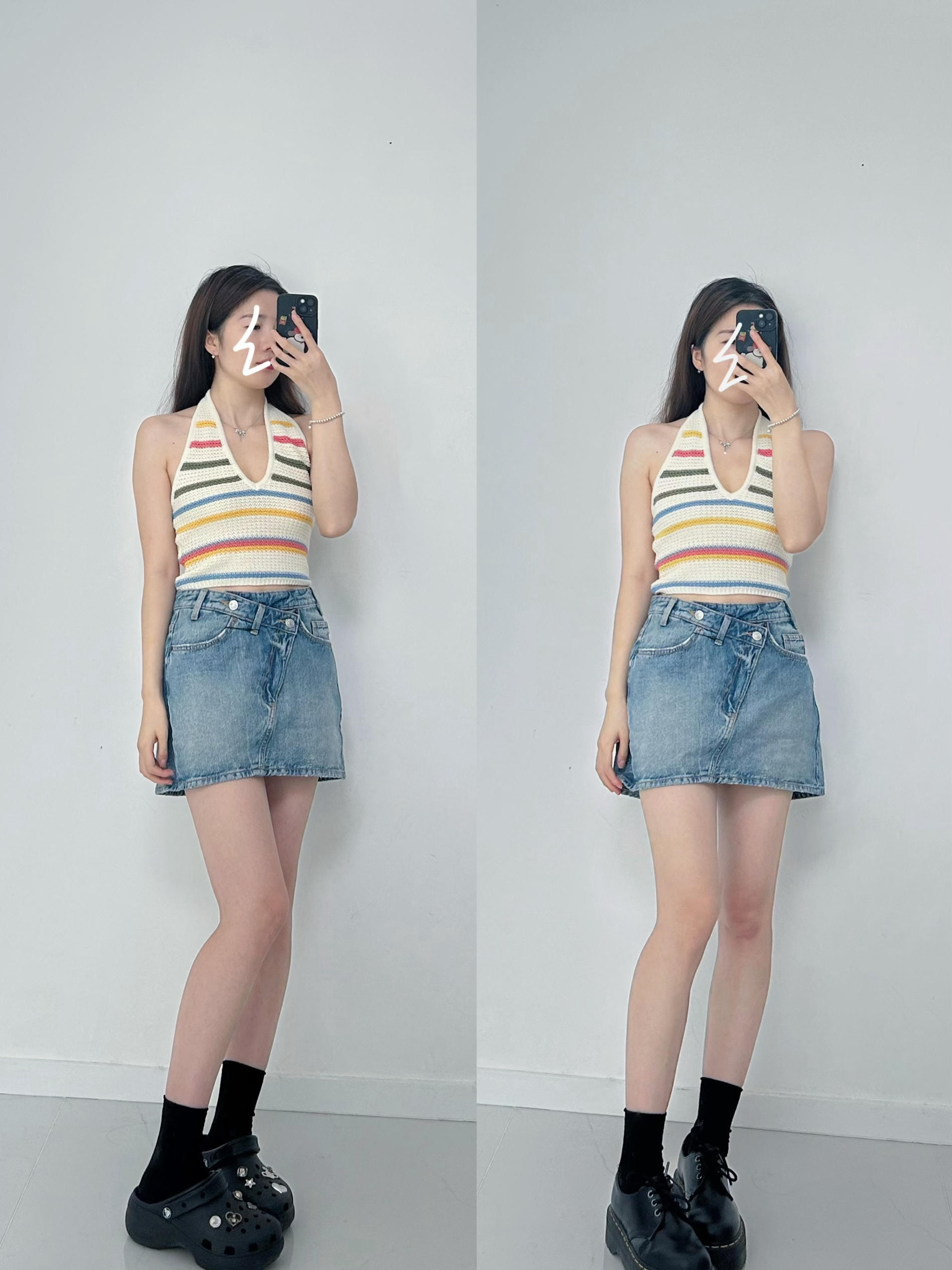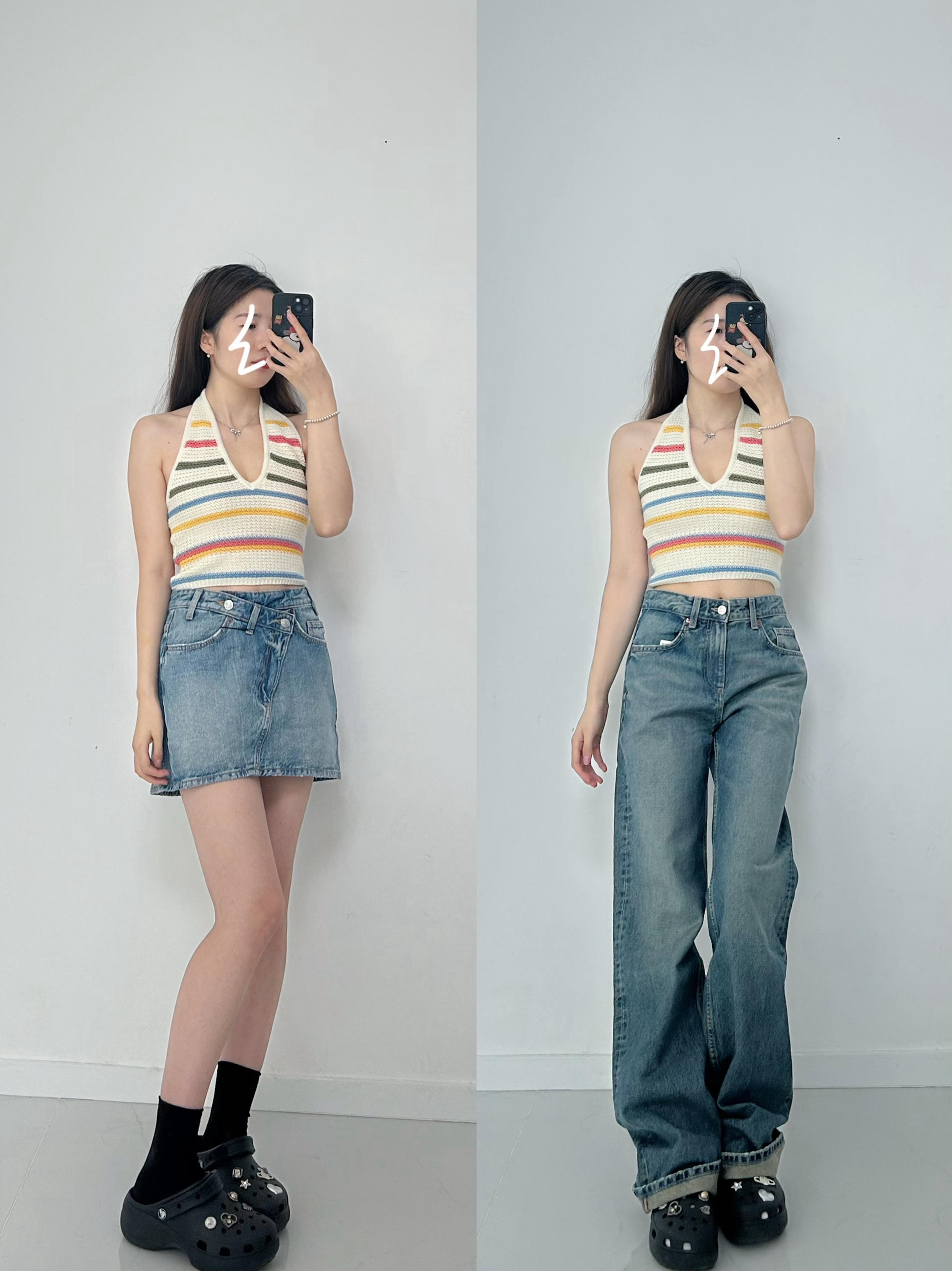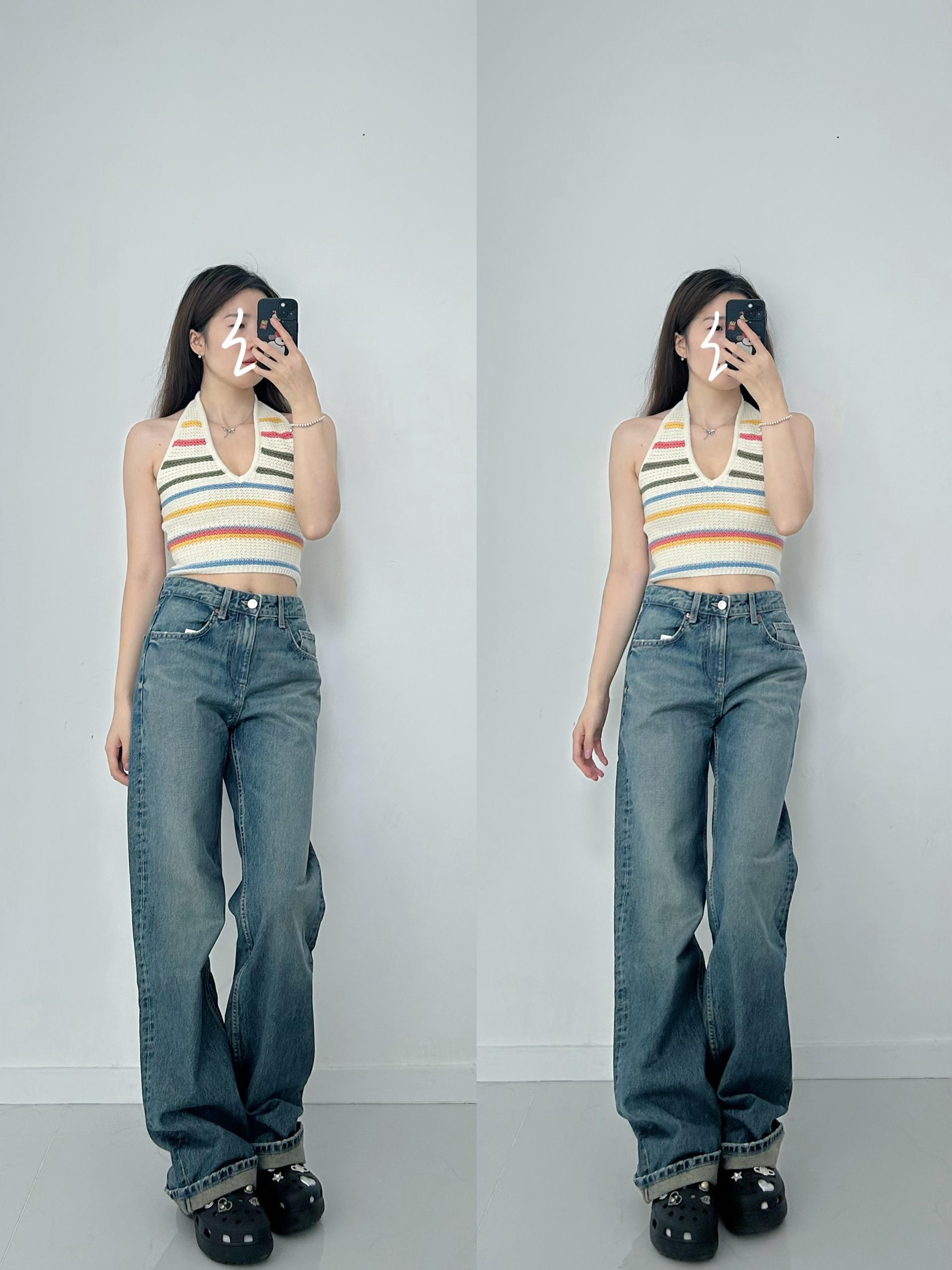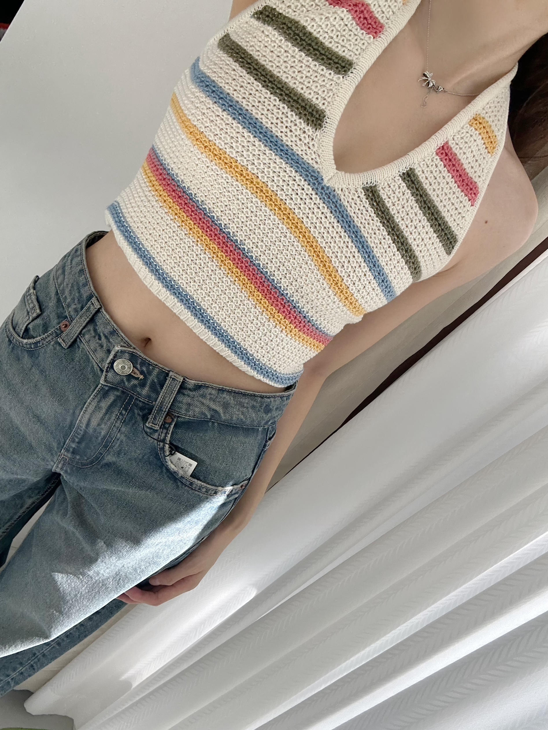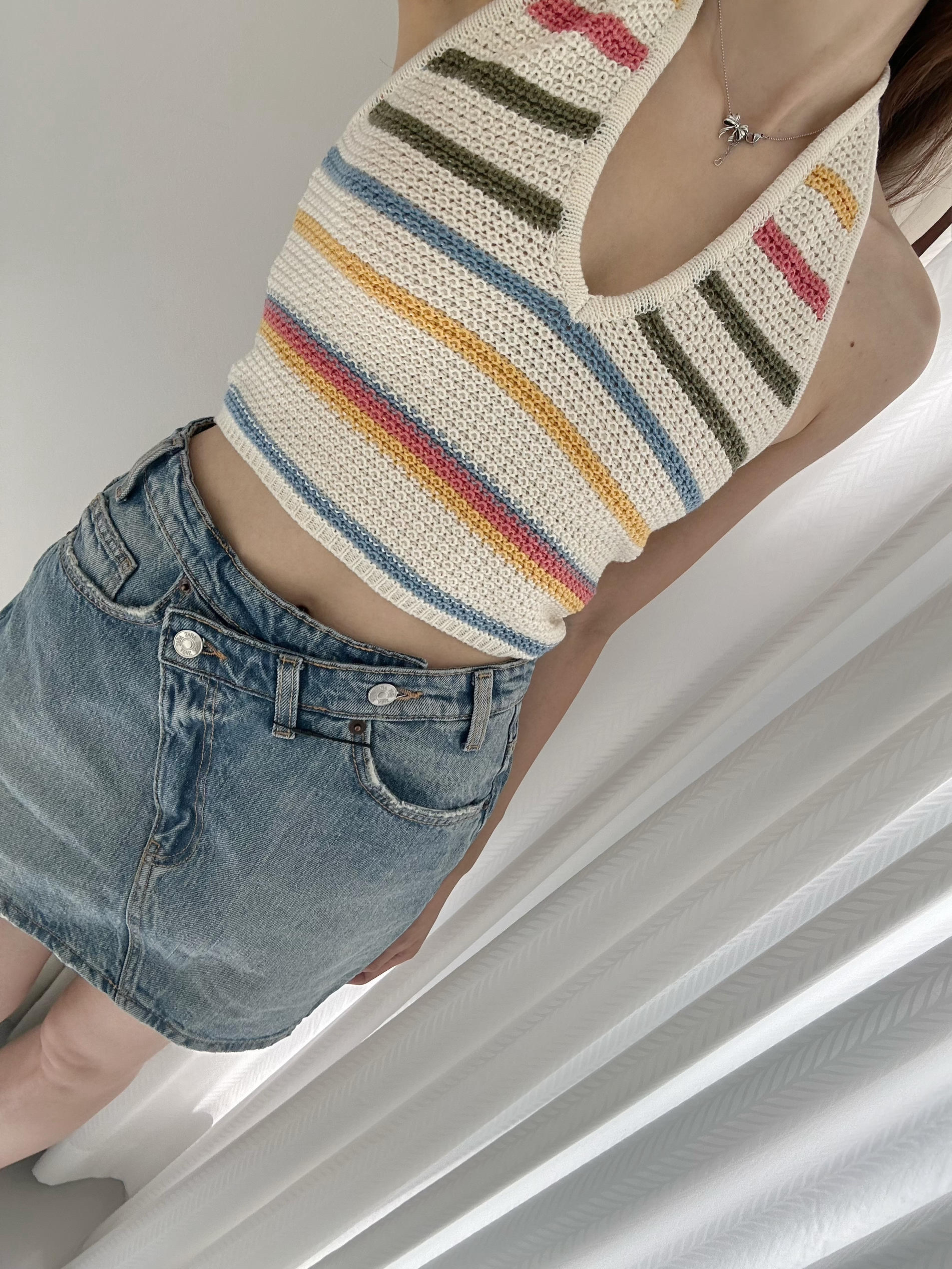 吊带是针织面料,设计了彩色条纹,很明媚的一件~ 🟡下装可以搭配牛仔半裙,或者直筒牛仔裤,简约好看 🔴适合出去玩穿,也可以当作海岛穿搭。 身高/体重:165.98 🎽:4813811 👗:2569292 400 👖:2569030 407