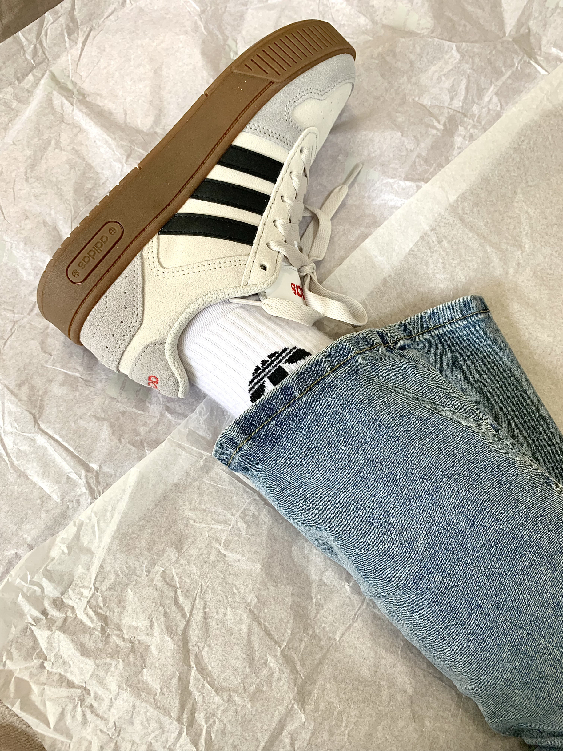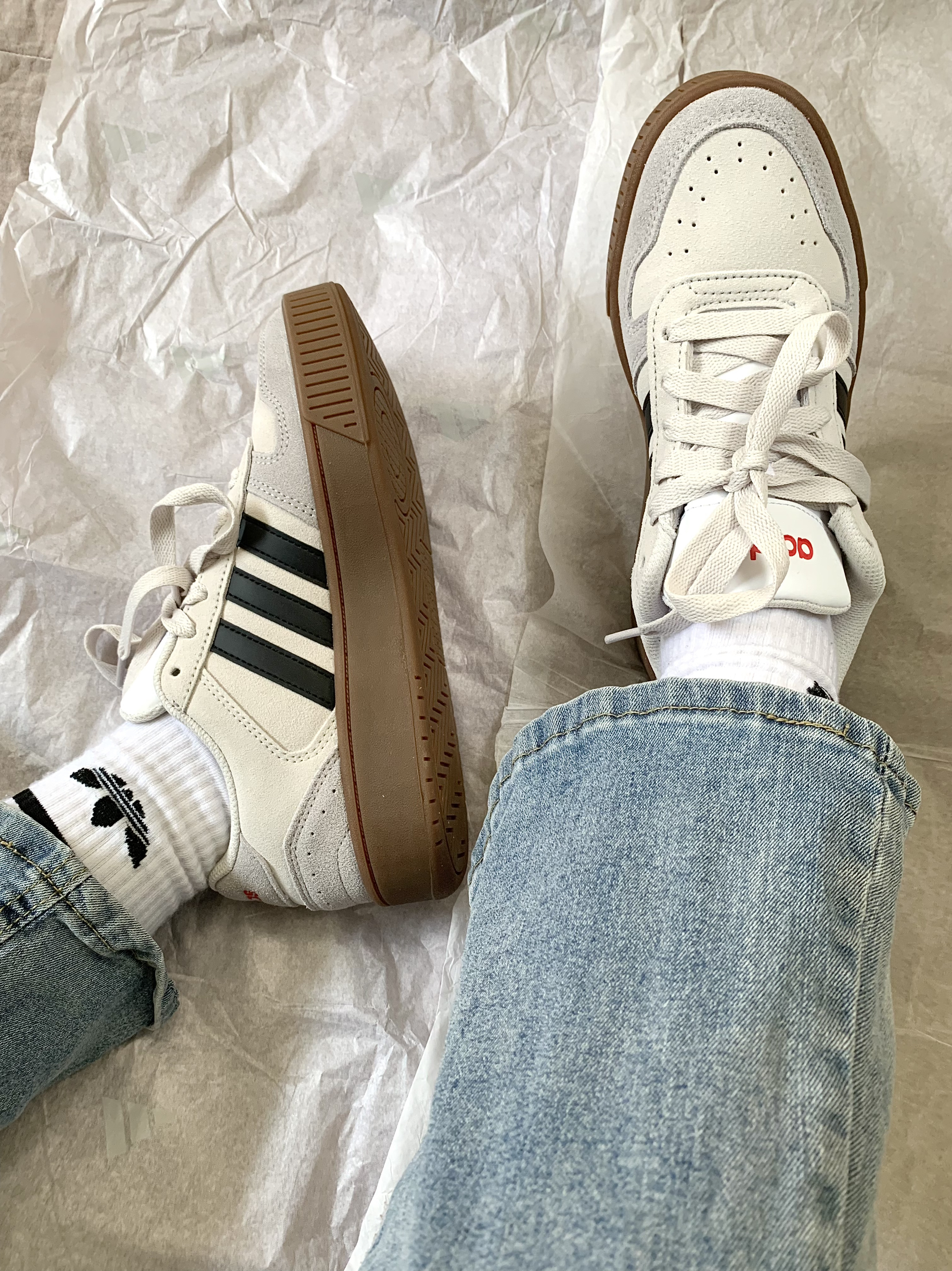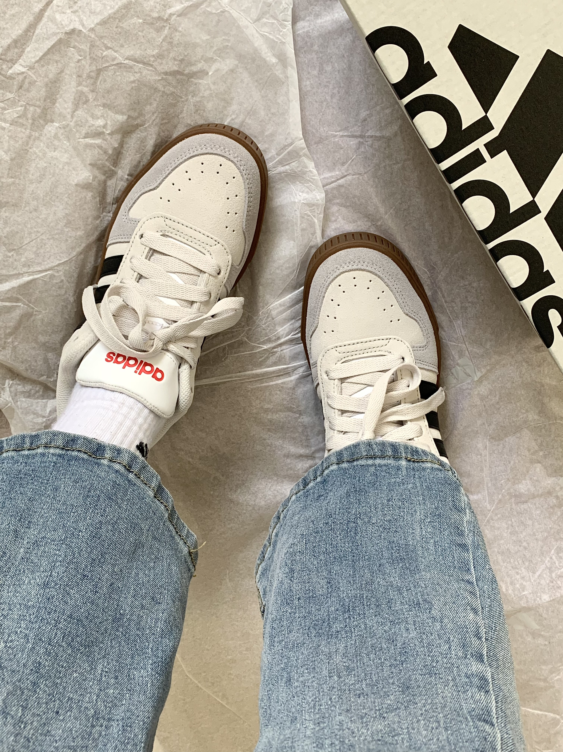 谁懂啊,我一眼入坑这双板鞋 大面积灰色麂皮,有深有浅拼接,很有层次感 侧面有经典黑色三条杠,鞋头旁边还设计了橡胶竖条整个复古感很足,非常清爽的颜色,我觉得比 德训鞋还好看些,价格才290➕ 性价比高叻 鞋舌跟后跟的Logo是硅胶一样的 有凹凸感,细节部分我觉得做得还不错,不是我说这个鞋垫也太柔软了吧,穿上我都不想脱下来了[捏捏_blue]