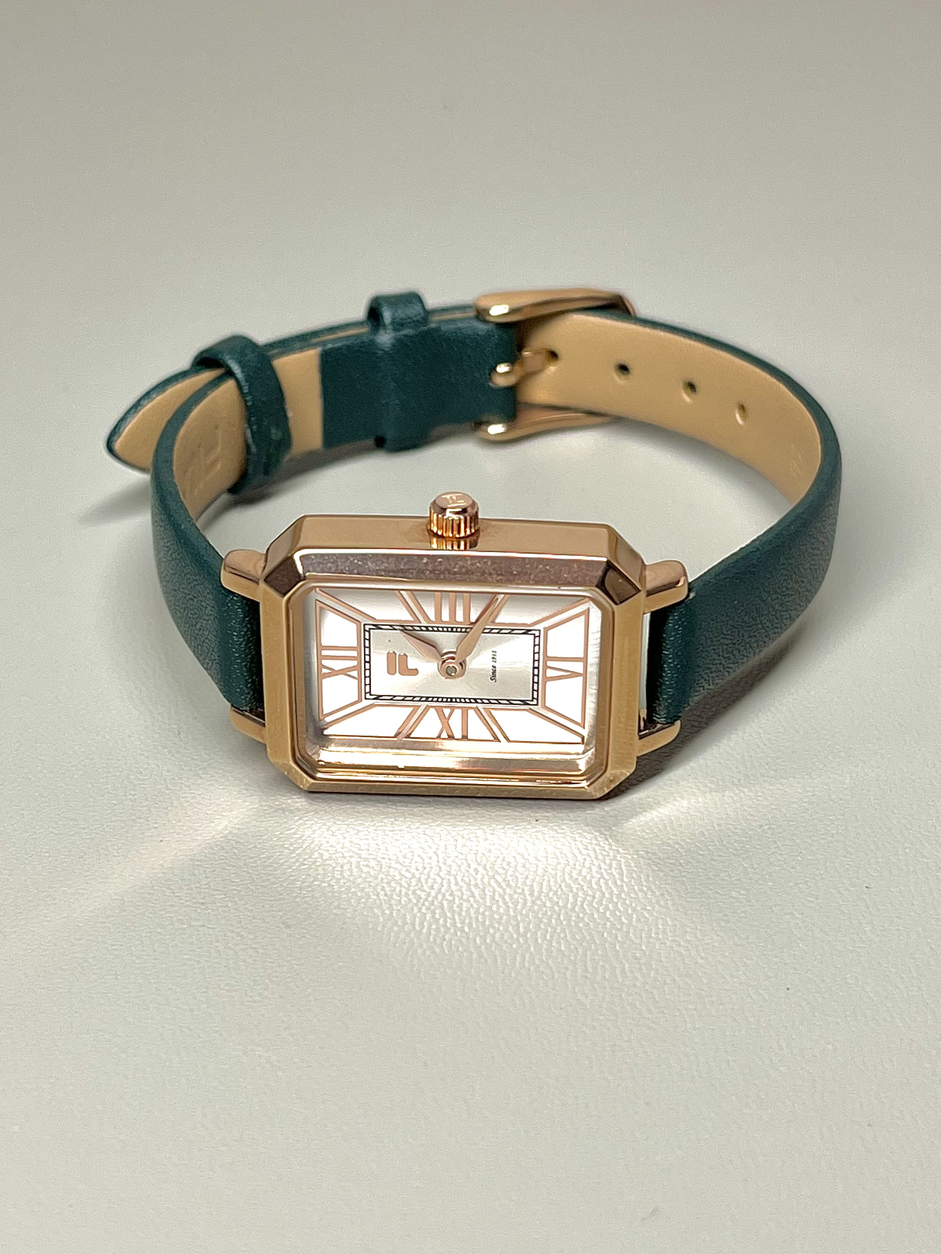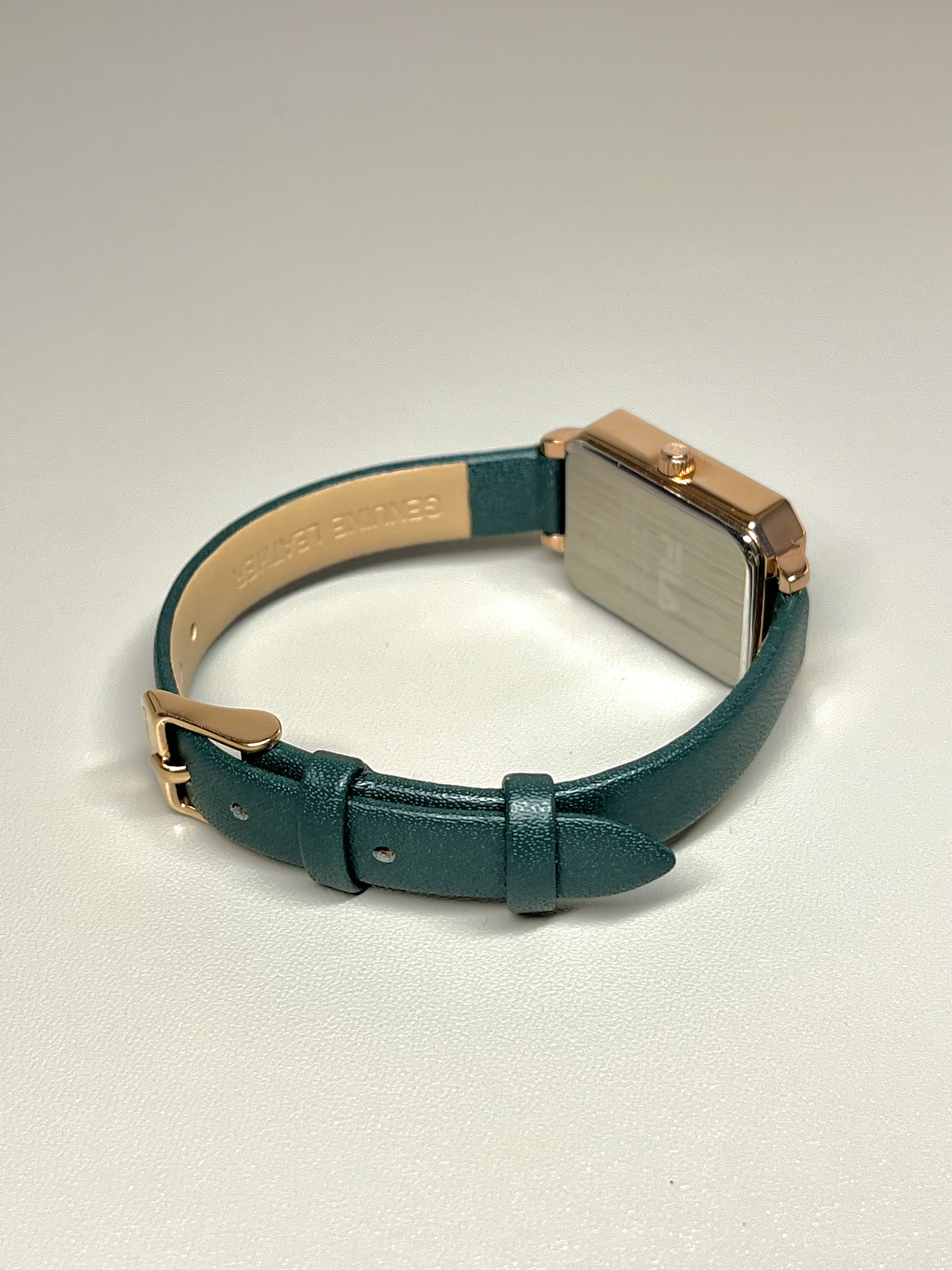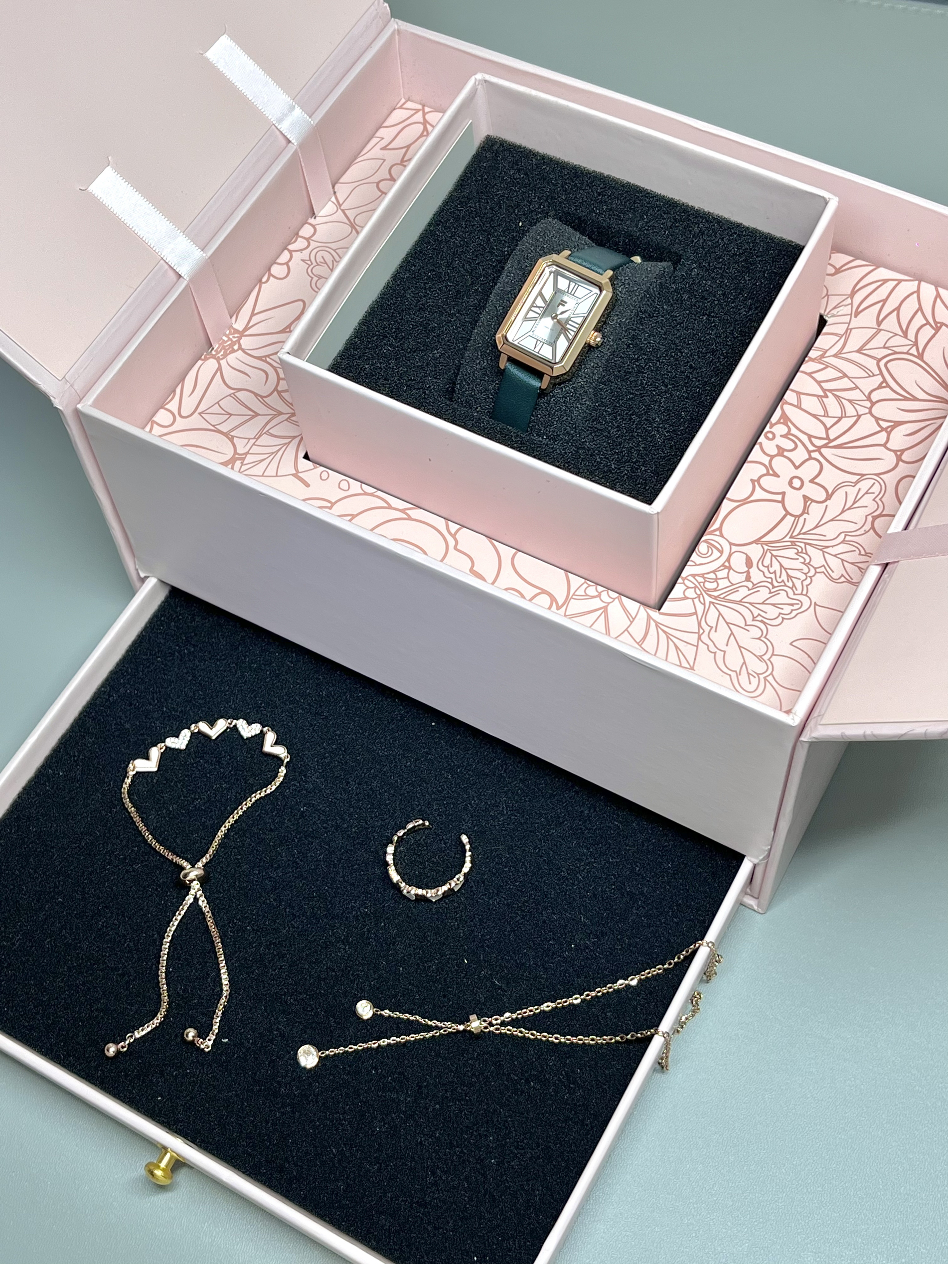 这个粉嘟嘟的礼盒拿捏住我的审美了 盒子粉粉嫩嫩 里面的手表也蛮精致 绿色的细手表戴起来沉稳成熟 皮质的表带还蛮有质感的 我觉得刚出来工作的女孩子戴是合适的~