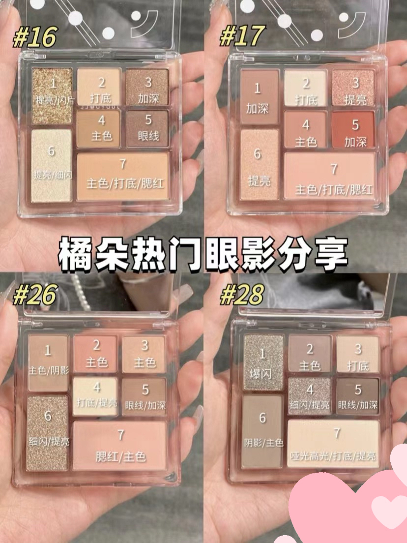 干货局!橘朵热门盘敲全眼影配色公式来咯!! 颜色由浅到深:眼窝打底—双眼皮褶皱处和下眼睑晕染铺色—眼尾加深 亮片细闪色:提亮眼中(清透亮片提亮卧蚕和眼角) 无论是白皮、黑皮、新手、肿泡眼还是单眼皮的妹纸都适合的一款眼影盘! 橘朵这盘眼影简直把秋冬的氛围感拉满了🉑❤️ 4个哑光色+3个珠光细闪都是消肿神器 喜欢的千万别错过👍➕💬