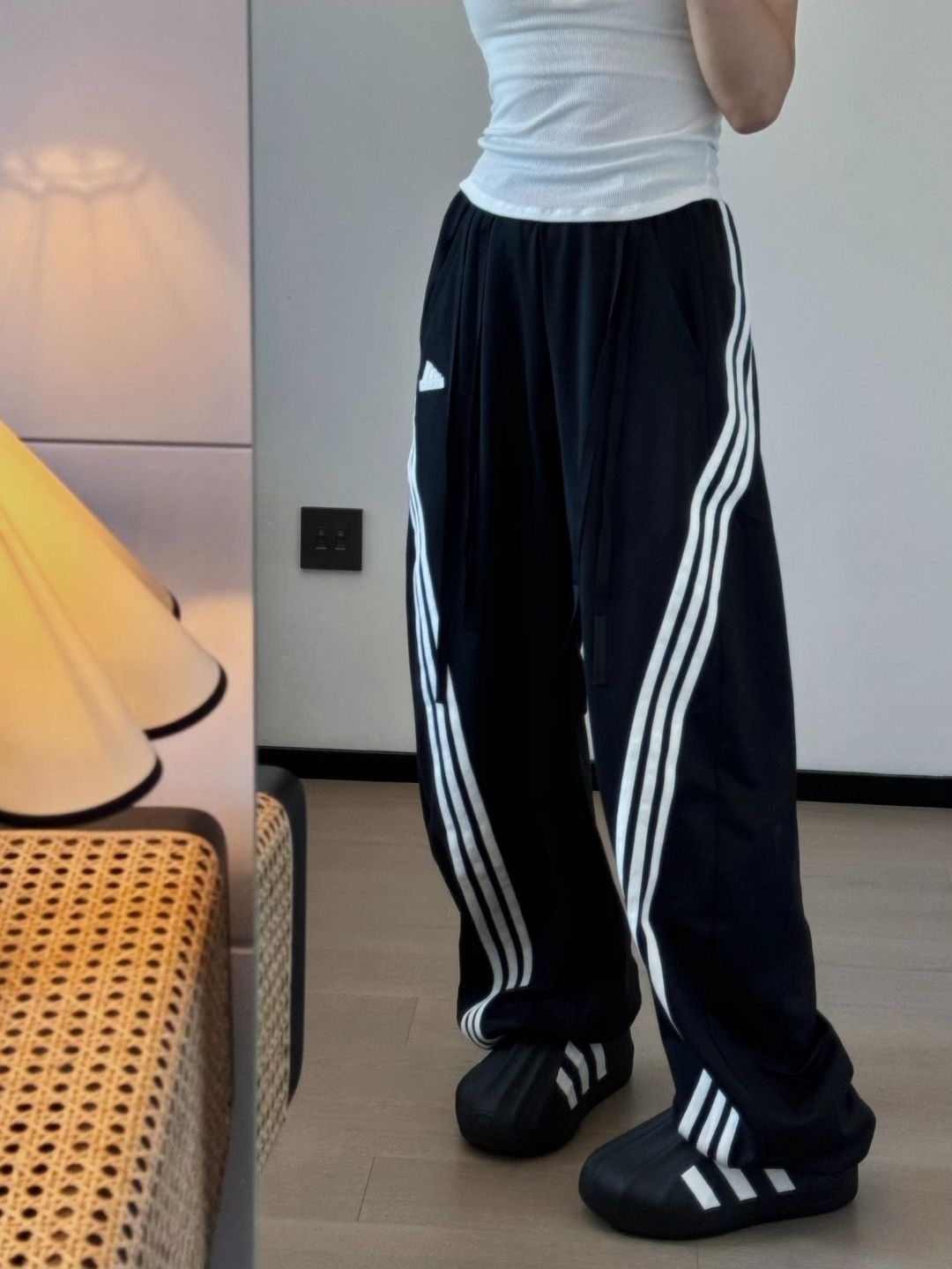 😀😀😀Adidas/阿迪达斯 2024SS 三条纹直筒阔腿抽绳高腰轻运动宽腿廓形速干香蕉裤卫裤休闲长裤 女装 🤓🤓🤓170/54 上身裤子M 这款开扣酷真的好穿到爆 料子超舒服 穿脱也很方便😘😘 好适合当情侣裤穿 酷型也是超级显瘦的 💤💤好爱好爱~