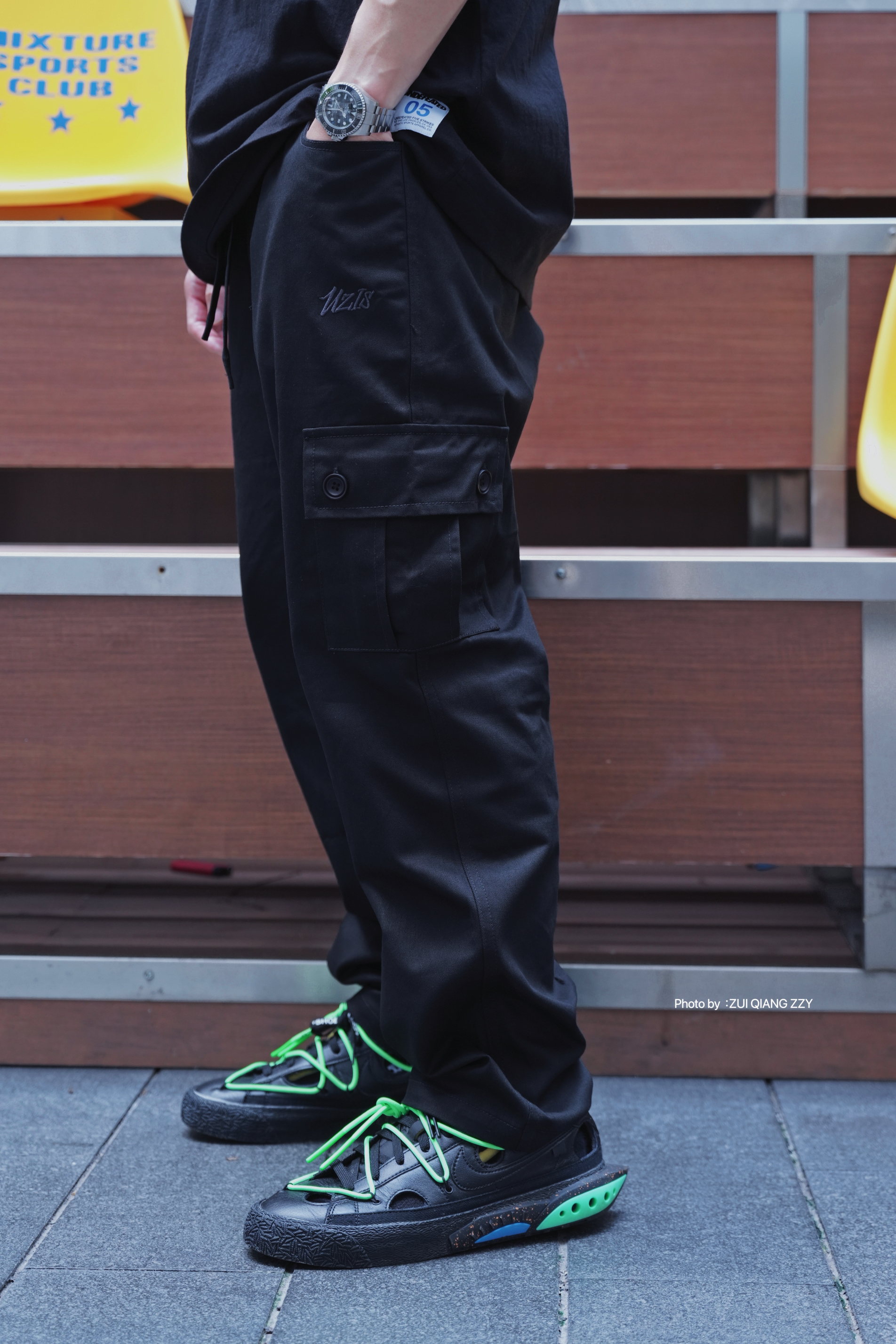 -这次跟大家分享一下来自-有志者UZIS的工装裤-山语系列;两侧大口袋加上横口袋,美式工装风格满满;最近吃多了也没在怕,弹性腰围,还带扁绳子方便系紧,细节。整体偏宽直筒设计,舒服。还有一个小细节,左边口袋附近有“有志者UZIS”刺绣标识,蛮有质感。 -入秋选择搭配偏美式T恤和解构风格的OW-nike联名的Blazer low,蛮不错~