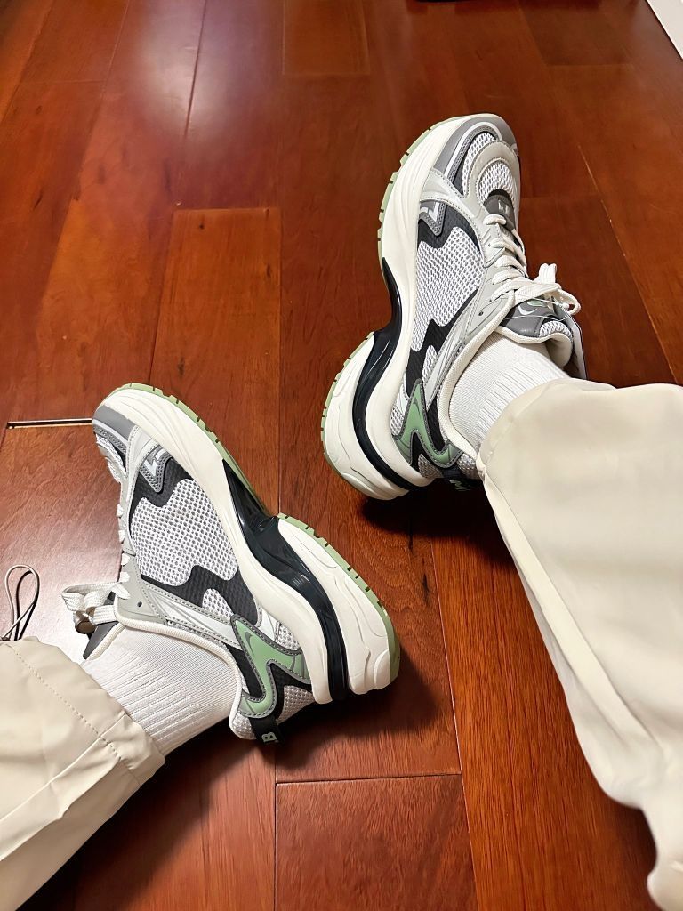 这双老爹鞋真的很好穿呐 看起来好像很厚重 但实际上很轻便 底子厚 有增高的效果 大概能加个3厘米 矮子乐的福音 脚感也很nice 并不是看起来的那么硬 白黑绿的配色上脚很好看 感觉自己又潮起来了