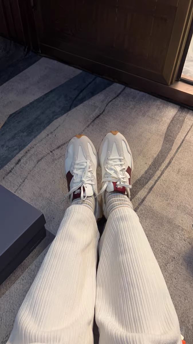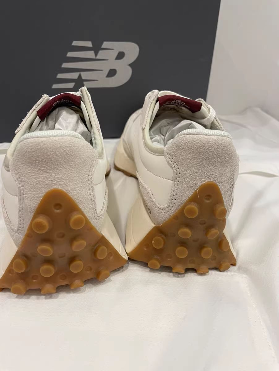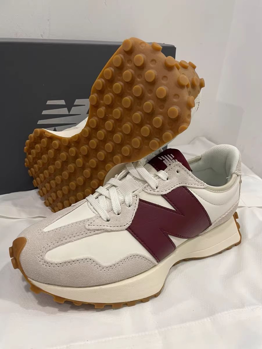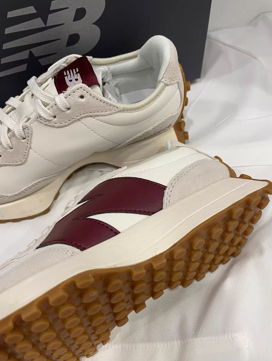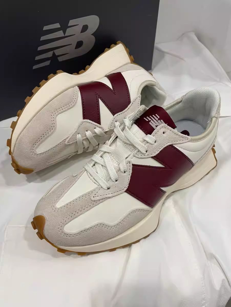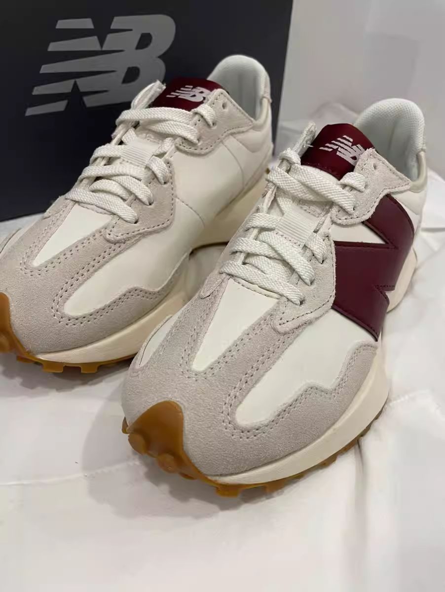 NB327小蛮腰这款鞋超显脚小高级百搭,侧颜 杀米白十藏品的logo赞,牛津底搭配还是很耐磨 滴,后跟倒三角设计造型独特,酒红色跟海盐 蓝经典全皮款超级棒~