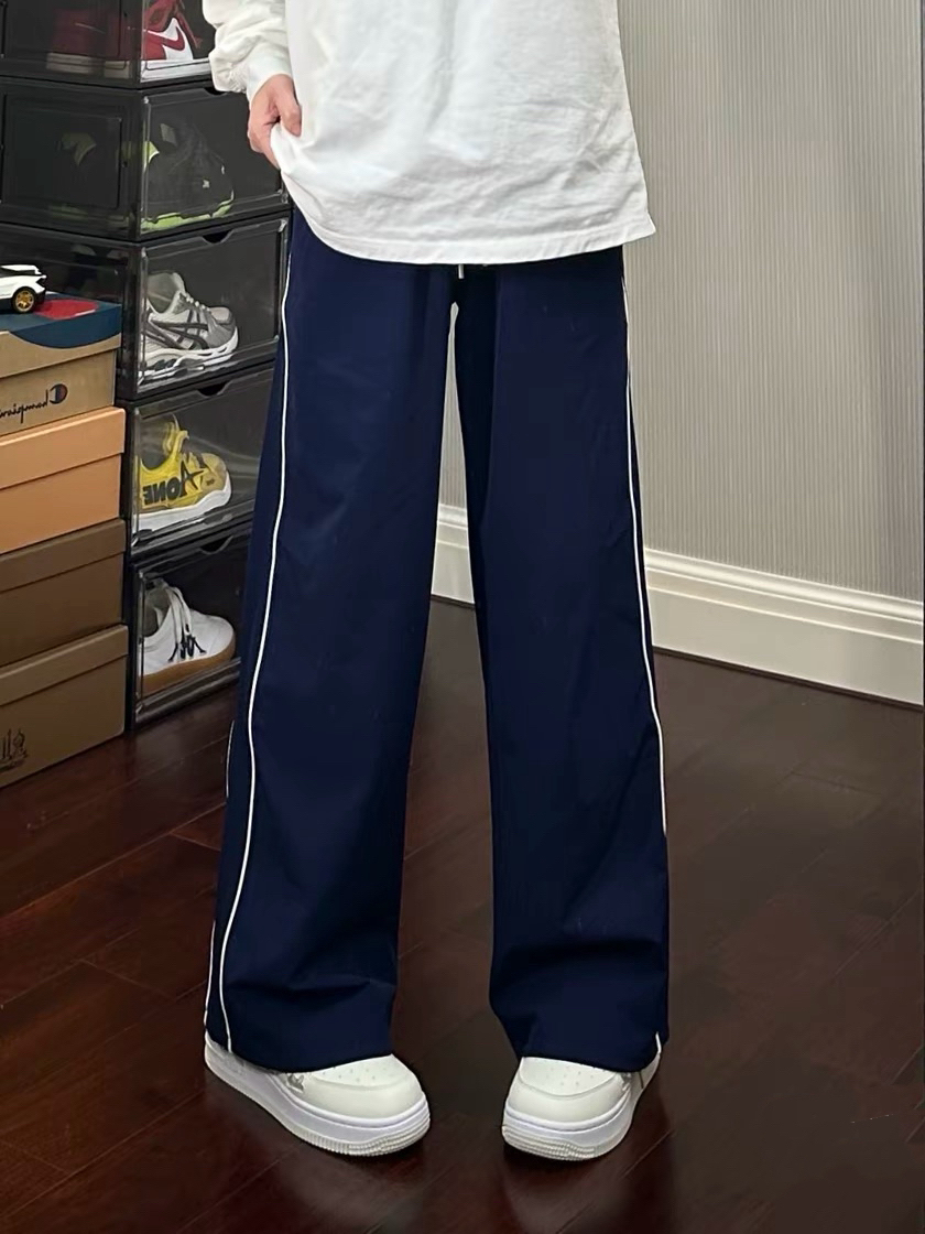 这条藏青色条纹工装裤有点帅!!! 这条藏青色条纹工装裤有点帅!!!美式复古高街风太帅了,侧边条纹左侧口袋处刺绣设计很好看也很百搭,直筒宽松阔腿裤遮肉显腿长,腰围带有松紧带很好穿,并且还是男女同款,这款休闲裤子很适合跳舞,真的很帅!好穿爱穿!
