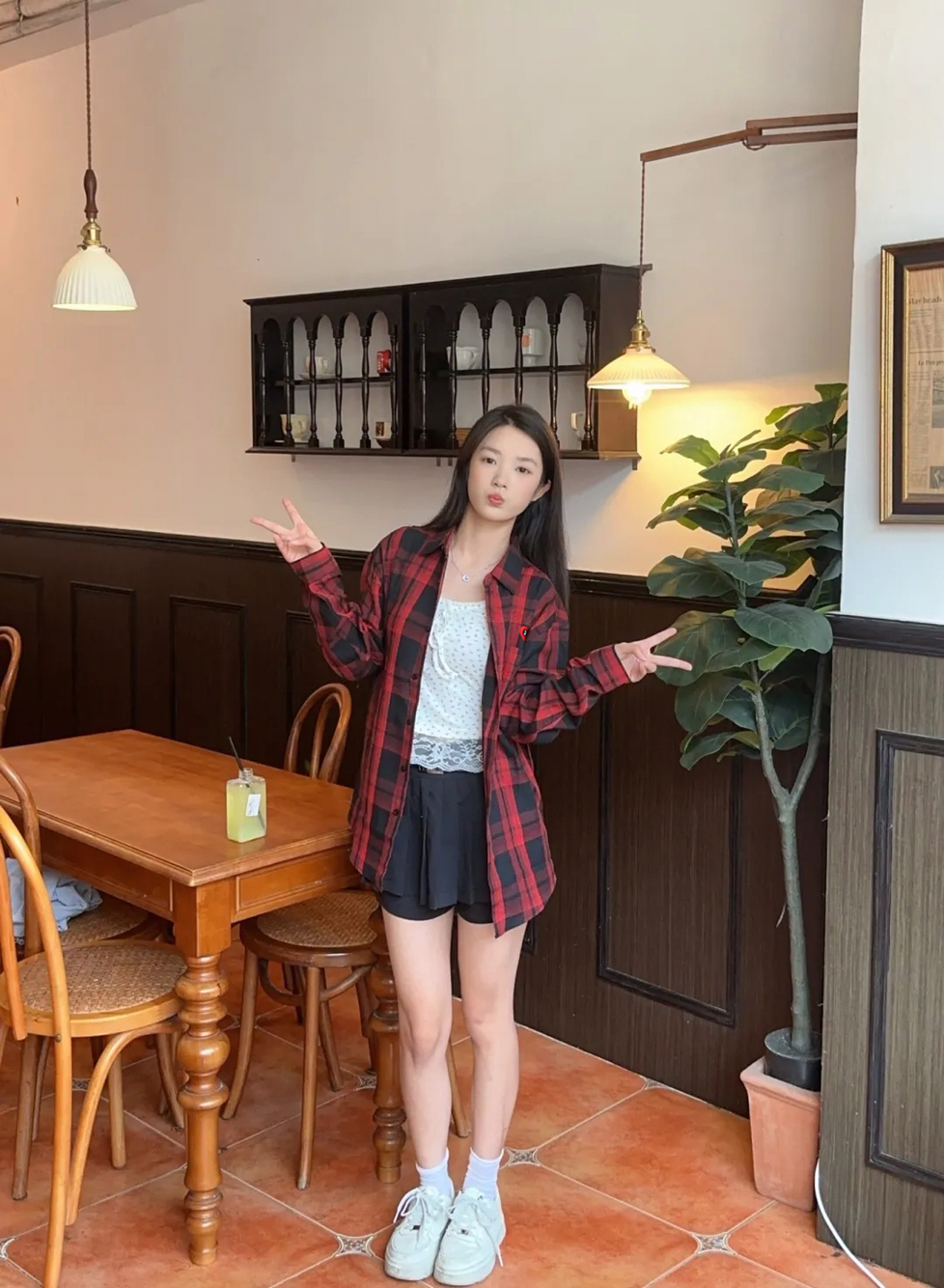谁说穿格子衬衫的都是程序员?也有可能是大学生,下身搭配一条宽松的黑色长裤,黑红配色,高级又耐看,还不挑人,这样的慵懒氛围真的爱了