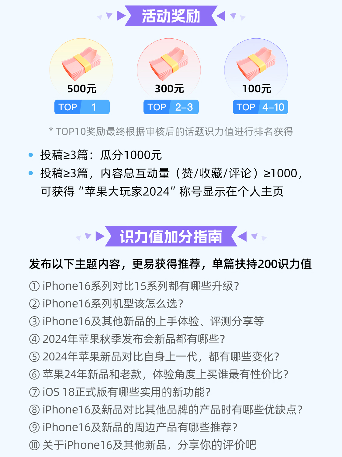 iPhone16终于发布啦!大家觉得怎么样呀? 数码君诚邀各位识货er参与讨论!在社区分享任意你对苹果2024年新品相关内容,并关联话题#苹果大玩家# 即可参与到活动中!瓜分上千元的奖励!还有机会获得独特【苹果大玩家2024】显示在个人主页哟! 🎁活动奖励 TOP 1:500元 TOP 2~3:300元 TOP 4~10:100元 投稿≥3篇瓜分:1000元 投稿≥3篇,内容总互动量(赞/收藏...