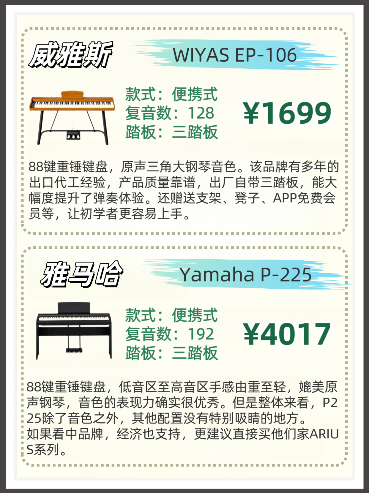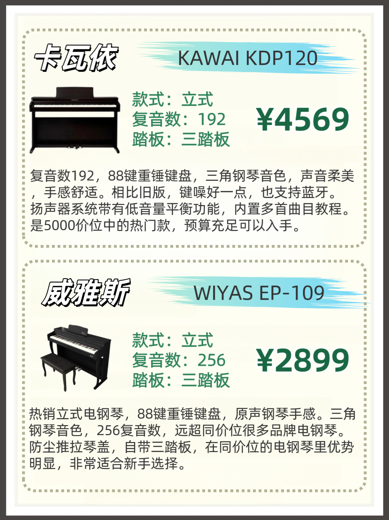 本篇笔记关联了KAWAI/卡瓦依 KDP120/KDP110专业考级立式电子钢琴 KDP110GR檀木色+琴凳+重锤、Wiyas/威雅斯 EP-109 88键重锤专业演奏立式推拉盖电钢琴 高箱木纹黑、Wiyas/威雅斯 EP-106初学者专业演奏88键便携电钢琴 原木色+X架等商品,为用户提供真实的使用体验和购买参考。
