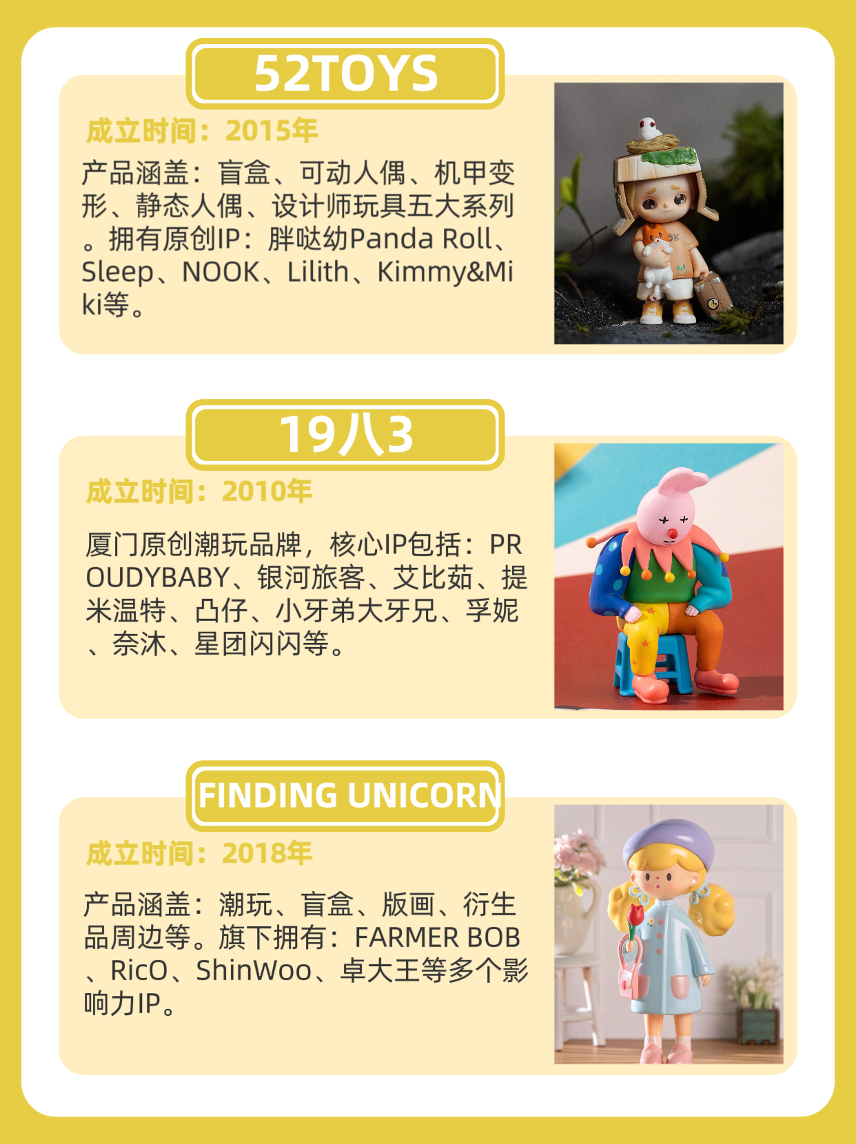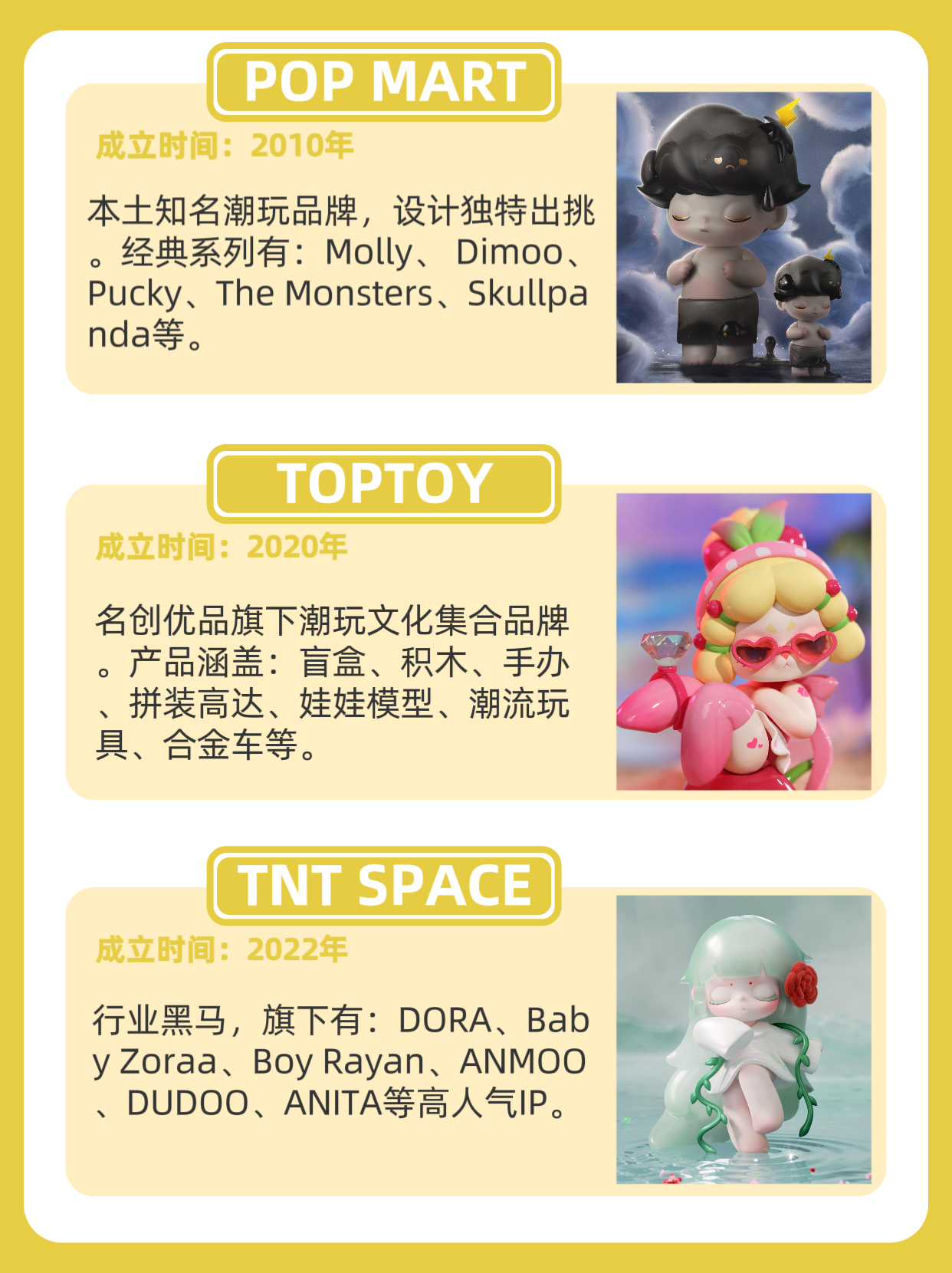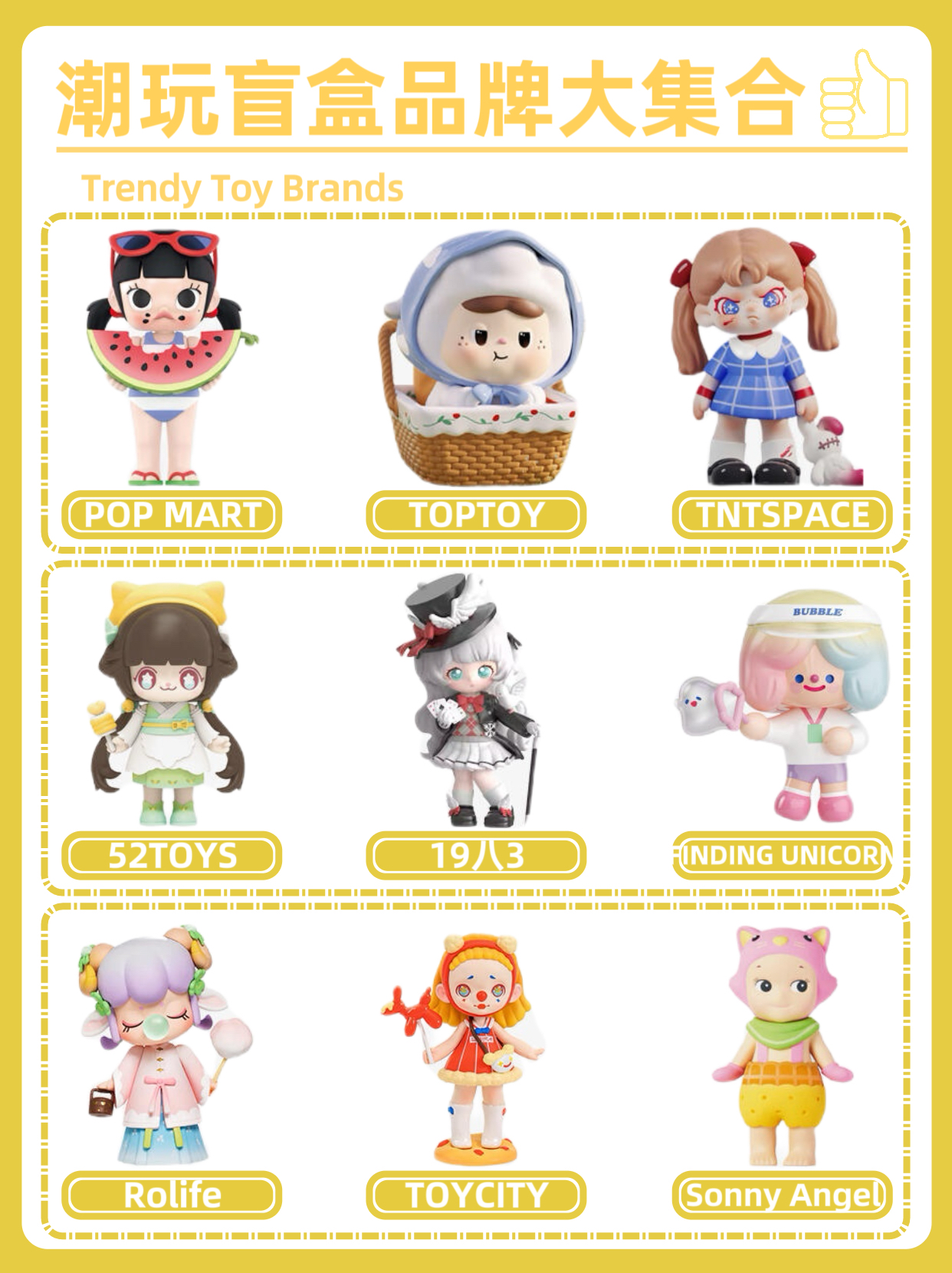 🦆潮玩似乎已成为了年轻人的生活方式,碰到喜欢的很难抵挡诱惑。今天就来盘点一下九个年轻人喜爱的潮玩品牌,看看是谁“掏空”了你的腰包? POP MART泡泡玛特: 本土知名潮玩品牌,成立于2010年,设计独特出挑。经典系列有:Molly、 Dimoo、Pucky、The Monsters、Skullpanda等。 TOPTOY: 名创优品旗下潮玩文化集合品牌,成立于2020年。产品涵盖:盲盒、积木...