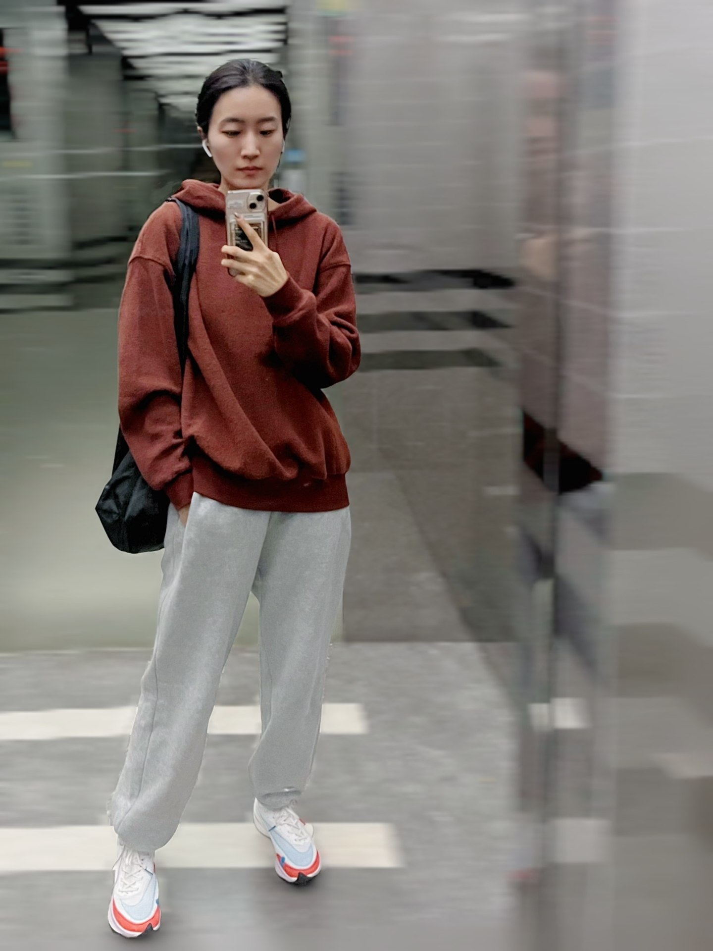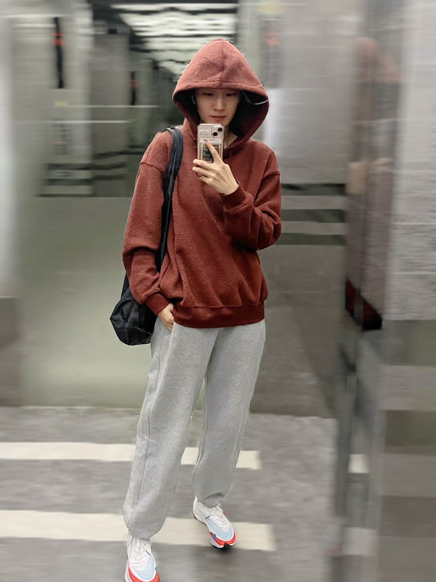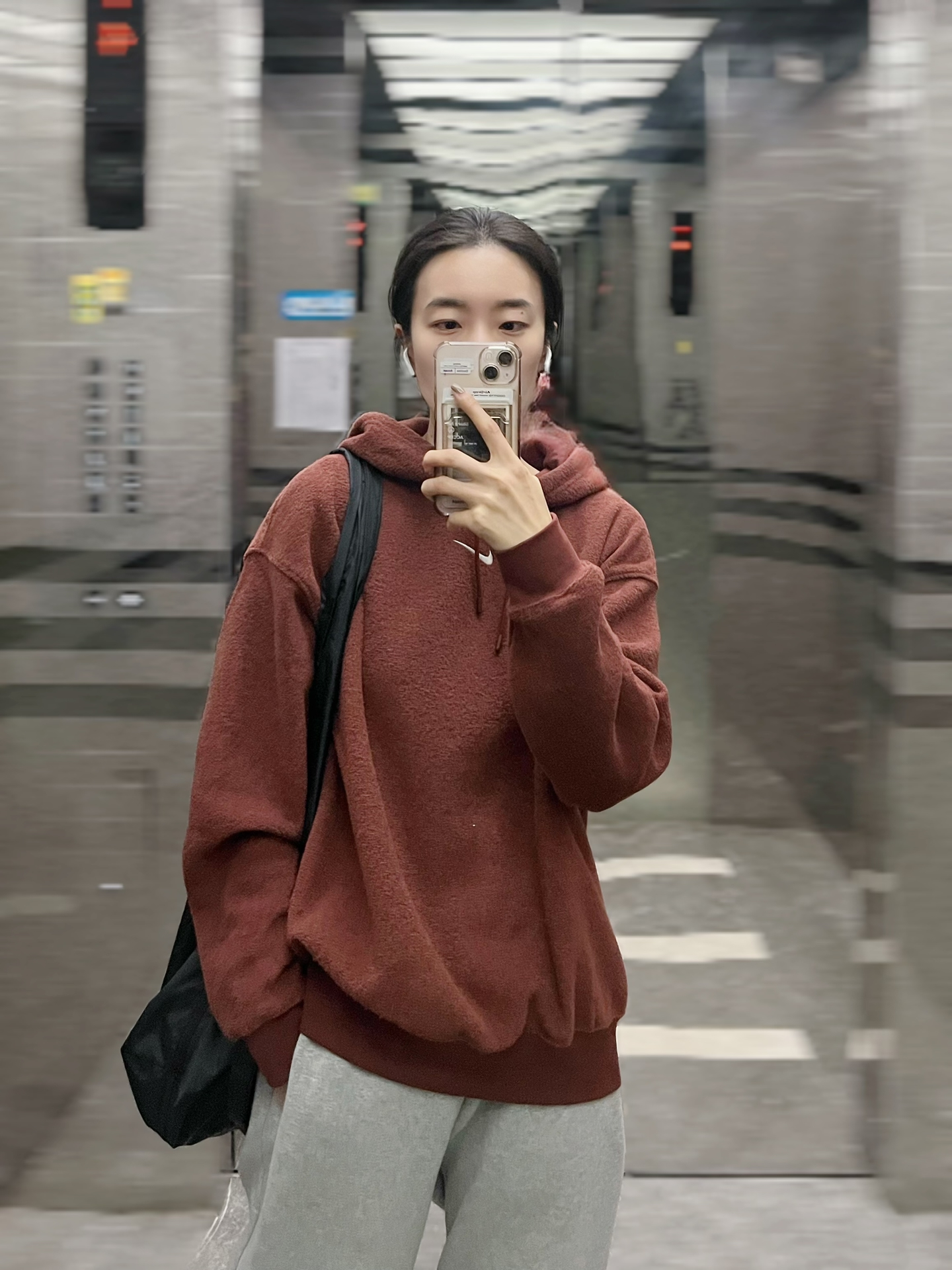 今天要去健身房所以卫衣卫裤安排上,冬天这样穿外面套个羽绒服真的太舒适了。 卫衣:nike 外面毛绒绒的手感很好,里面有内衬不会扎。今年美拉德流行,栗色也很好看显白。这件穿M码。 卫裤:韩火火,穿了好多年,被问了好多次。不知道店里现在还有没有这款了。 鞋子:咱就这一双跑鞋,目前还处于热恋期,可不得天天穿。 包包:优衣库的大兜子,很轻便能装。放个衣服很合适。 下班后怒跑7km。 #冬日潮服新公式 #冬...