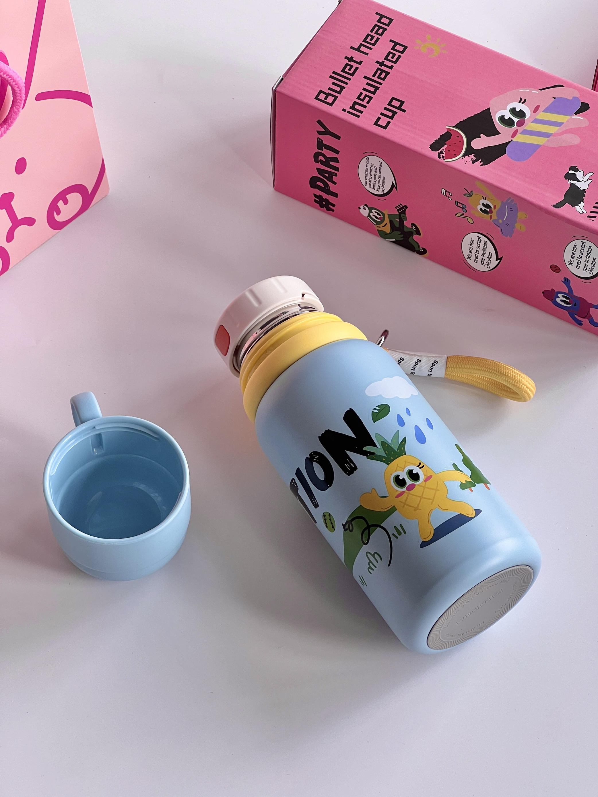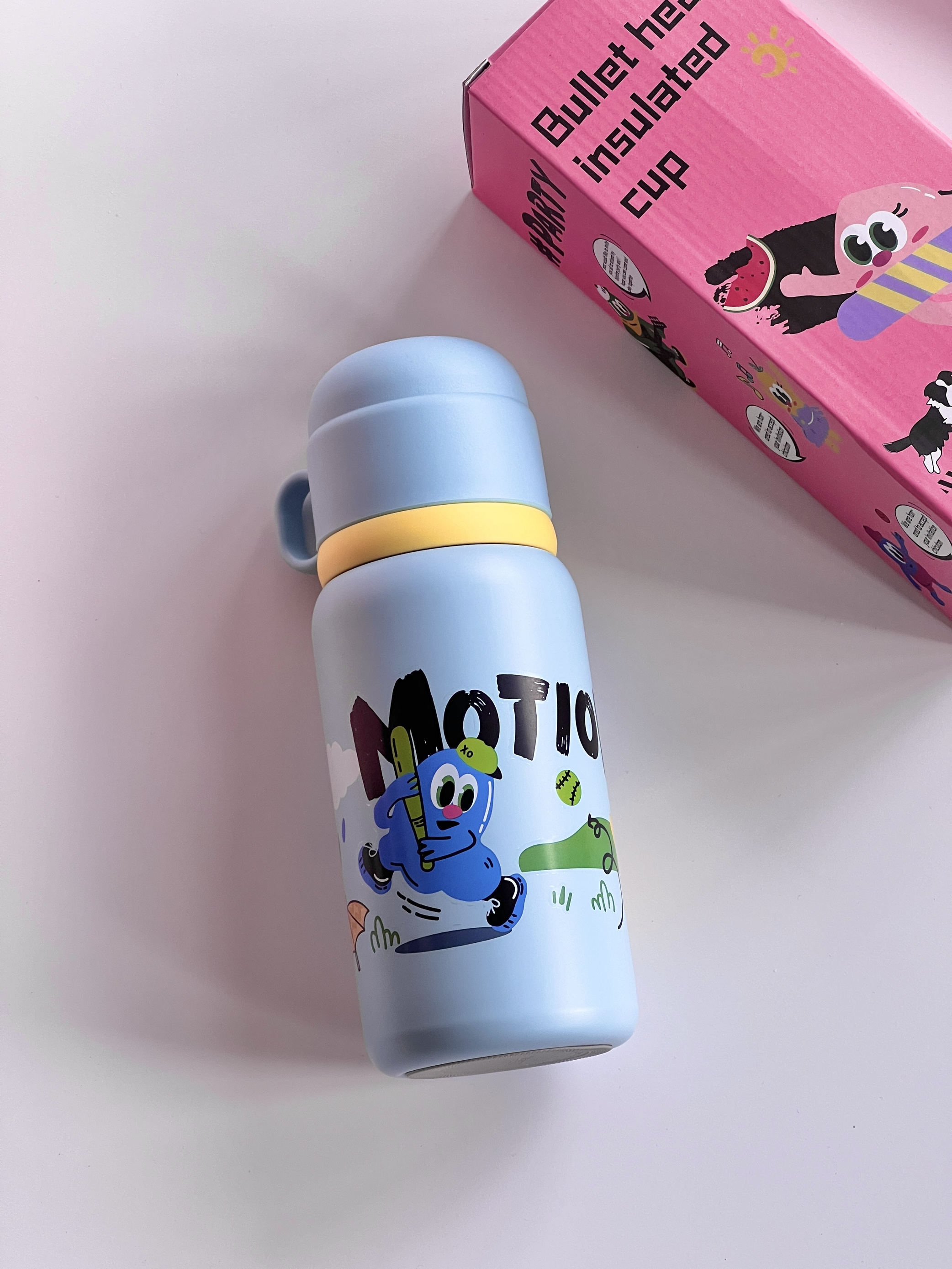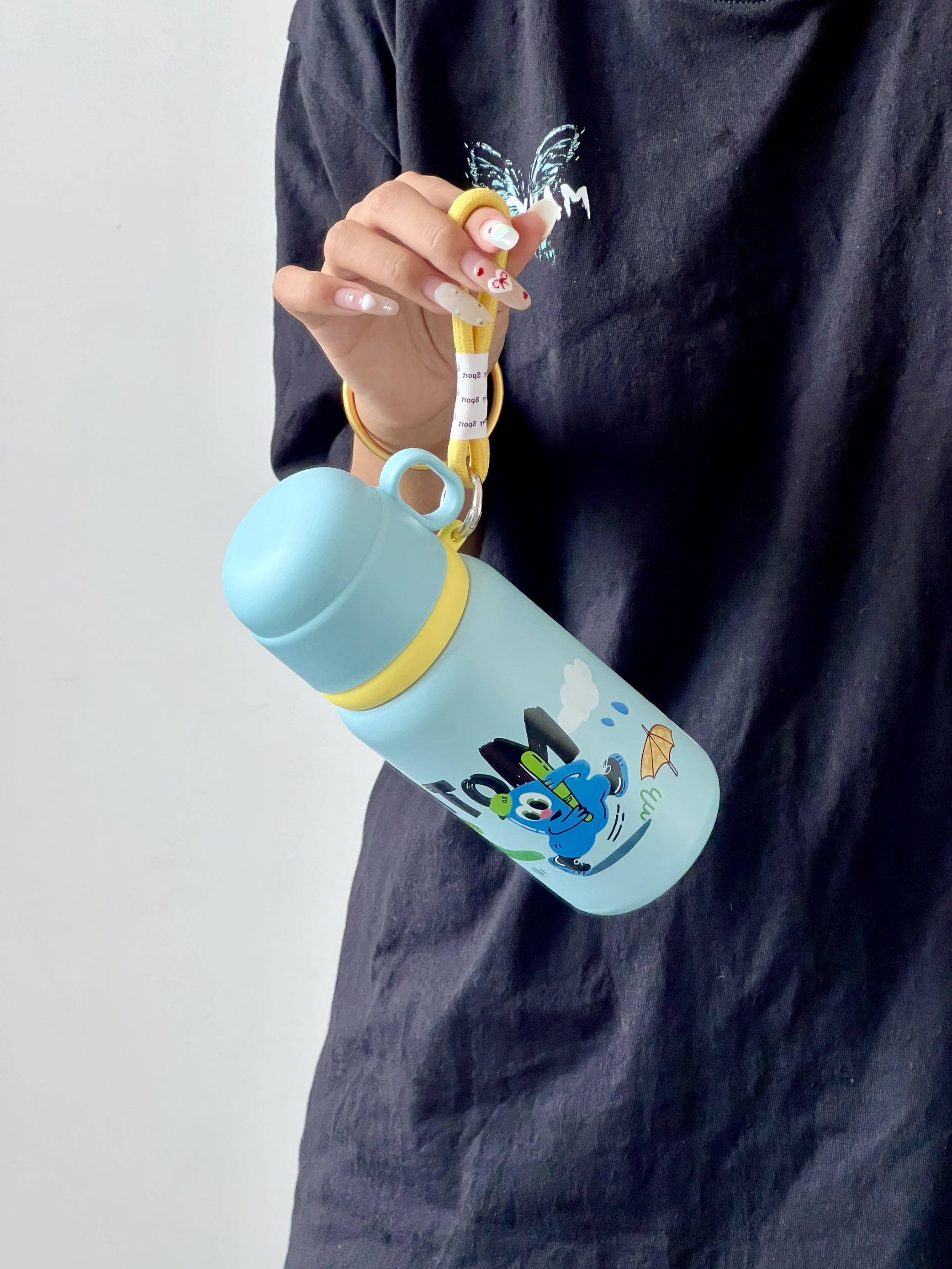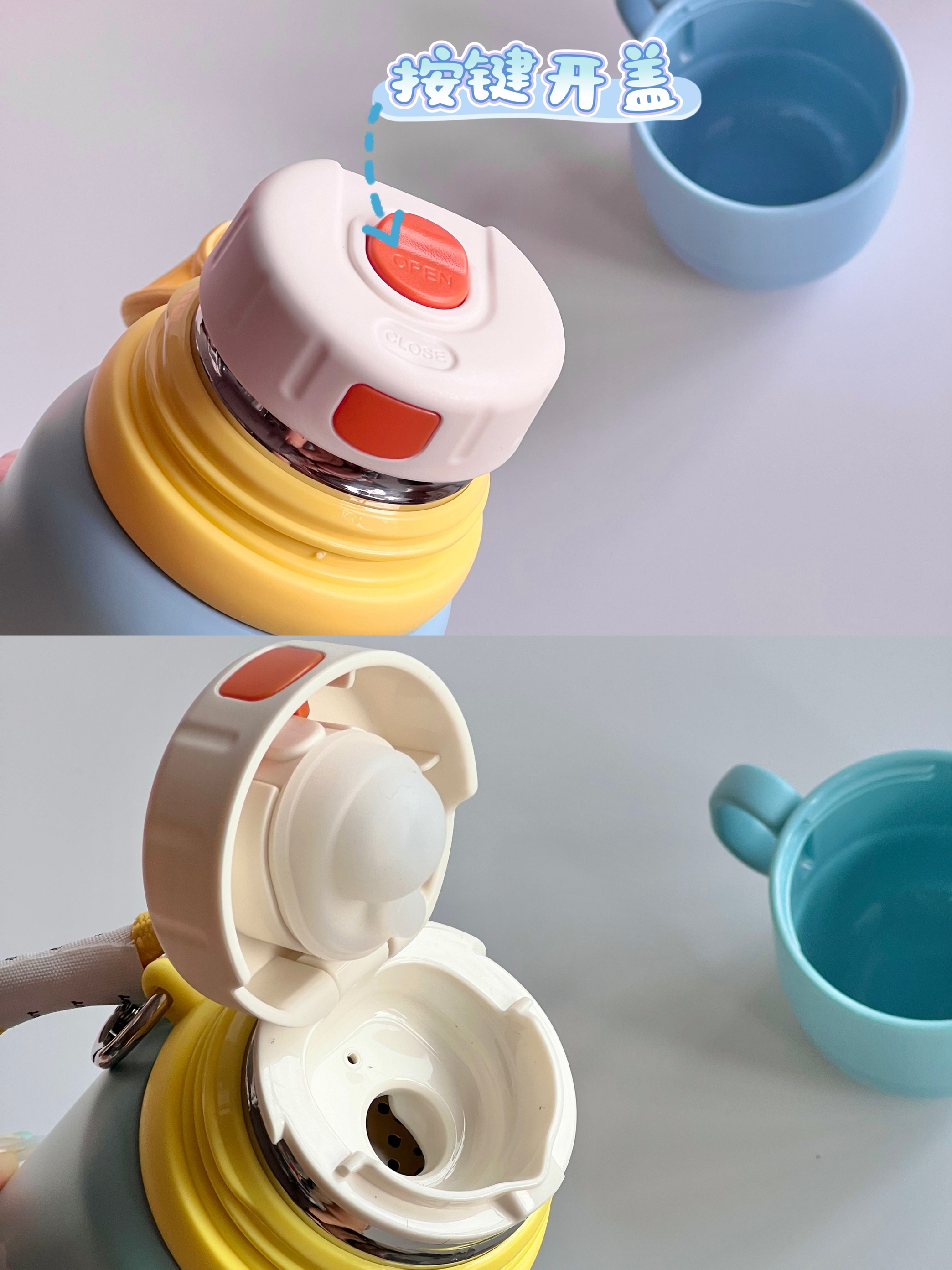 EVANLEY 家的保温杯也太有童趣啦 这个蓝色 很奶很温柔 小涂鸦老生动了 316不锈钢的保温效果嘎嘎好还有一个手绳 出门一拎很实用 按动开盖的 自带小杯子 放热水开盖也不会喷溅 小孩子也可以放心使用