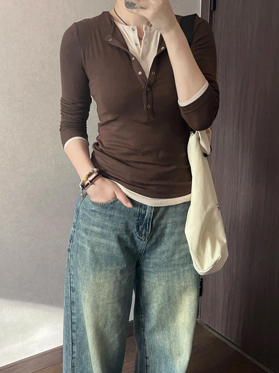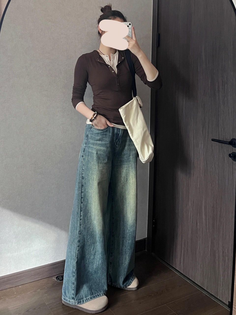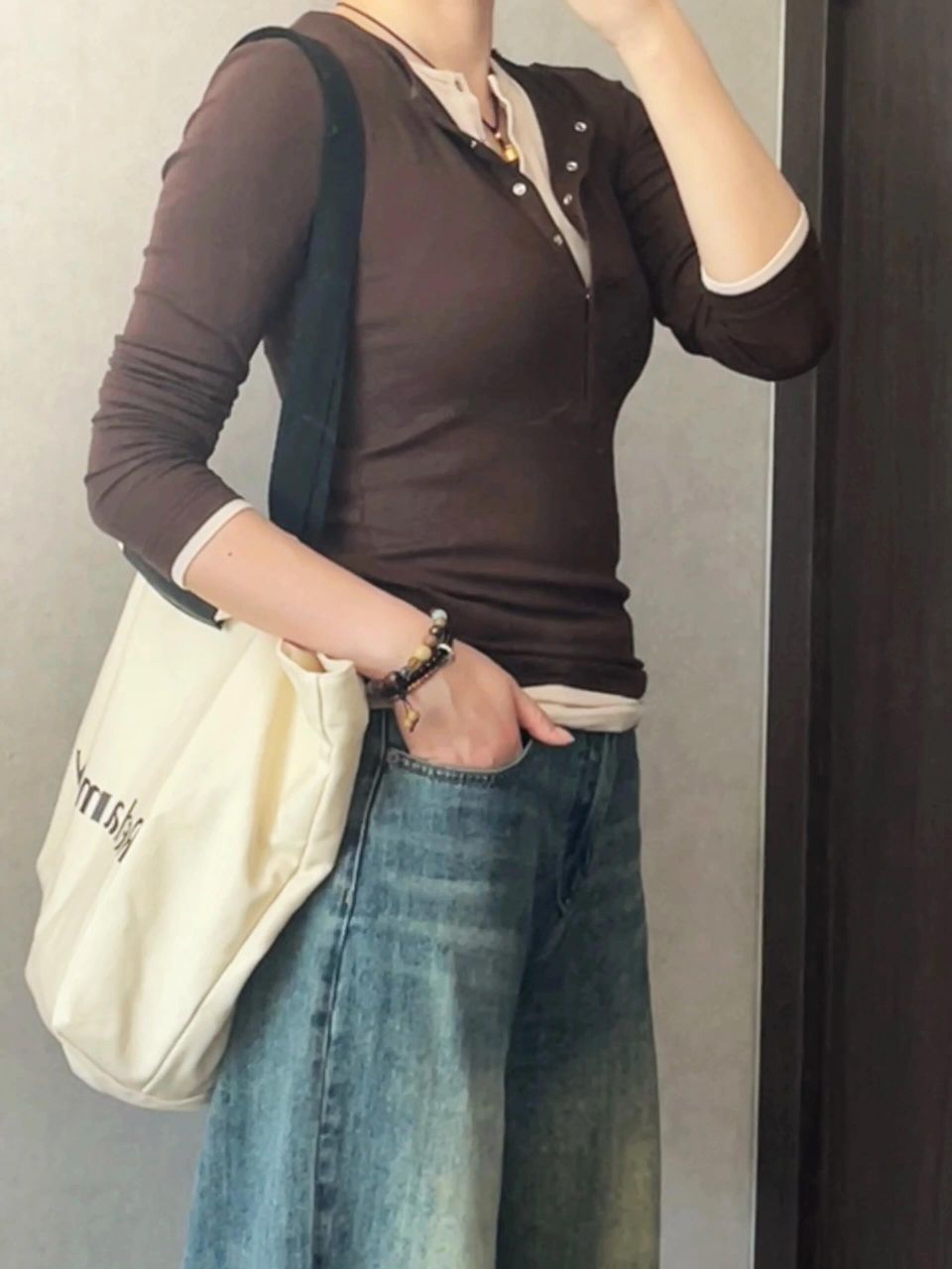 上紧下松你就穿吧,一穿一个不吱声,太显瘦啦!! ⬆️撞色假两件,实现叠穿自由,懒人最爱 颜色很妙,我是橄榄皮,平时穿不了棕色系卡其色系衣服,但是这件不会显黑,越拍越喜欢 ⬇️裤腿很大,是我的菜是去年买到的最爱的牛仔裤👖