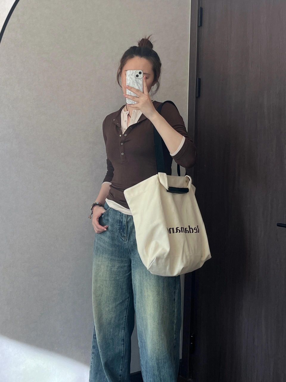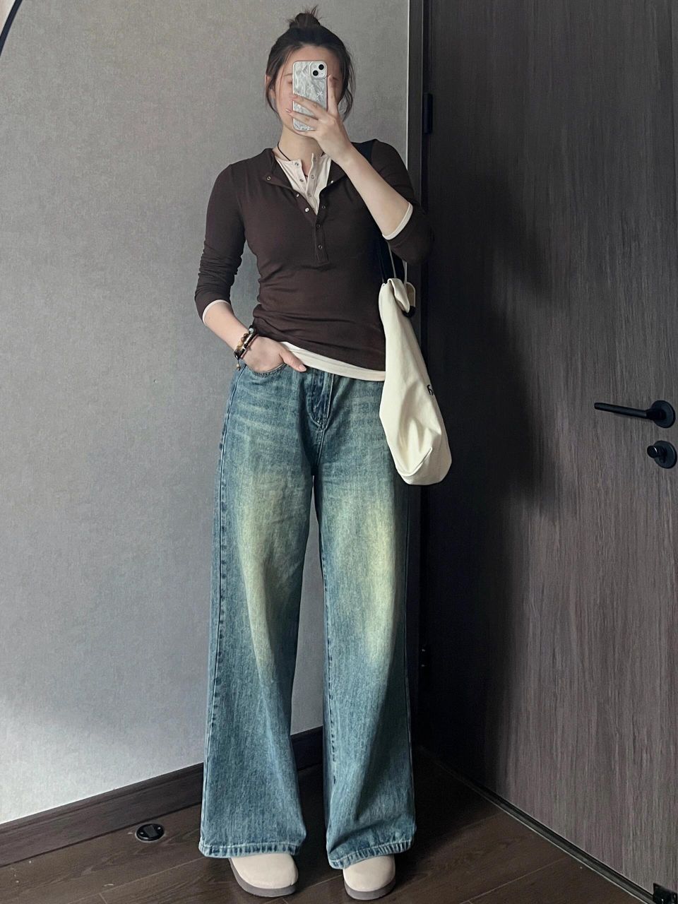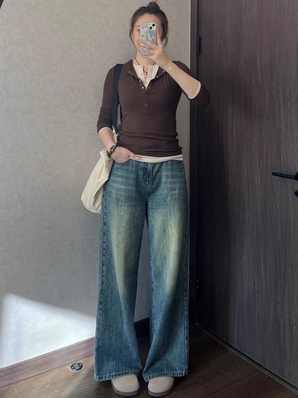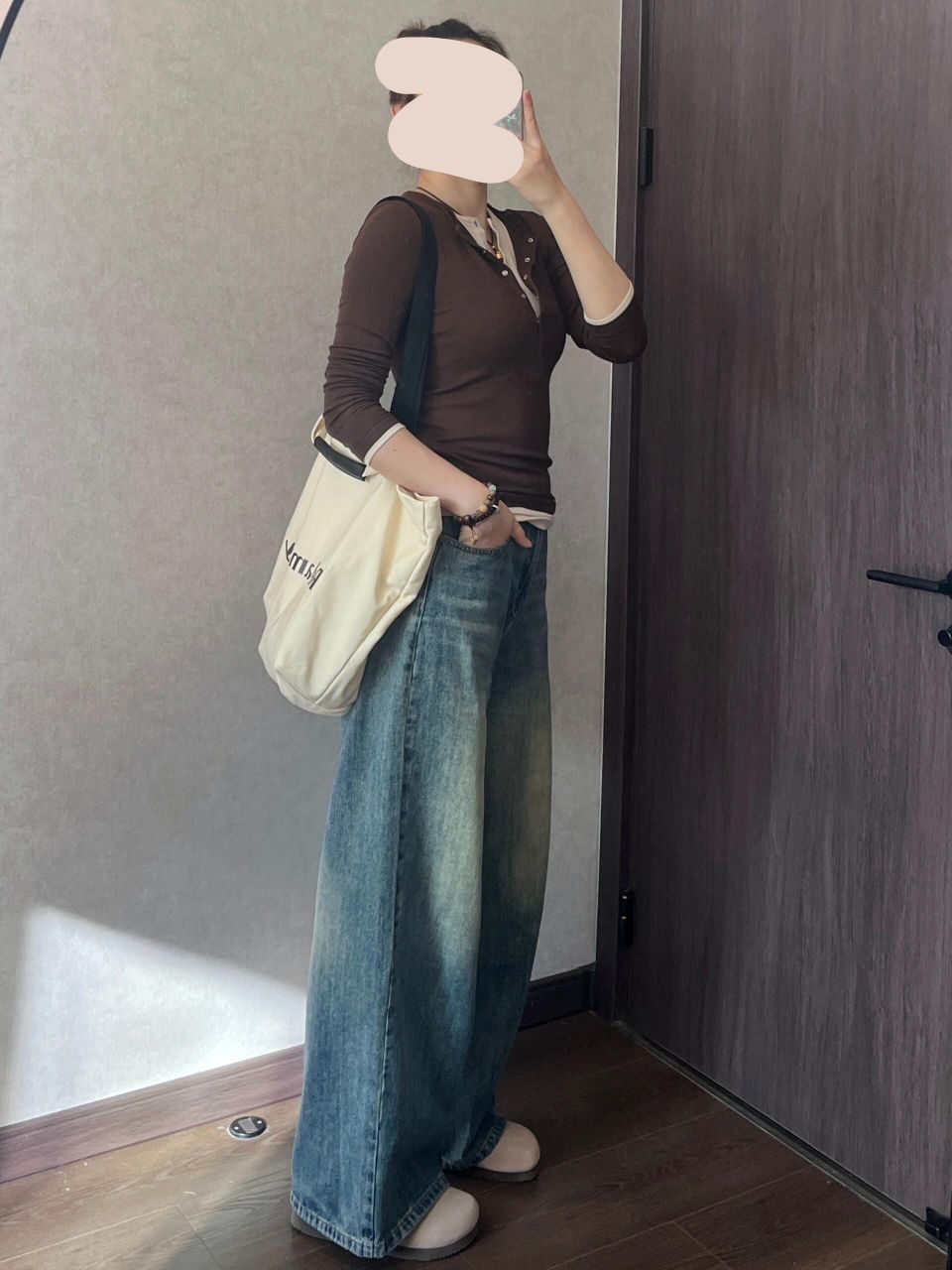 上紧下松你就穿吧,一穿一个不吱声,太显瘦啦!! ⬆️撞色假两件,实现叠穿自由,懒人最爱 颜色很妙,我是橄榄皮,平时穿不了棕色系卡其色系衣服,但是这件不会显黑,越拍越喜欢 ⬇️裤腿很大,是我的菜是去年买到的最爱的牛仔裤👖