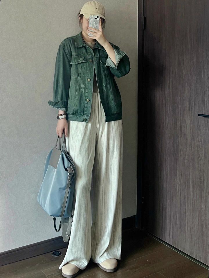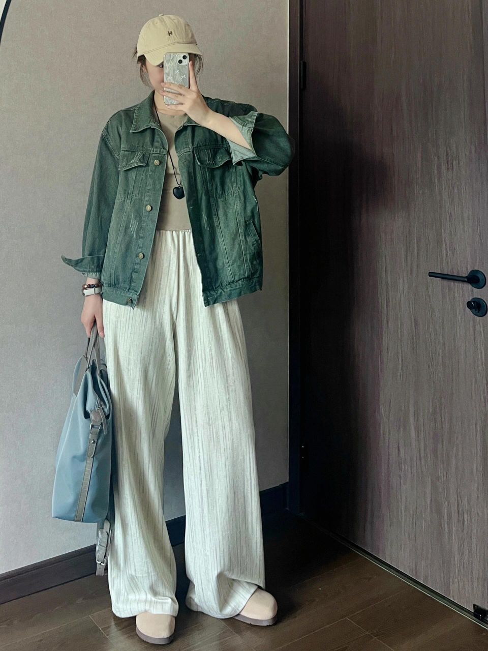 外套属于常规款,但是颜色很特别,是灰绿色。和豆绿色t很搭呀。 不知道怎么穿的时候,试试同色系穿搭,加点基础色,是出不了什么错的~