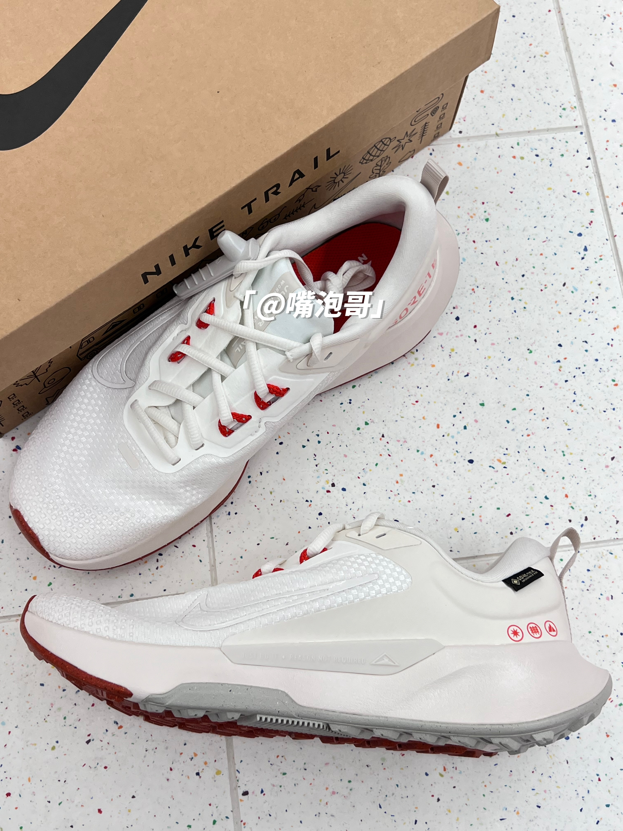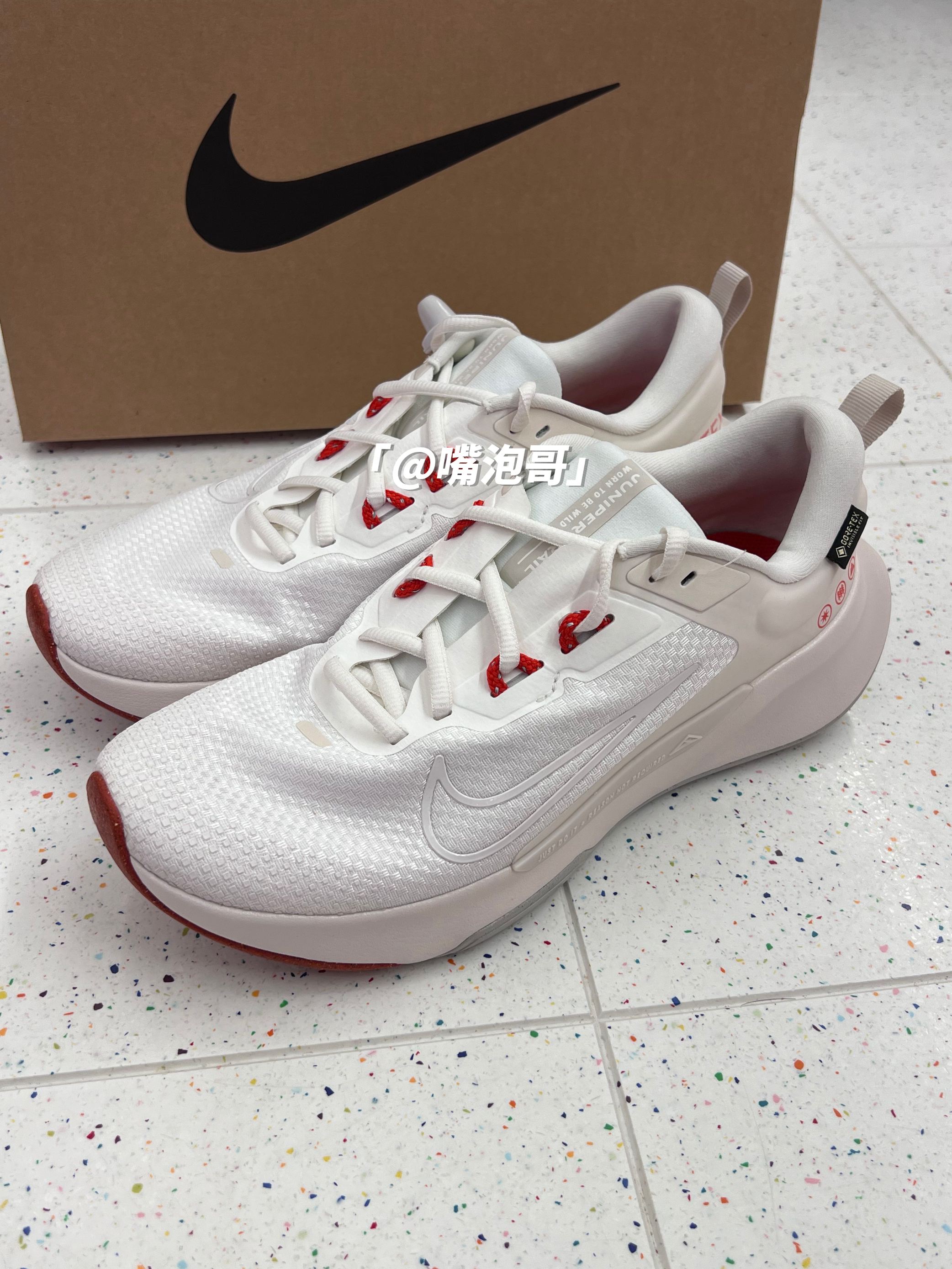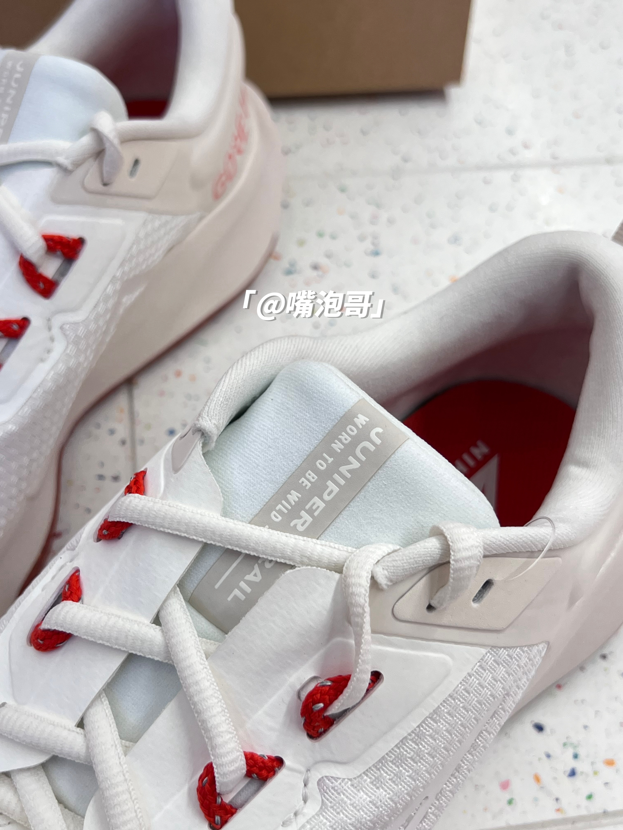 👟:Juniper Trail 2 白色 简介: 鞋款是一双低帮的户外跑鞋,整双鞋子选用了多种轻质材料打造而成,使鞋子上脚有着轻盈的脚感,同时又有不错的缓震效果。 细节: 鞋面采用了复合织物布制作而成,同时又加入了GTX特有防水科技,使鞋面具有防水效果,鞋舌与后跟内里填充柔软,增加了舒适度,中底是高密度缓震泡棉材料,增加整体的脚感,大底的花纹更符合户外所需。