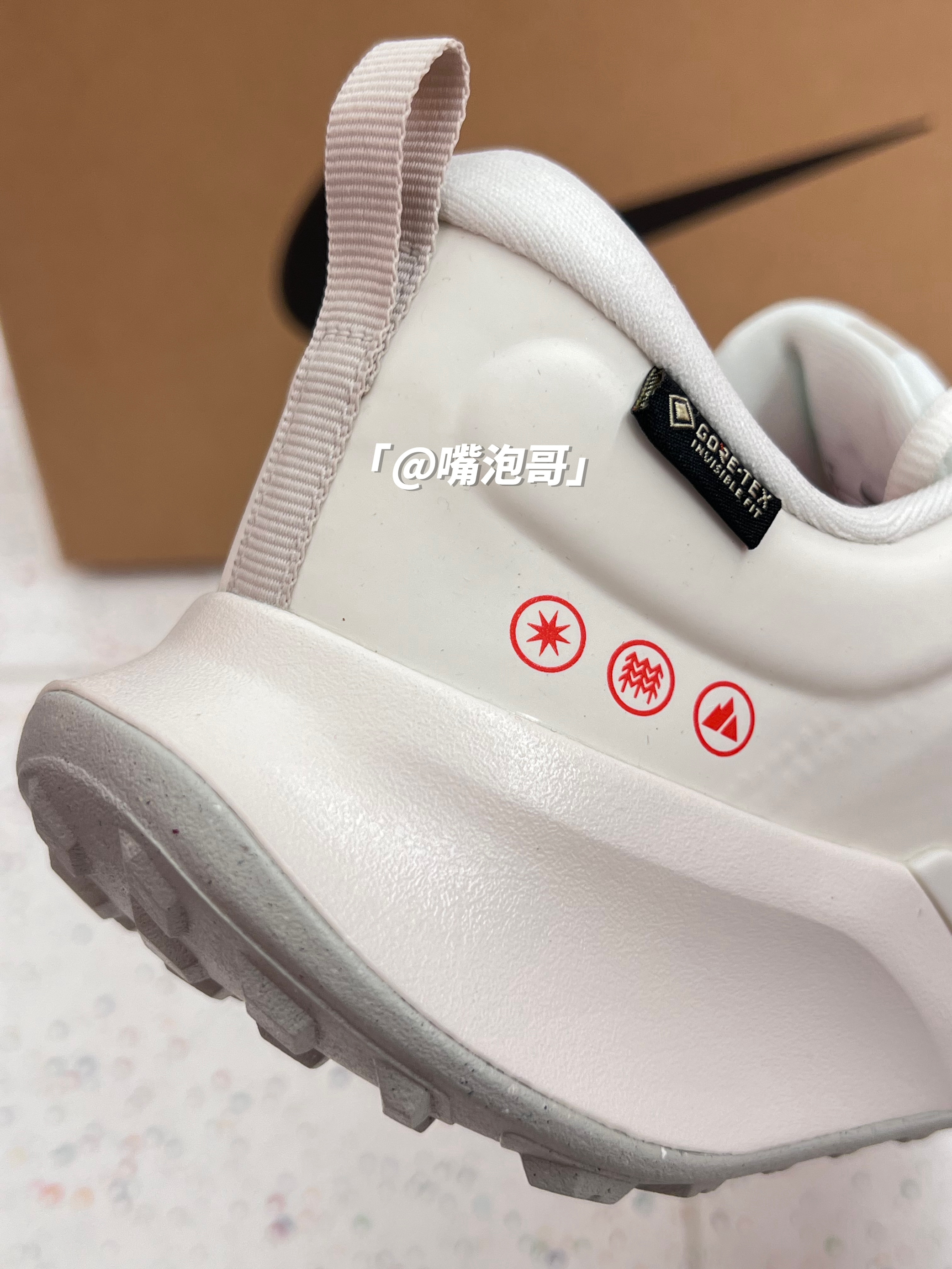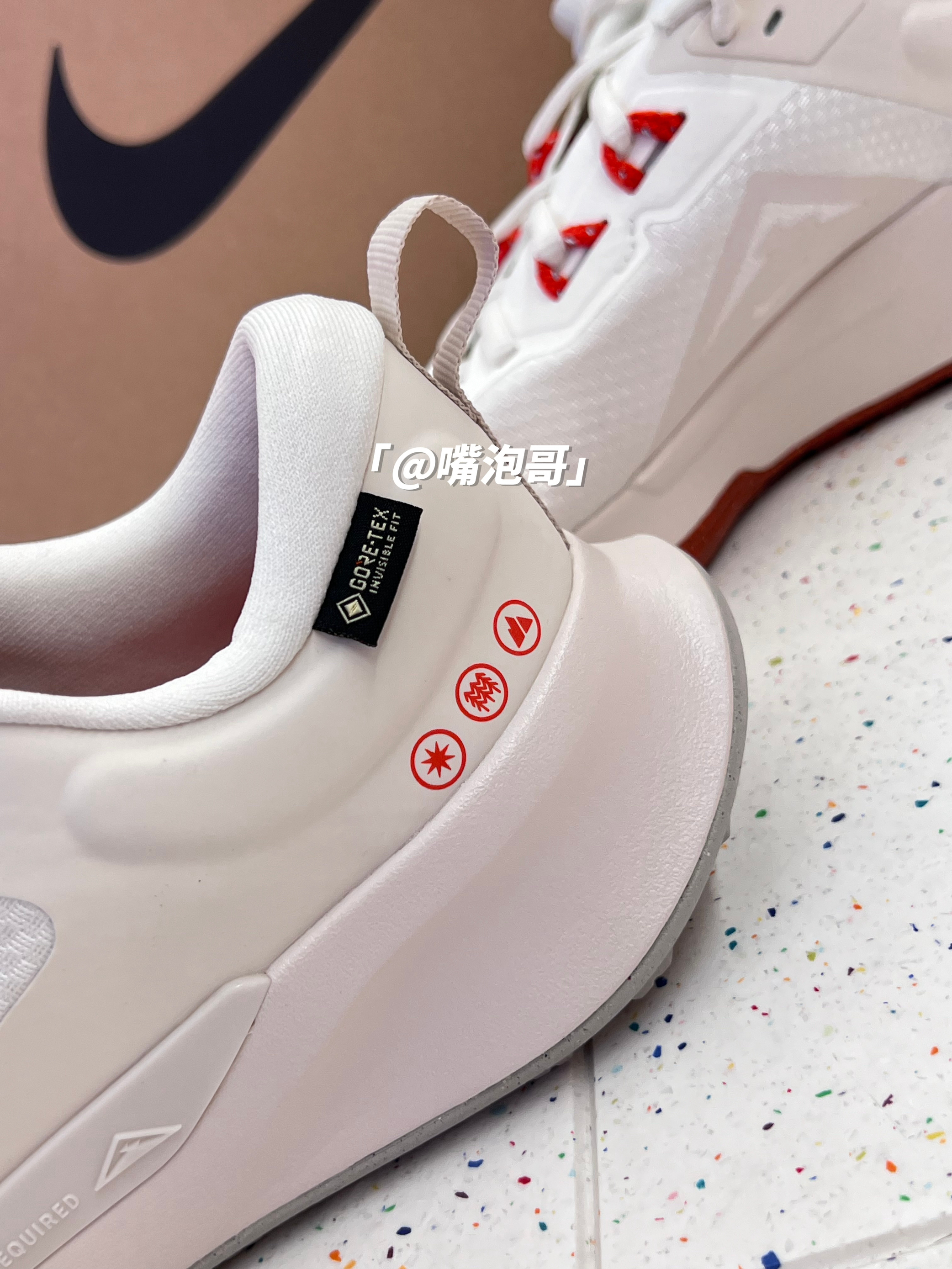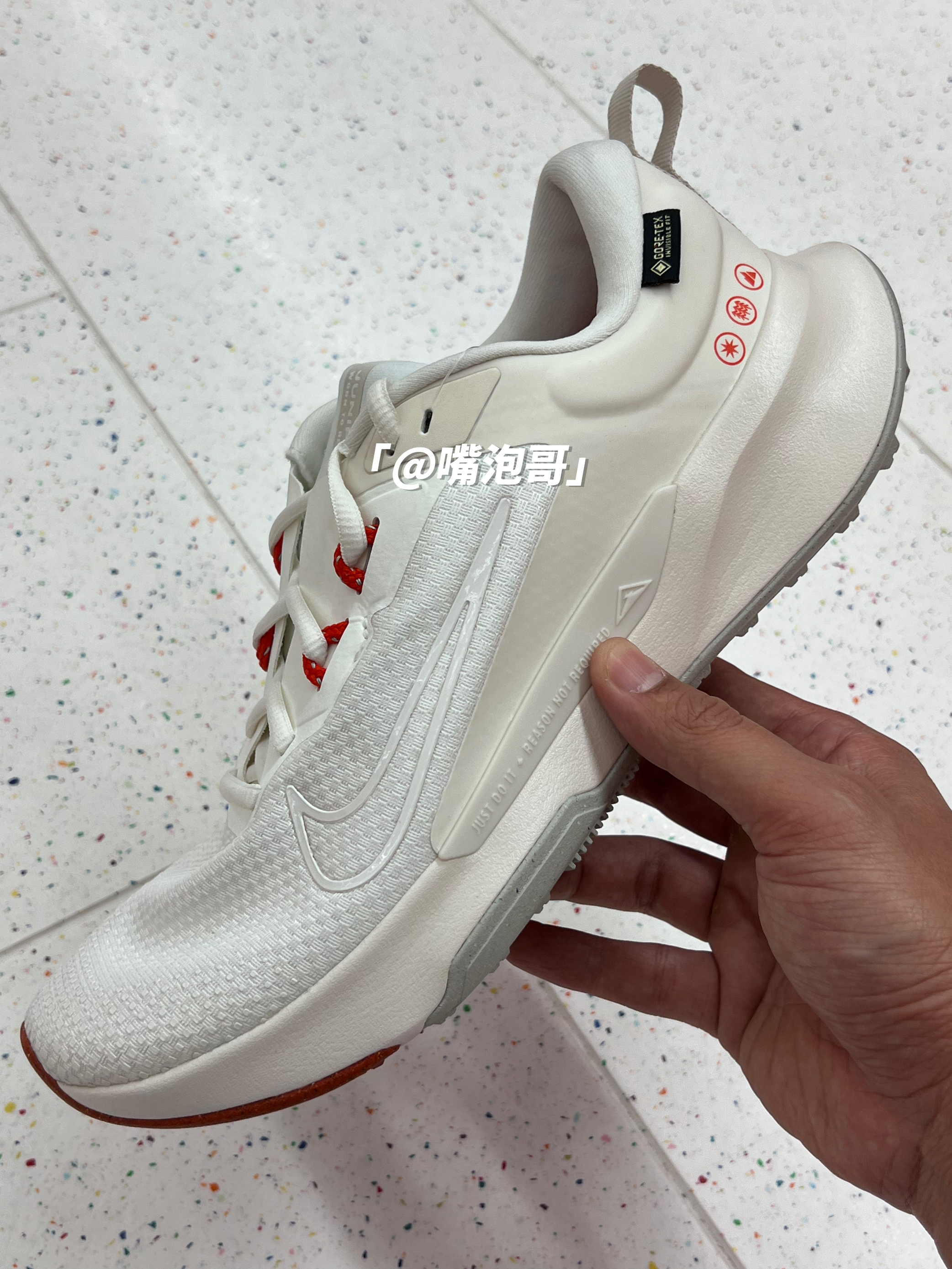 👟:Juniper Trail 2 白色 简介: 鞋款是一双低帮的户外跑鞋,整双鞋子选用了多种轻质材料打造而成,使鞋子上脚有着轻盈的脚感,同时又有不错的缓震效果。 细节: 鞋面采用了复合织物布制作而成,同时又加入了GTX特有防水科技,使鞋面具有防水效果,鞋舌与后跟内里填充柔软,增加了舒适度,中底是高密度缓震泡棉材料,增加整体的脚感,大底的花纹更符合户外所需。