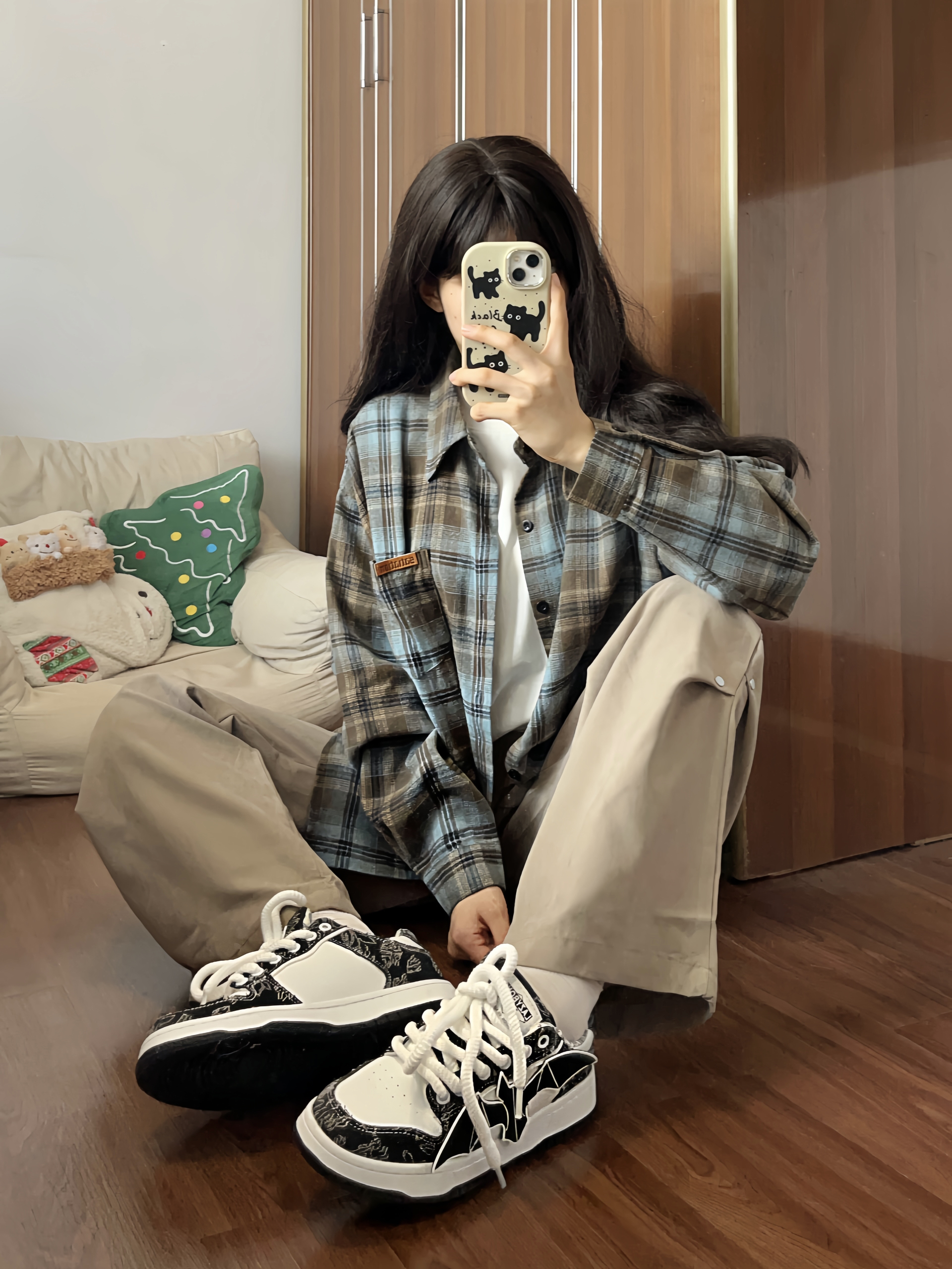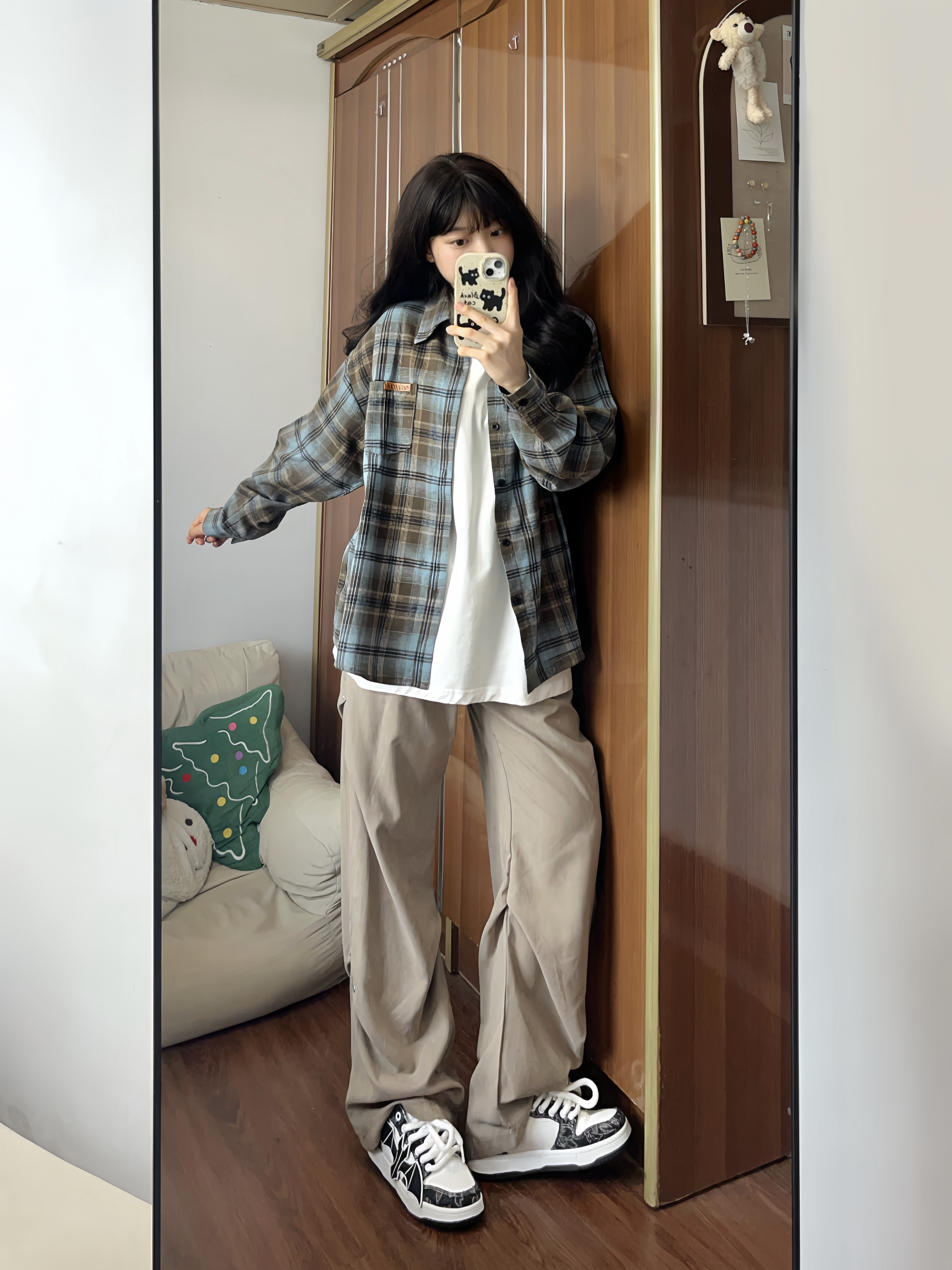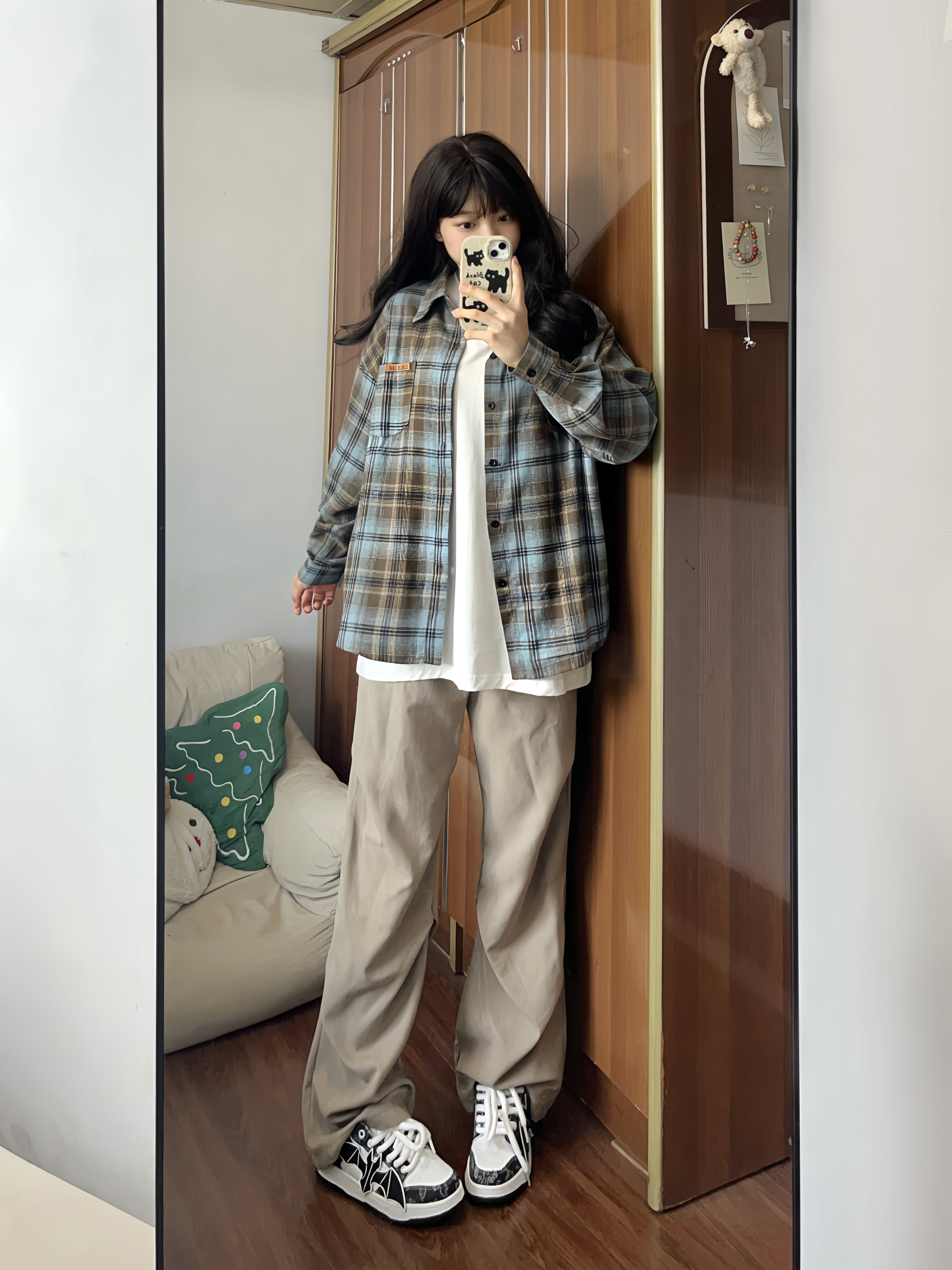 格子控的福音来啦~ 这件蓝棕撞色格子衫一眼爱上 很有美式复古的感觉🤩做叠穿也好看 搭配褶皱休闲裤 垂感十足很有型✨ 再来一双百搭面包鞋 蝙蝠图案时尚潮流 上脚柔软舒适 是性价比很高的一款✌🏻 这套闭眼入 男女都可穿!!