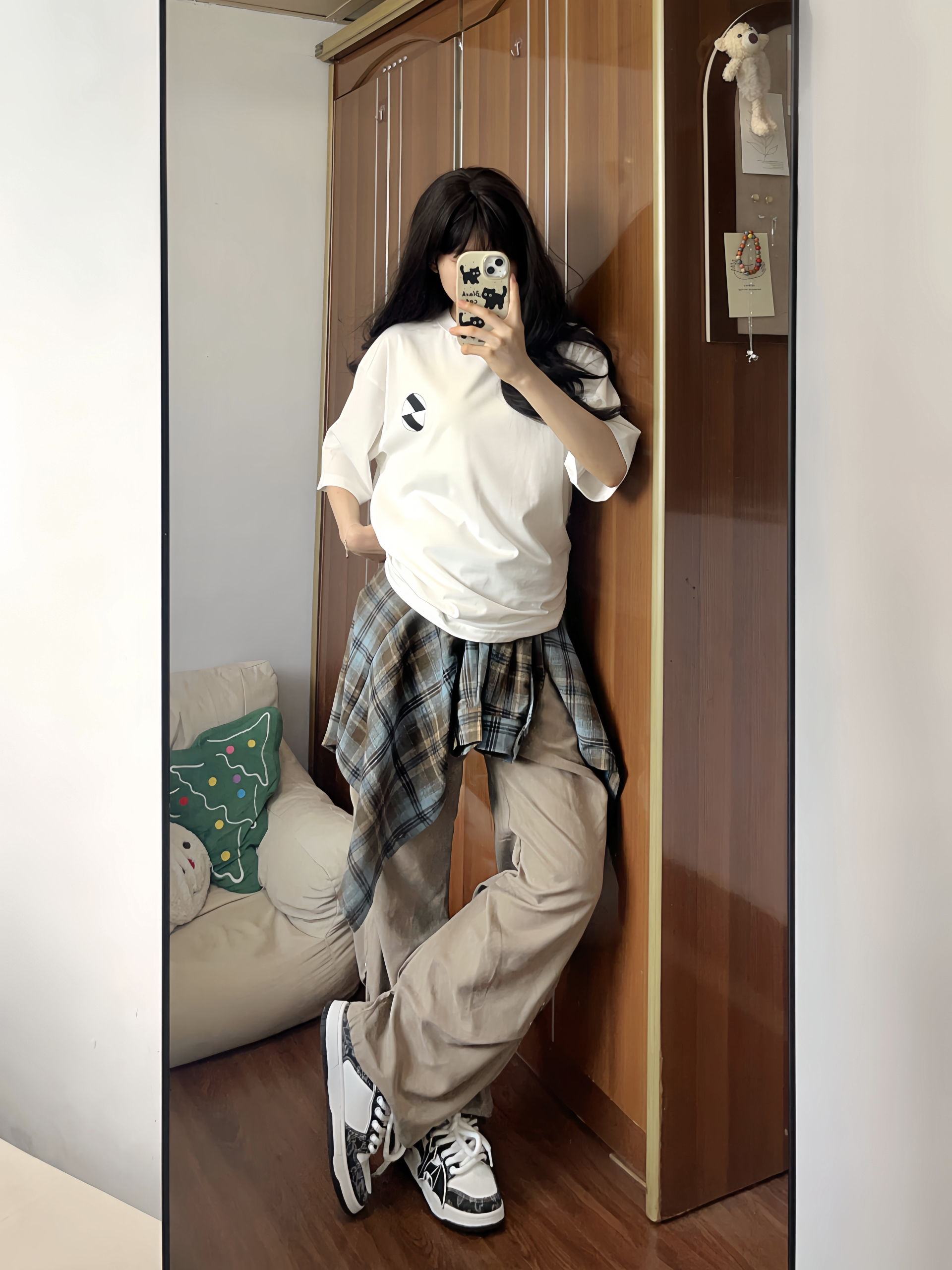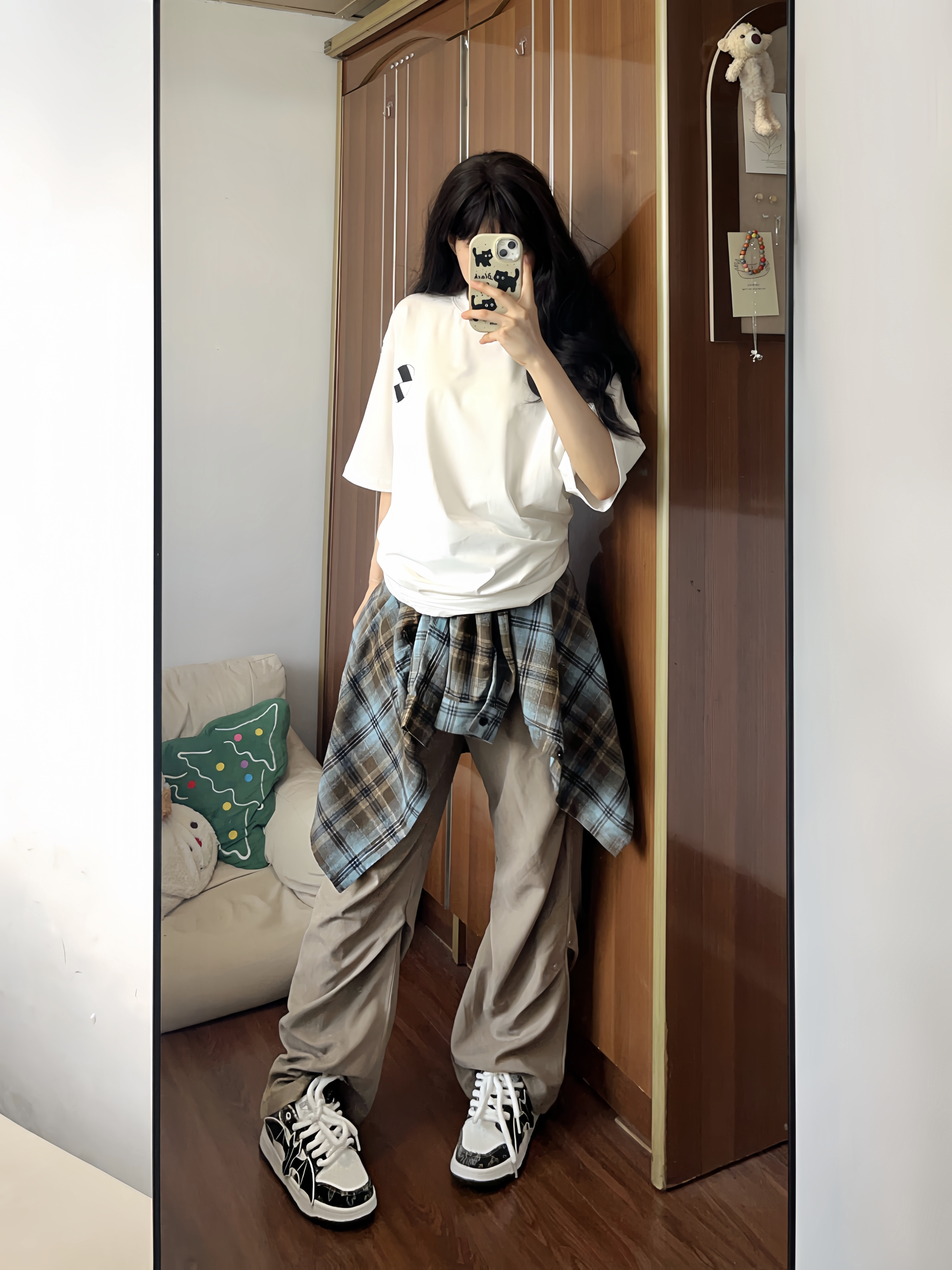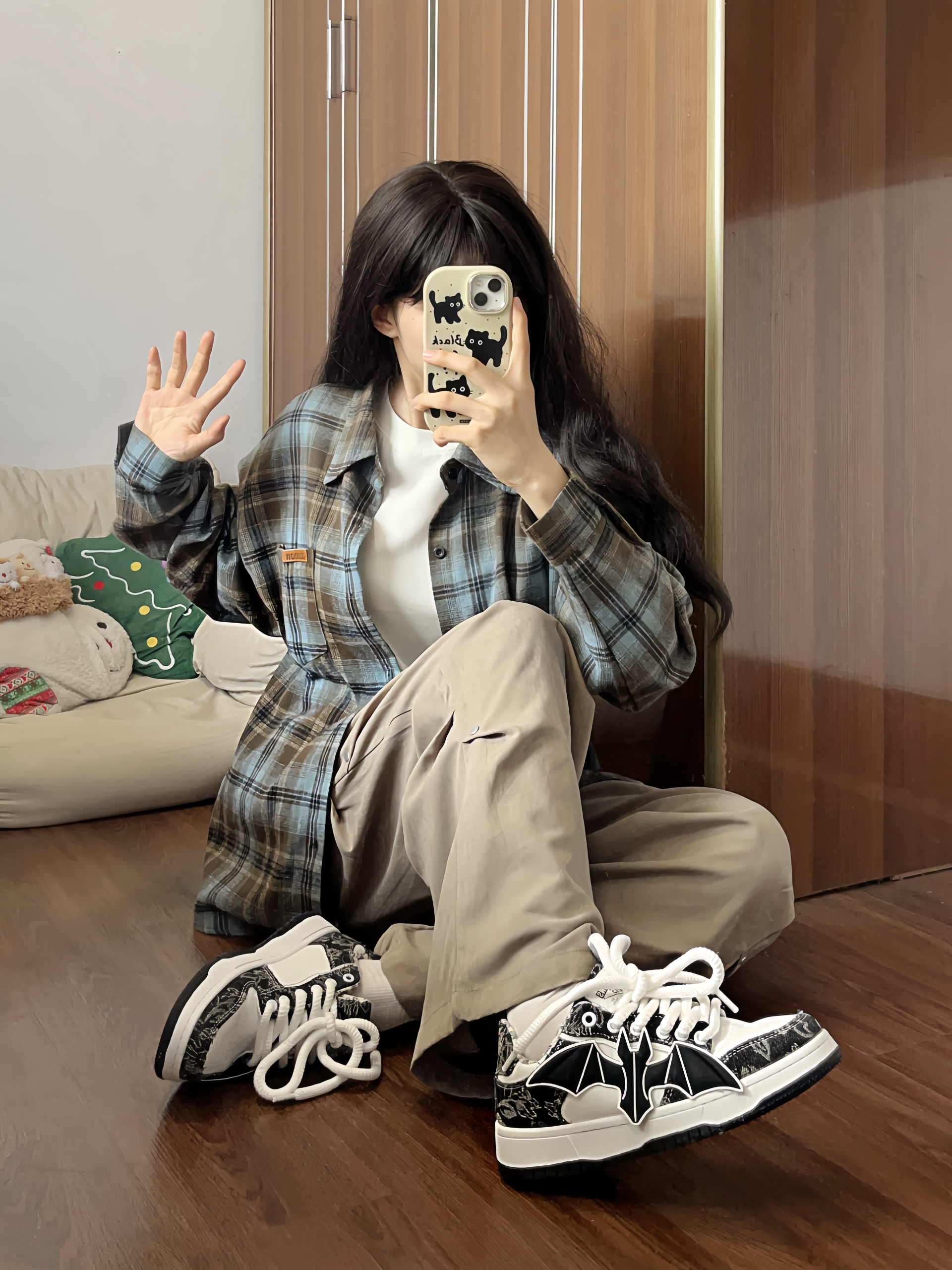 格子控的福音来啦~ 这件蓝棕撞色格子衫一眼爱上 很有美式复古的感觉🤩做叠穿也好看 搭配褶皱休闲裤 垂感十足很有型✨ 再来一双百搭面包鞋 蝙蝠图案时尚潮流 上脚柔软舒适 是性价比很高的一款✌🏻 这套闭眼入 男女都可穿!!