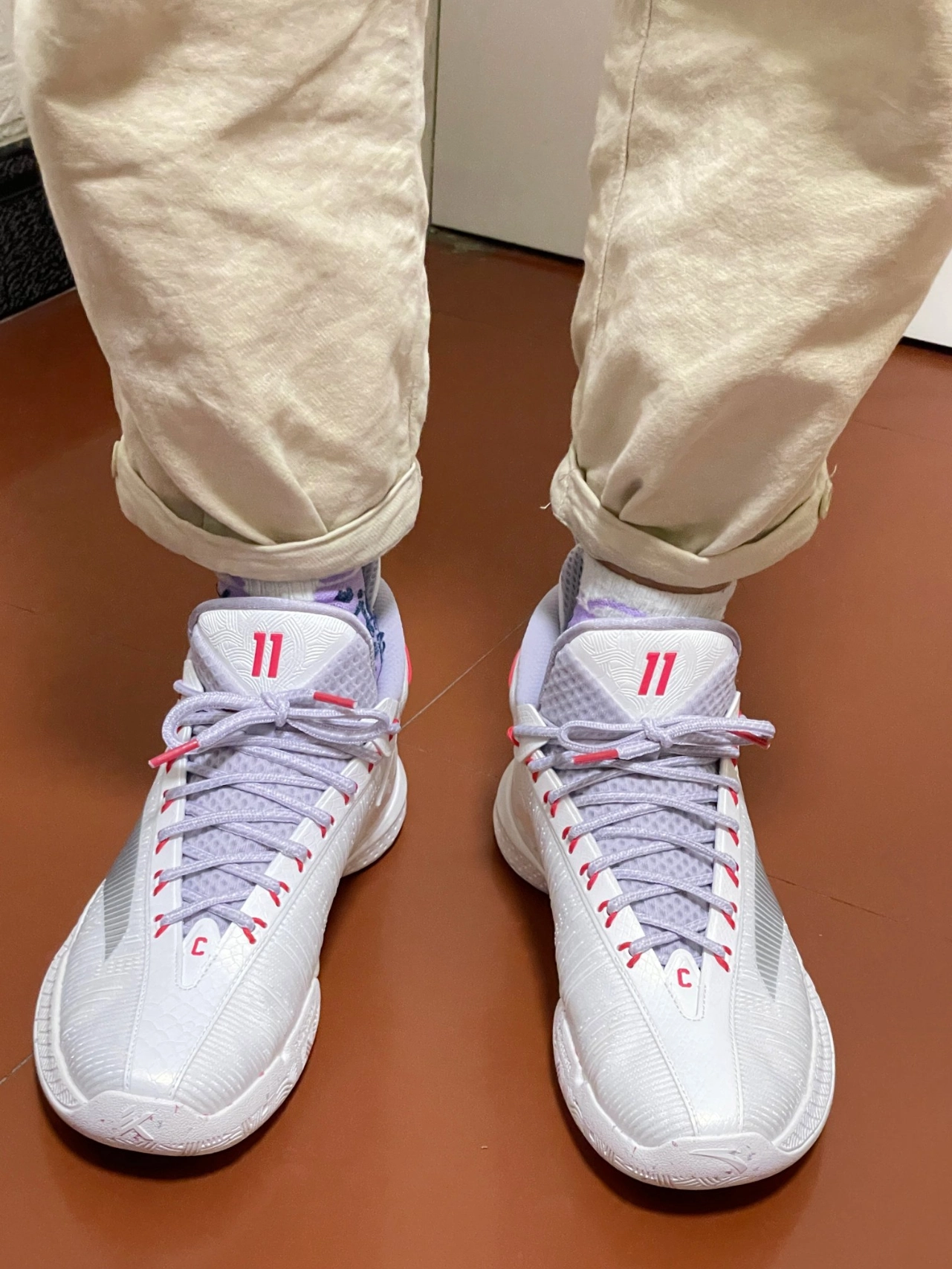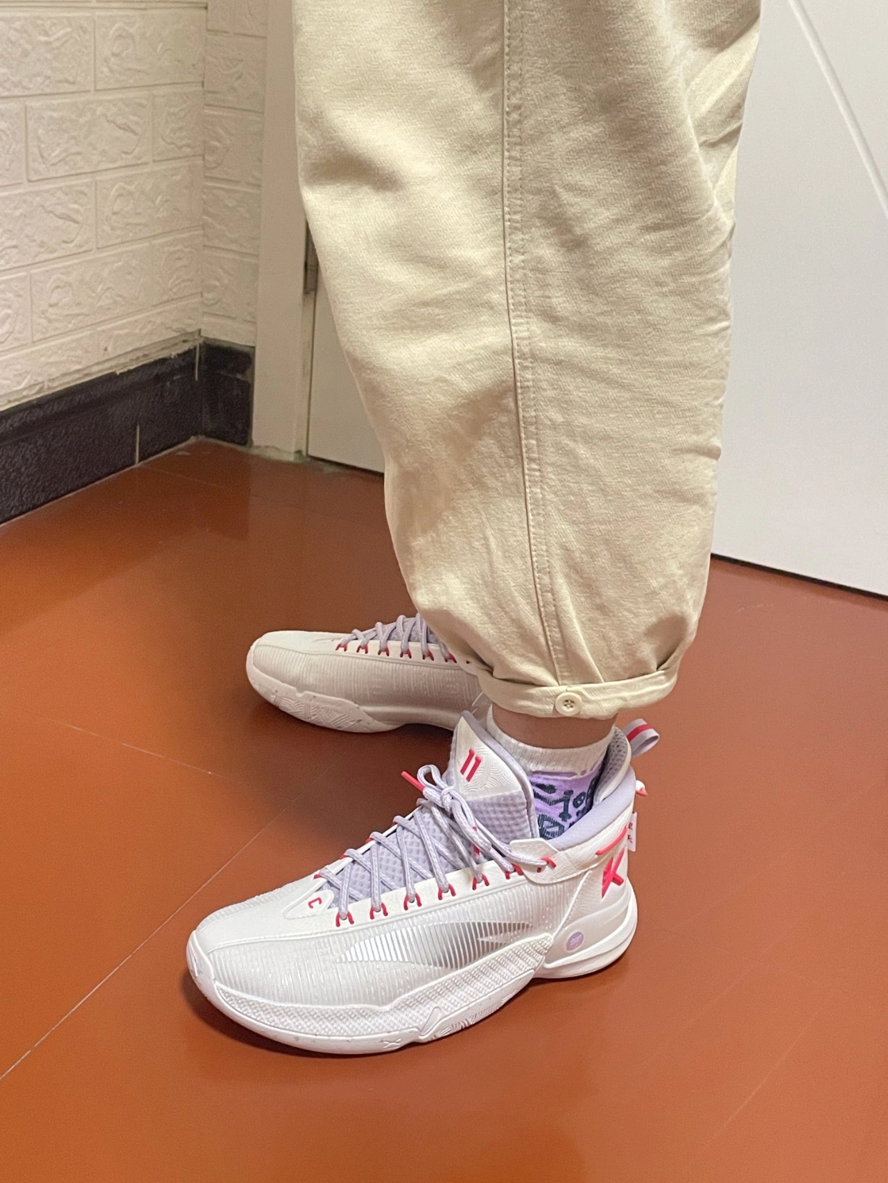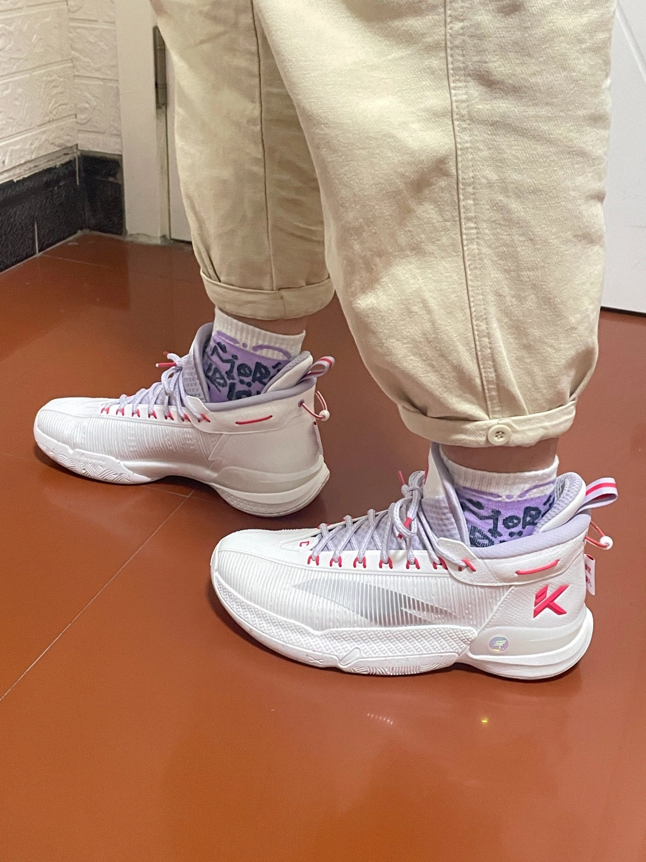 👉本人身高185cm,体重72Kg,鞋码42。这双球鞋我选的也是42码,穿着大小刚合适,一点也不偏码😄。尺码建议大家选正常码就好😉。 ✅外观感受:鞋子配色以白色为主色调,紫色和红色勾勒点缀,整体的色彩搭配给人一种阳光、有活力的感觉[强_blue]。鞋身外侧搭配了一个灰色的安踏Logo,鞋身上有白色线条点缀勾勒,看起来很“炫酷”[耍帅_blue];鞋型设计非常的好看,搭配一双运动...