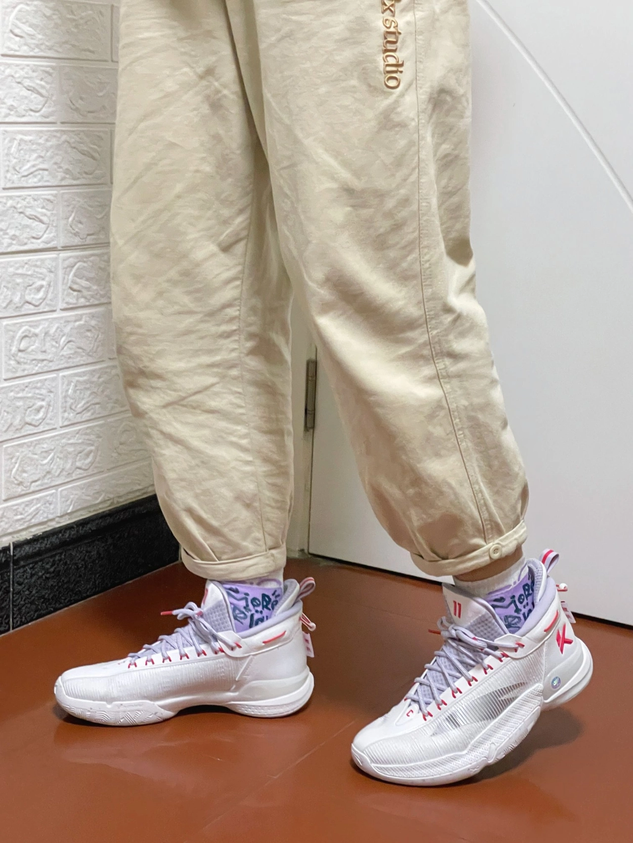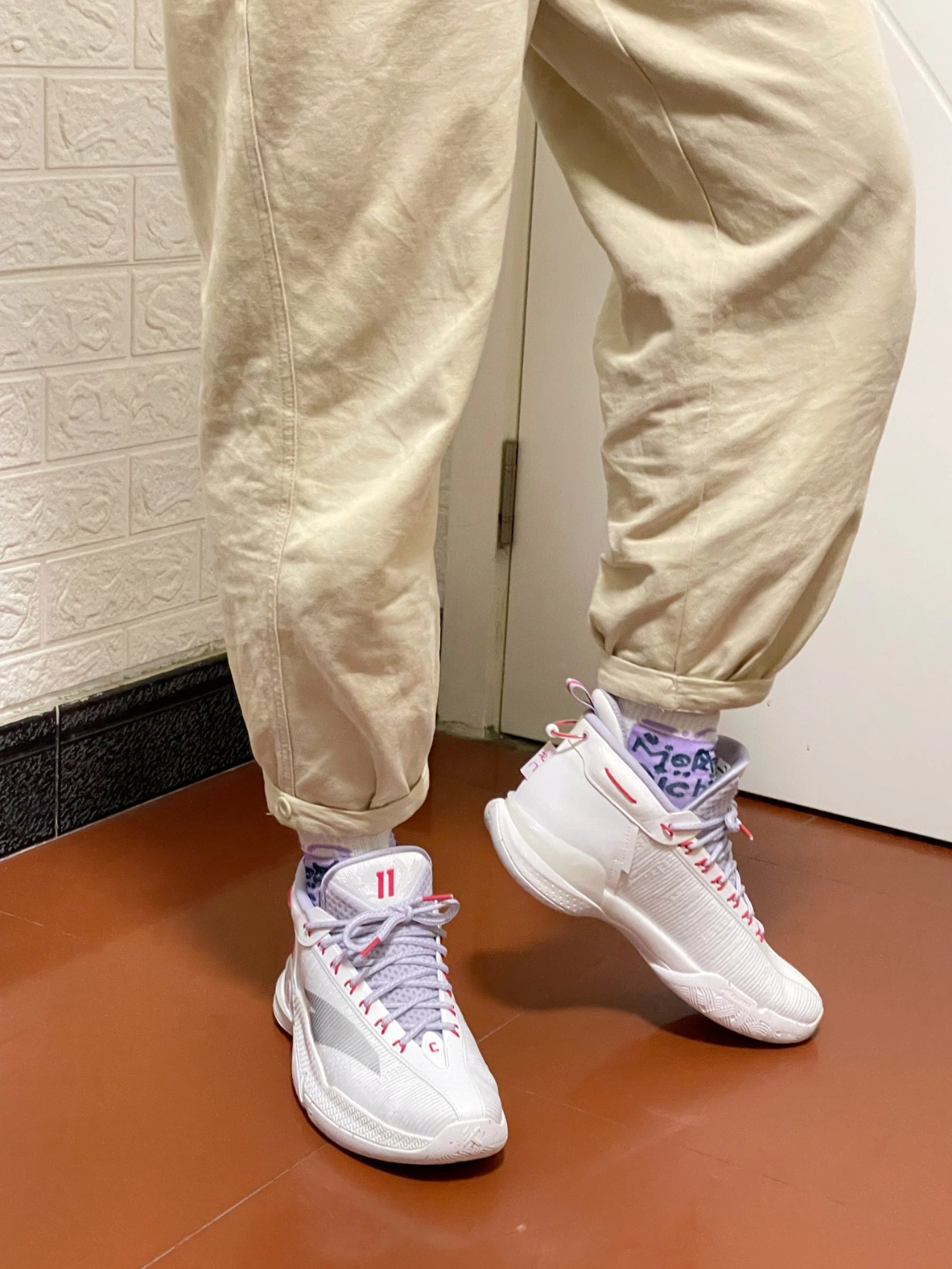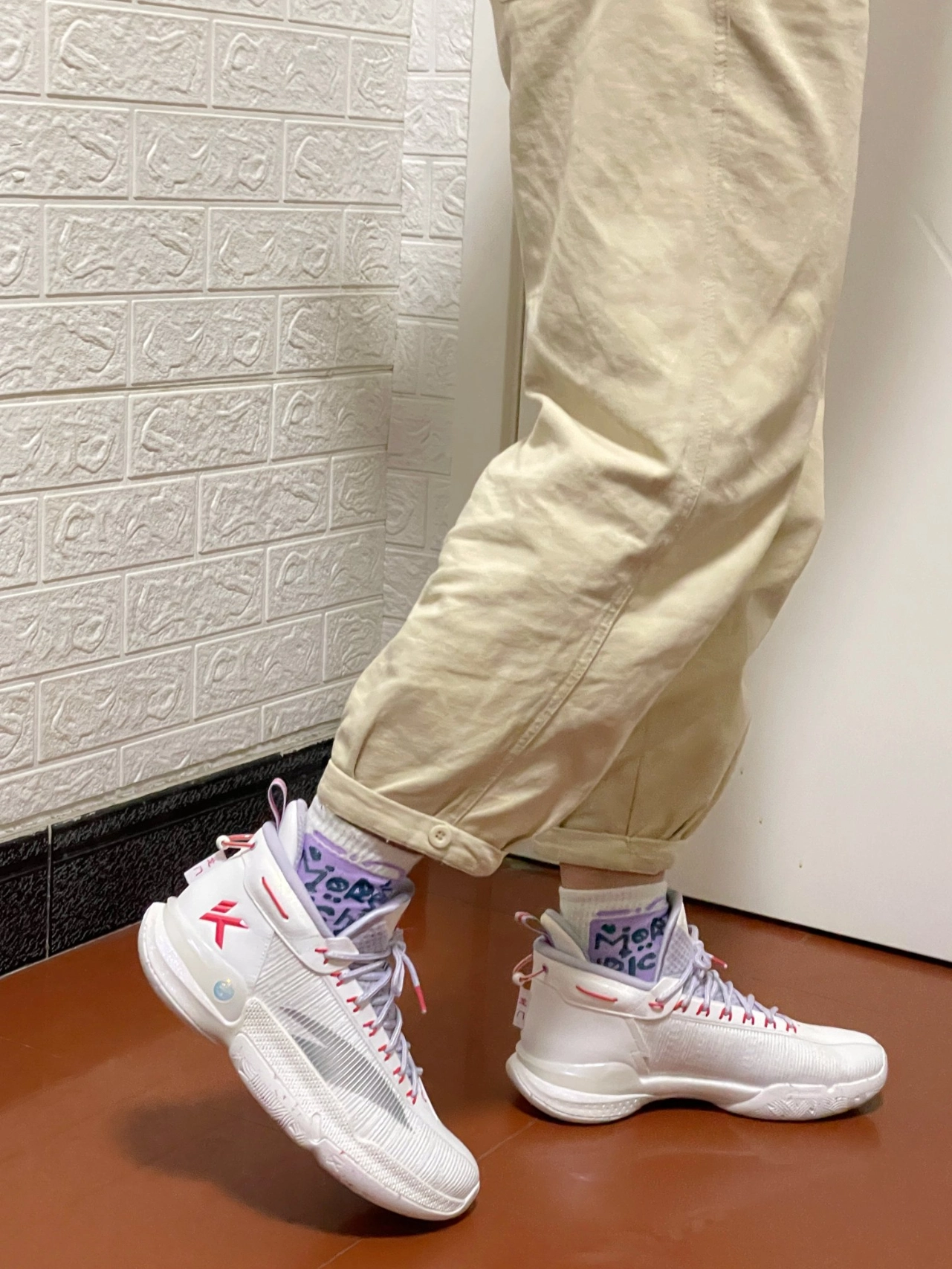 👉本人身高185cm,体重72Kg,鞋码42。这双球鞋我选的也是42码,穿着大小刚合适,一点也不偏码😄。尺码建议大家选正常码就好😉。 ✅外观感受:鞋子配色以白色为主色调,紫色和红色勾勒点缀,整体的色彩搭配给人一种阳光、有活力的感觉[强_blue]。鞋身外侧搭配了一个灰色的安踏Logo,鞋身上有白色线条点缀勾勒,看起来很“炫酷”[耍帅_blue];鞋型设计非常的好看,搭配一双运动...