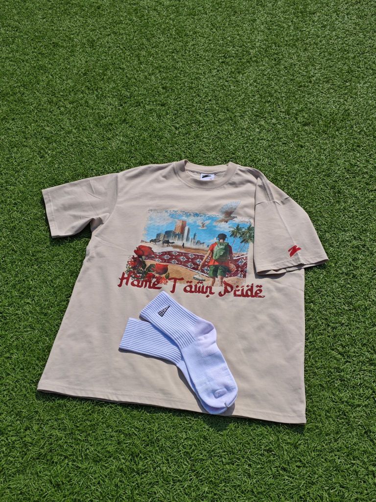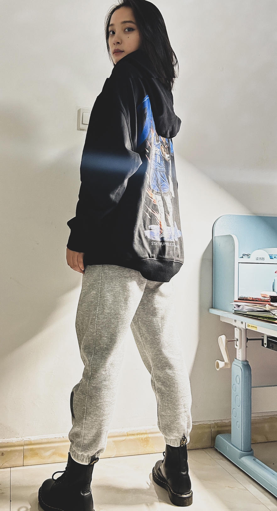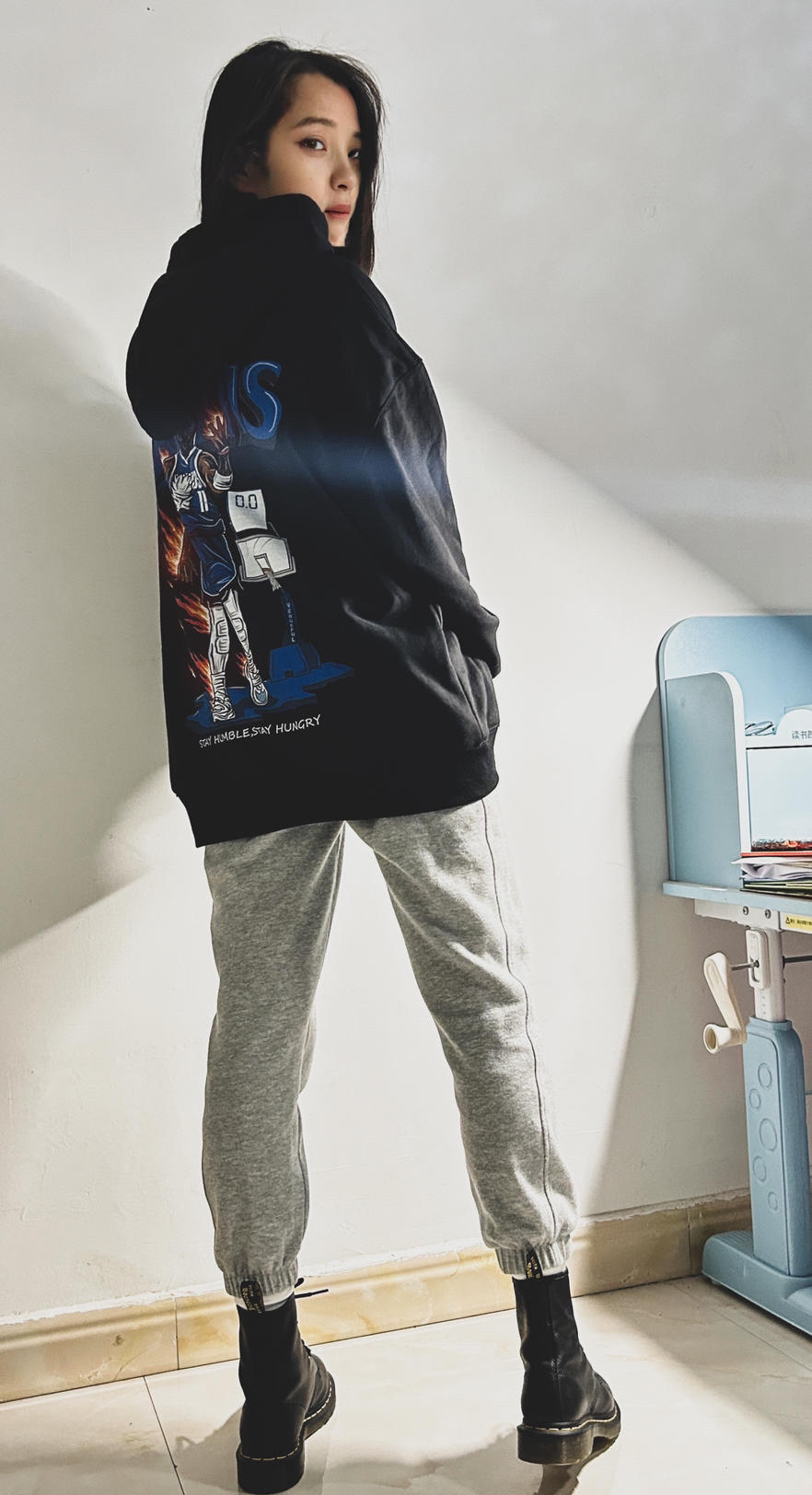 上半身的卫衣是绝对的亮点,采用了重磅面料,质感很柔和。正面低调的骷髅标志,而背面的印花则让整件卫衣瞬间升温:经典的欧文在达拉斯独行侠的姿势,搭配火焰骷髅的暗黑风格,给人一种强烈的视觉冲击,街头感满满。 搭配的米白色卫裤,颜色干净柔和,带来一丝轻松的休闲感。下搭工装靴,既稳重又充满力量感,整体造型既有街头酷感,也不失实用性。 总结:这套穿搭通过卫衣的暗黑风设计和工装元素的组合,塑造出一种刚柔并济...