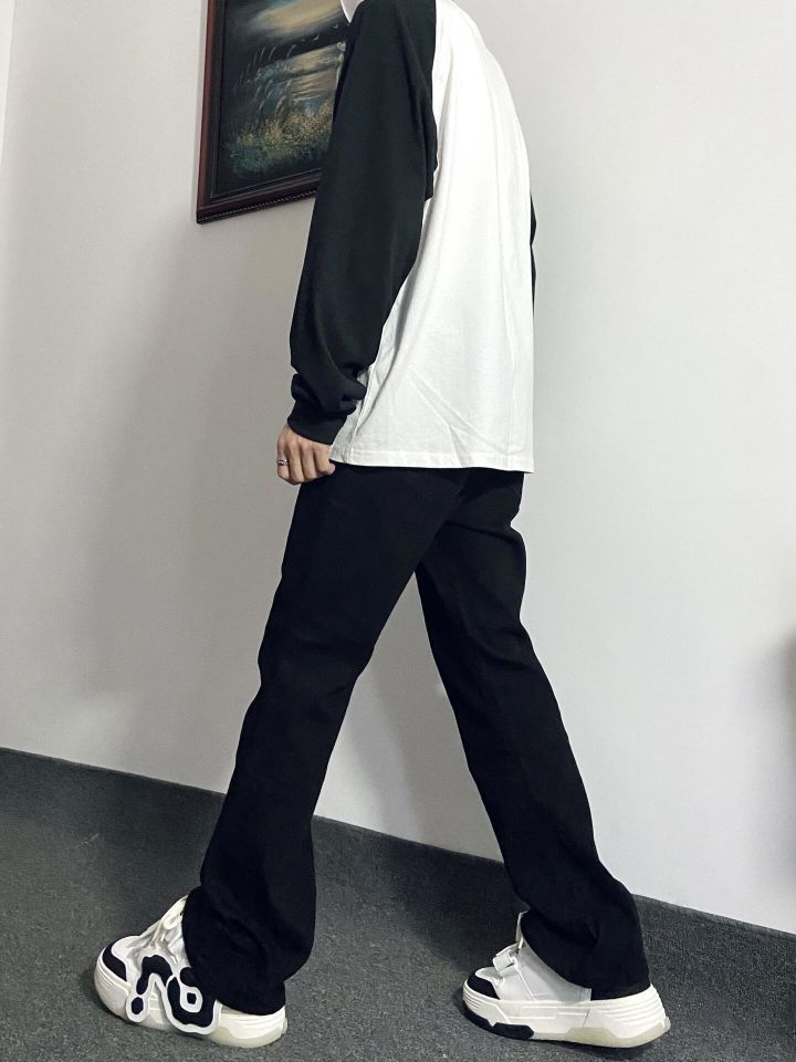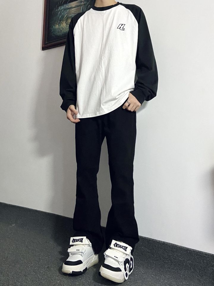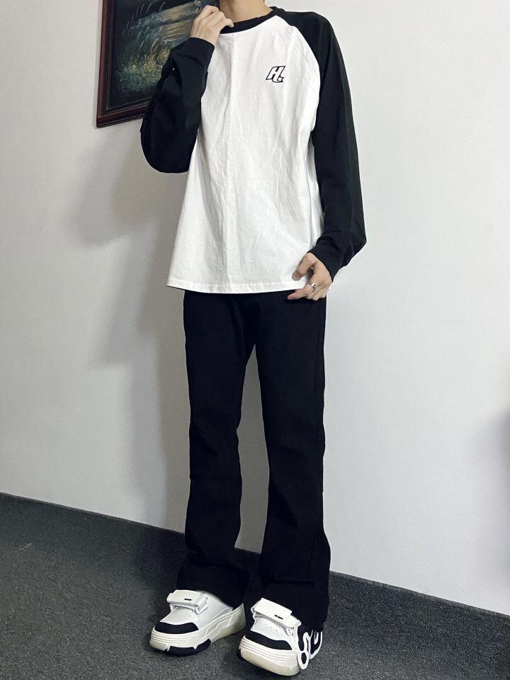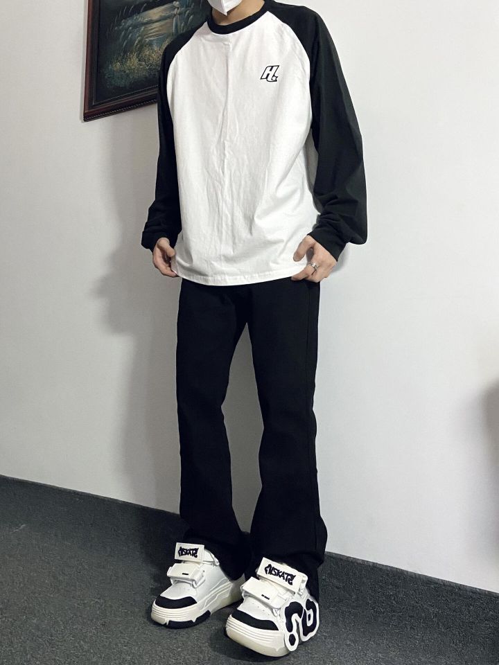今日份Ootd: 🌈上衣选择了简约插肩拼接设计款薄款长袖T恤 裤子选择了修身显腿长的黑色微喇裤👖 插肩长袖T恤上身效果很🉑️ 微喇牛仔裤版型设计显瘦 裤脚微宽设计绝了!搭配上这双黑白防滑增高面包鞋,确实很酷 (图片来自博主:浩吃板烧堡)