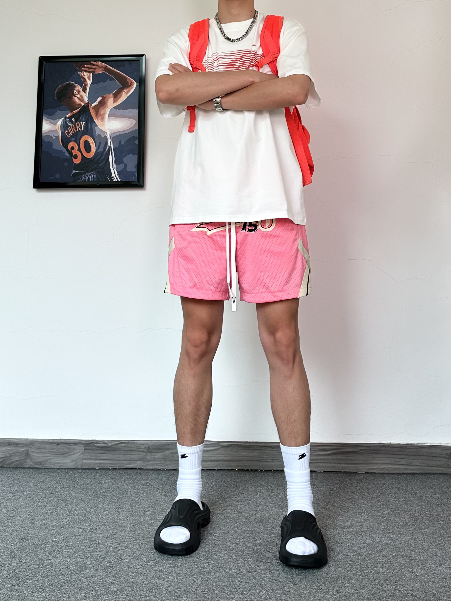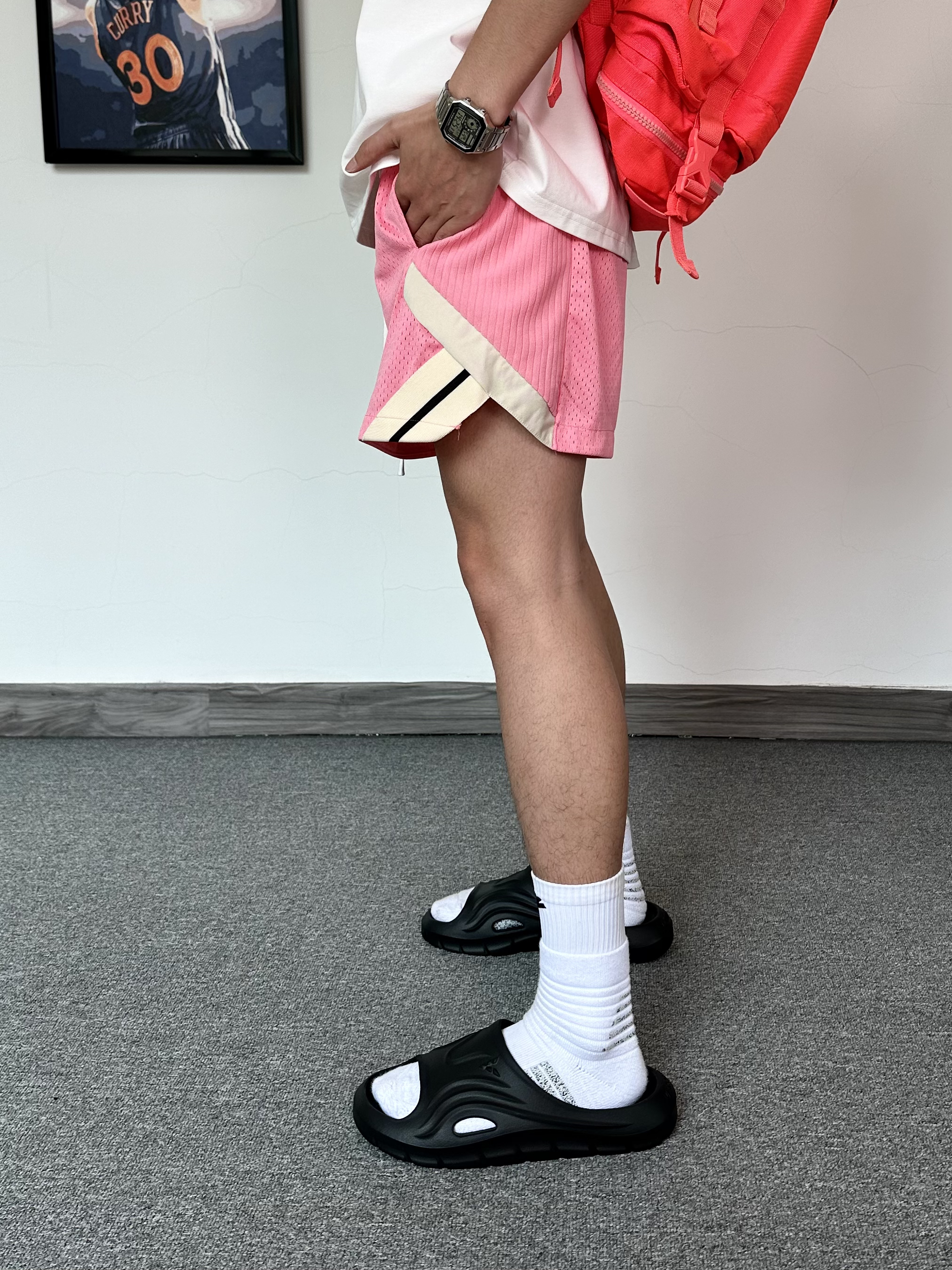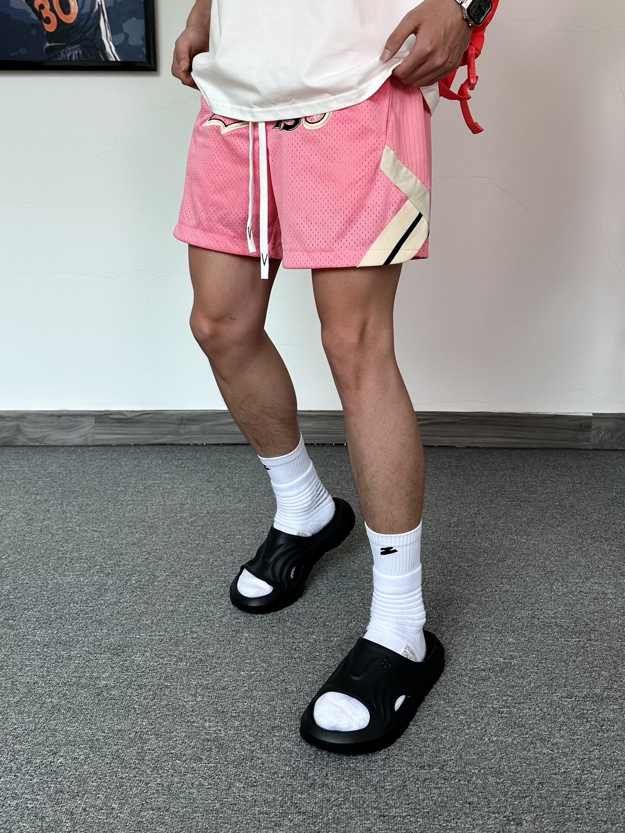 还是钟爱运动风格 上身一件白红配色T恤 简约的风格太喜欢啦 搭配复古粉色运动短裤 再来一双黑色篮球拖鞋✨ 搭配袜子穿嘎嘎舒服!