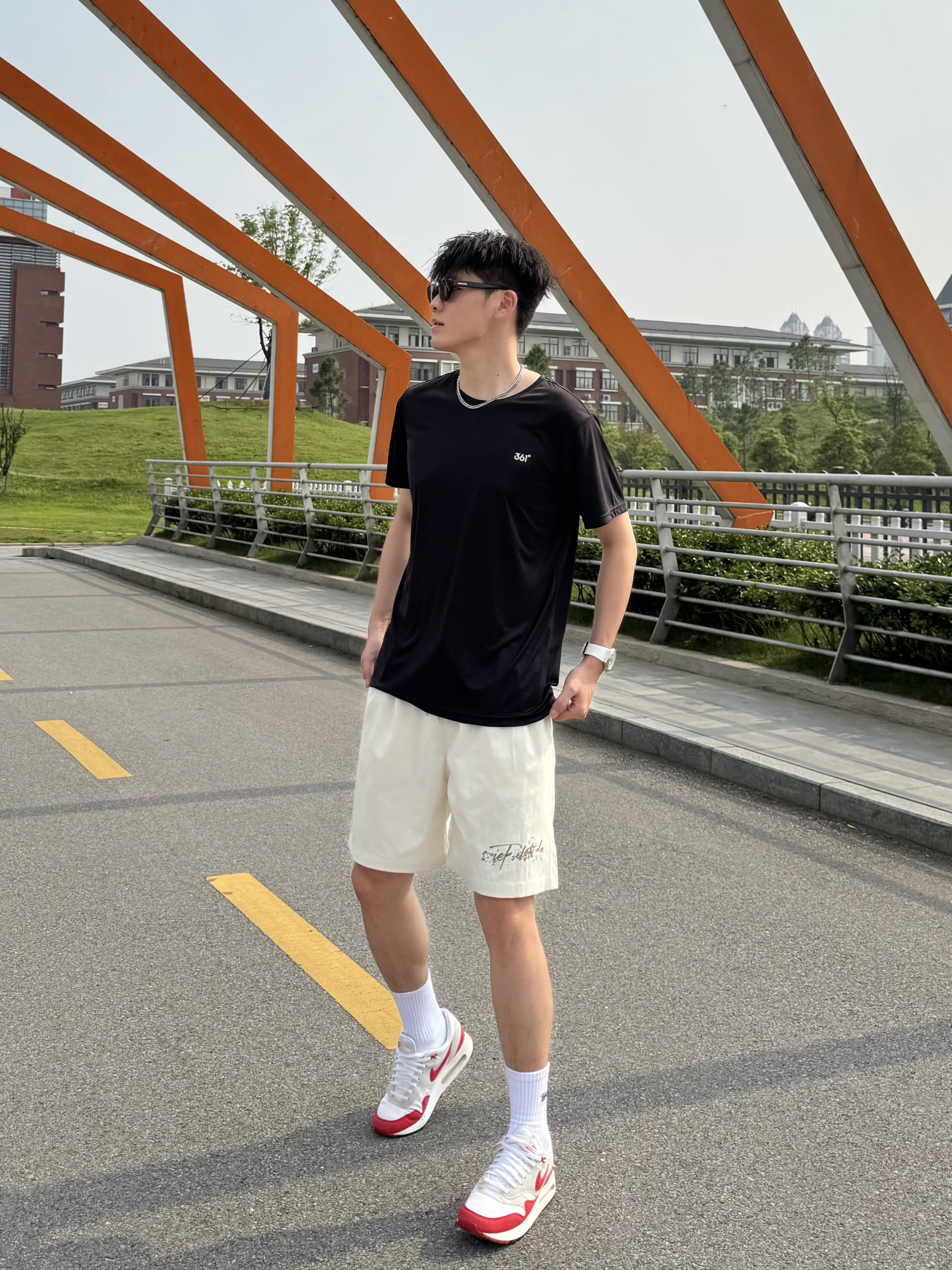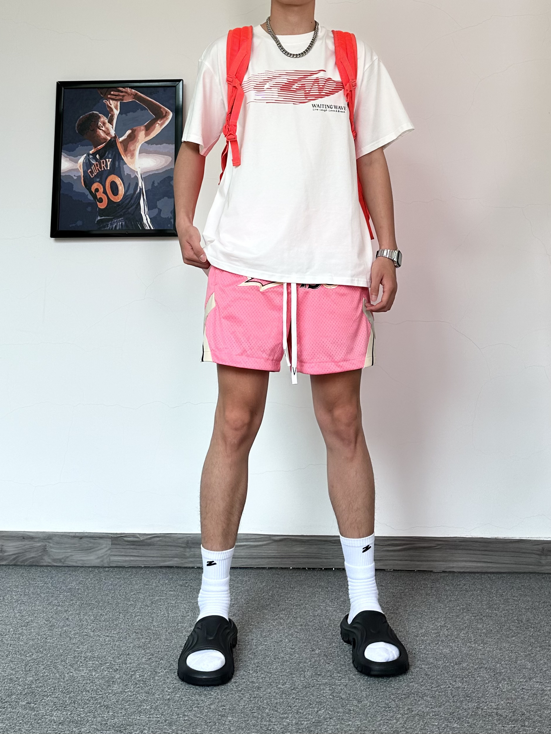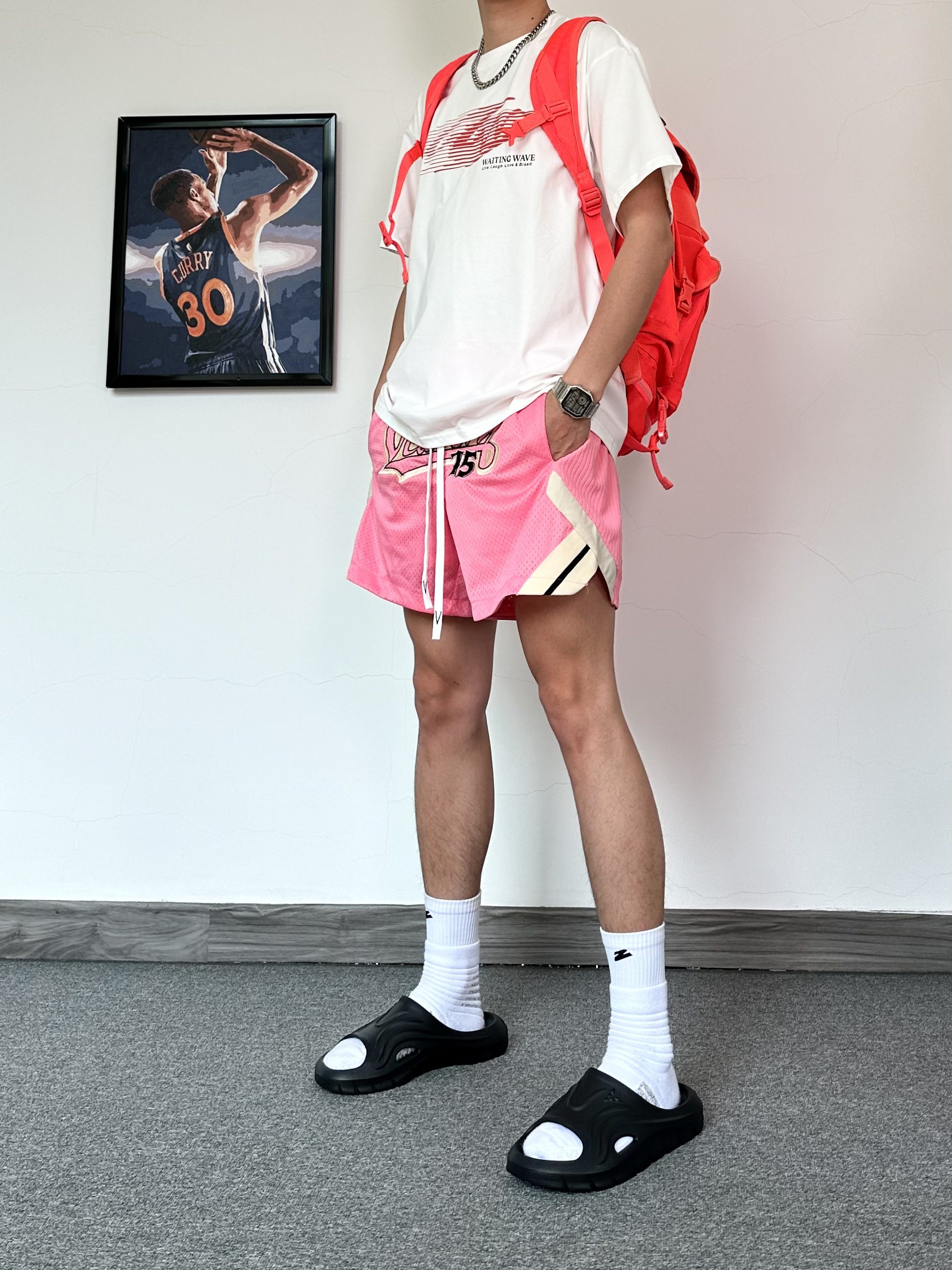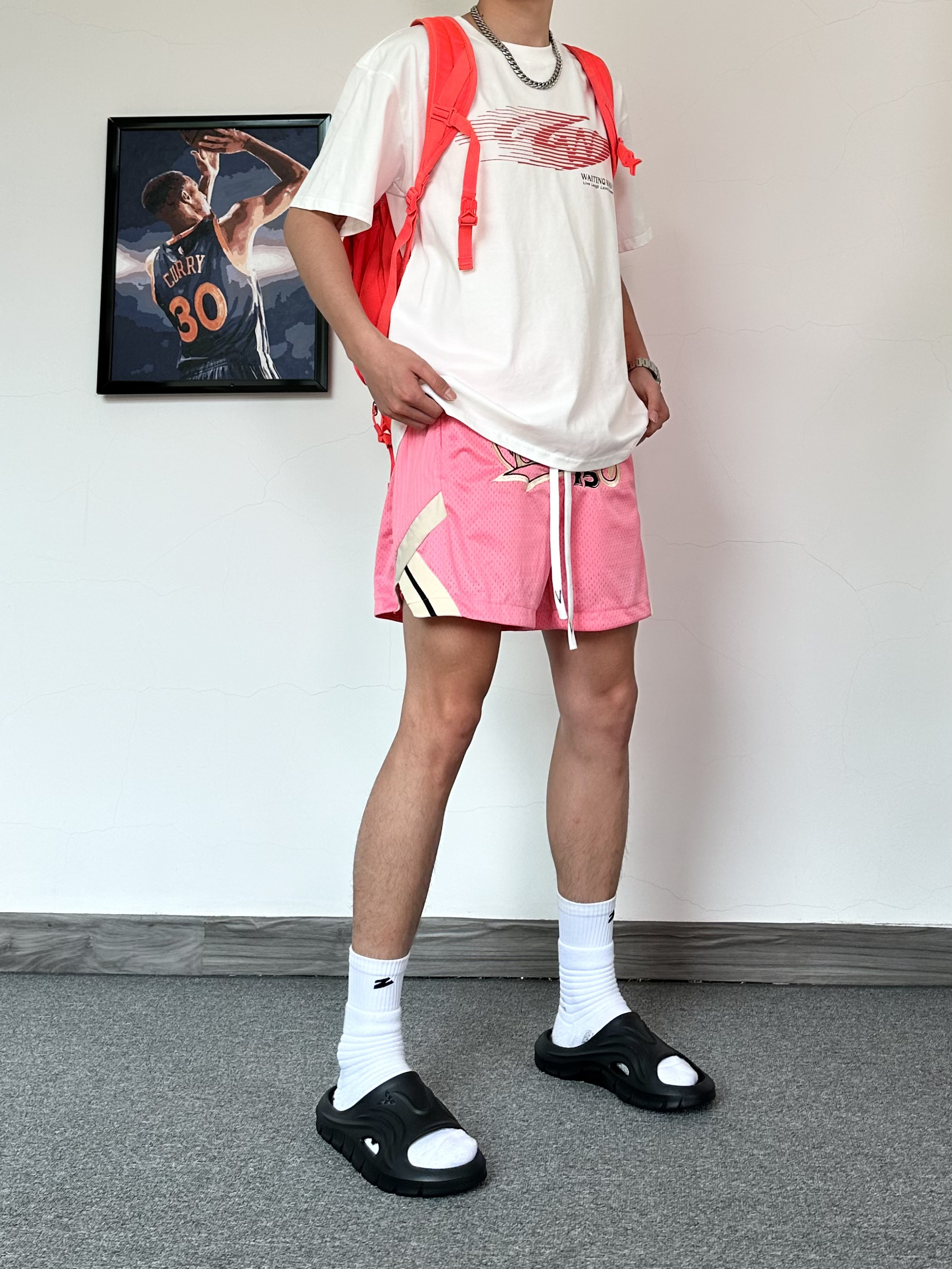 还是钟爱运动风格 上身一件白红配色T恤 简约的风格太喜欢啦 搭配复古粉色运动短裤 再来一双黑色篮球拖鞋✨ 搭配袜子穿嘎嘎舒服!